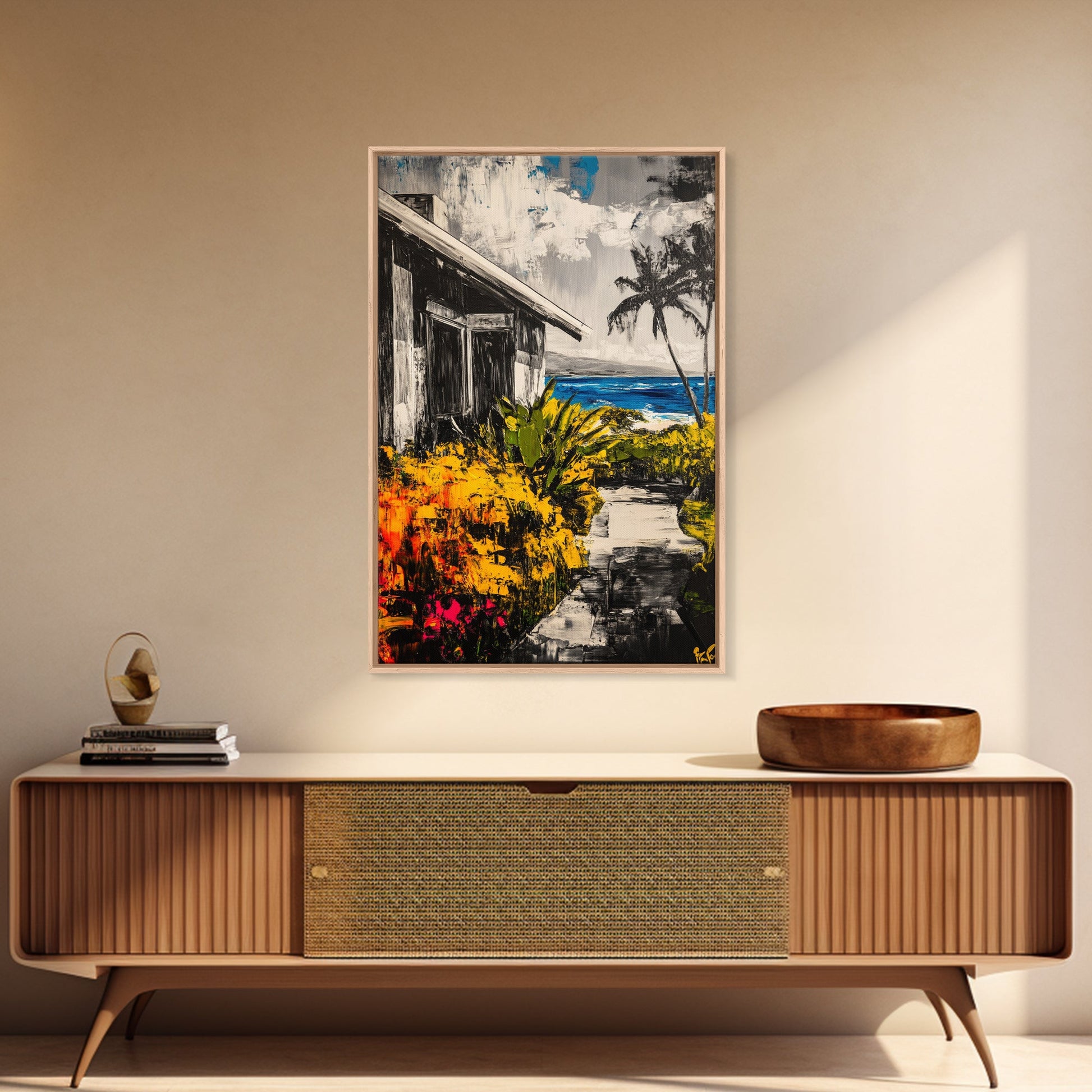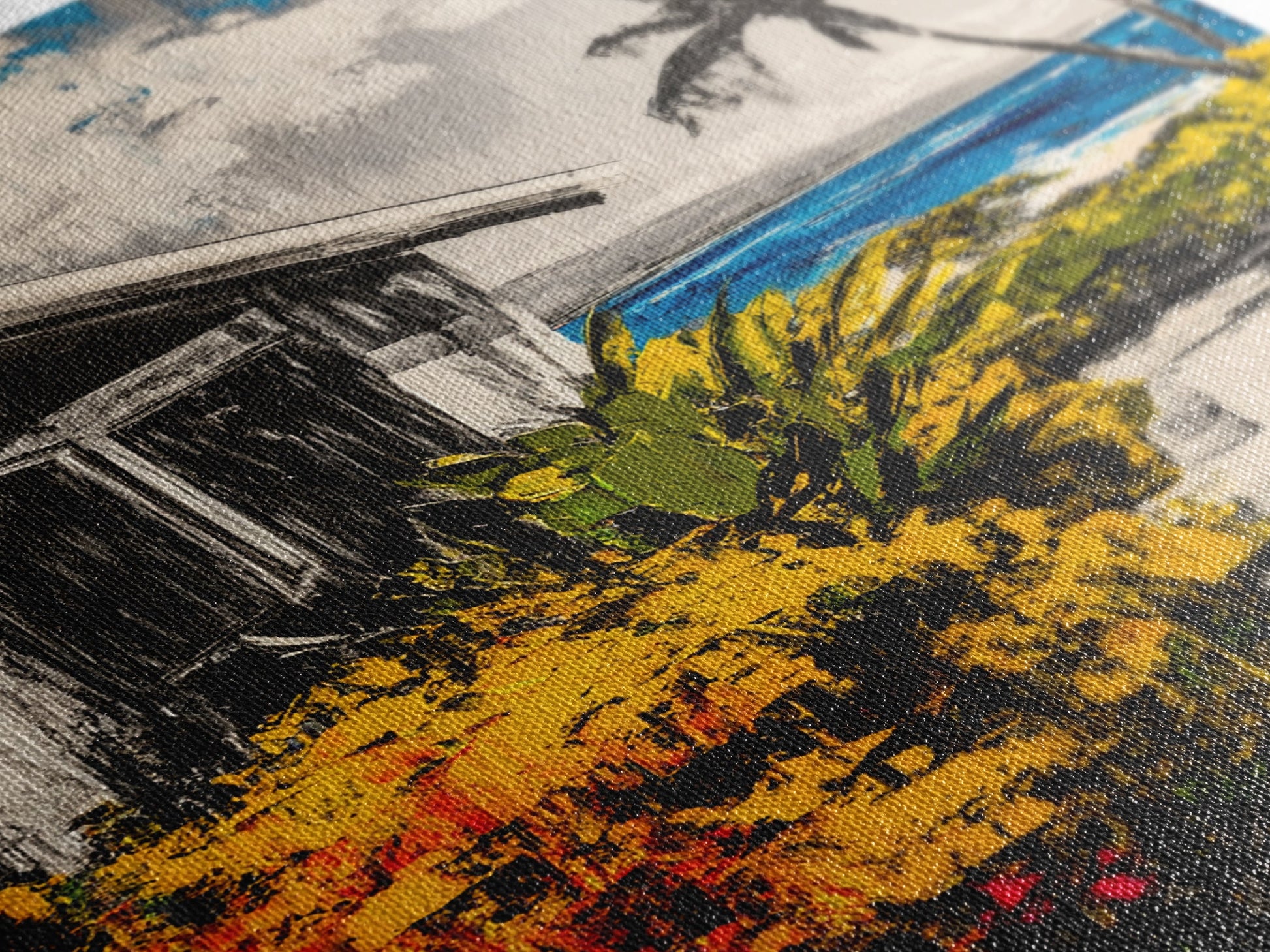 Beach House Path, Black White Coastal Art, Yellow Green Foliage, Tropical Landscape, Ocean Wall Decor, Beach Home, Framed Canvas Print