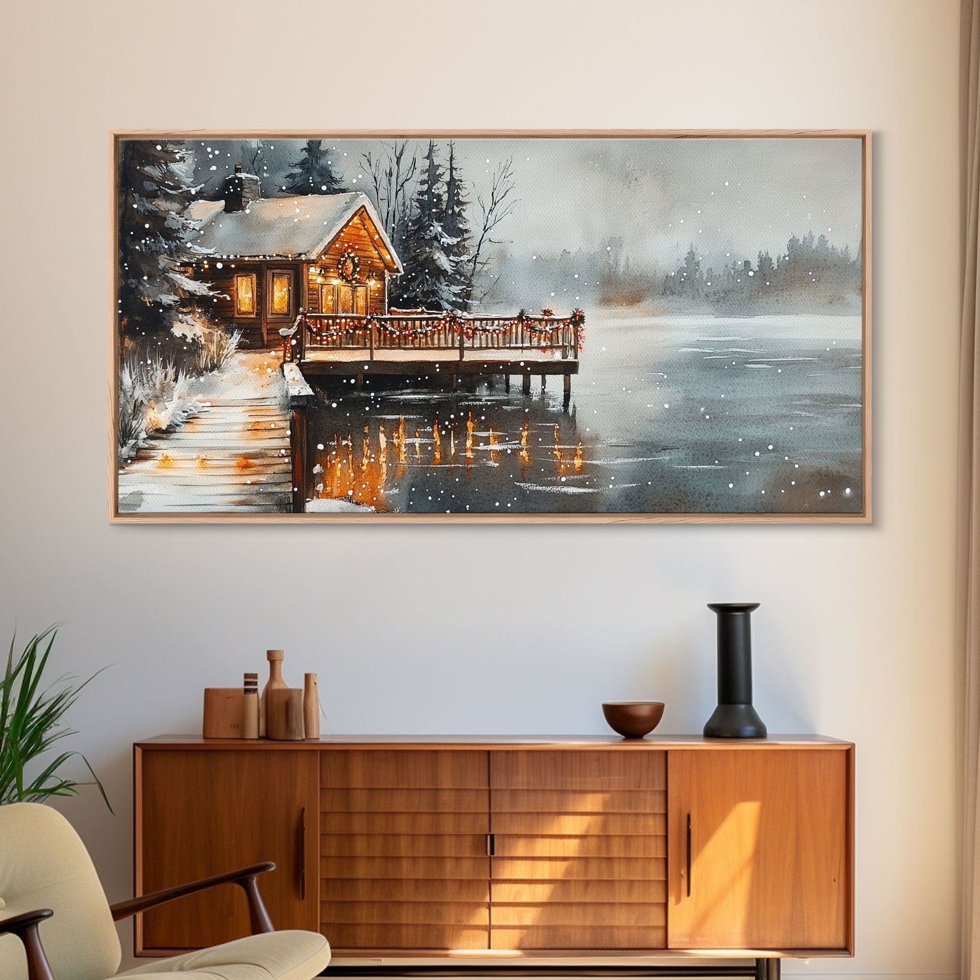 Beach house porch with Christmas garland and seashells, Framed Canvas Print festive tropical decorations, perfect coastal Christmas wall art