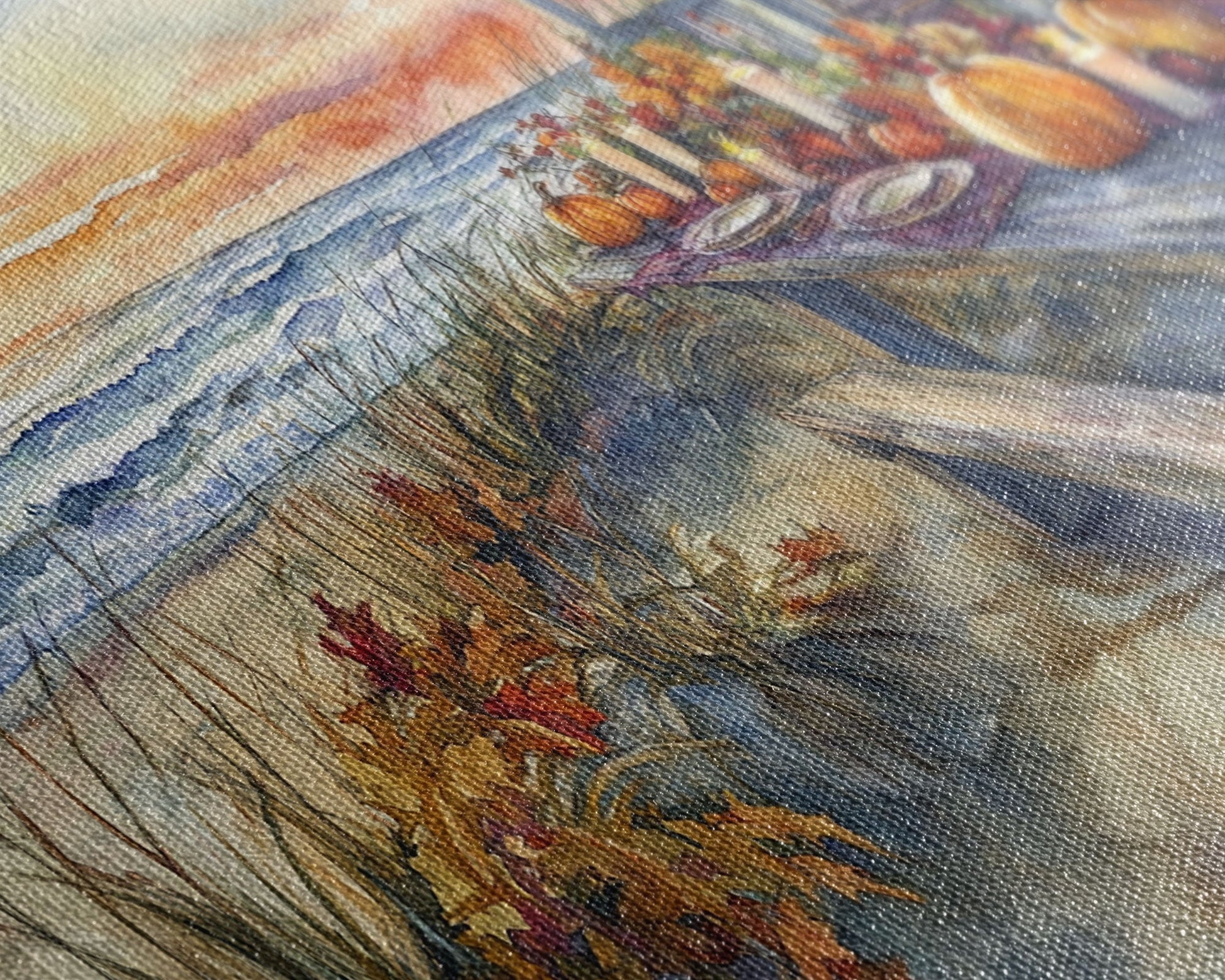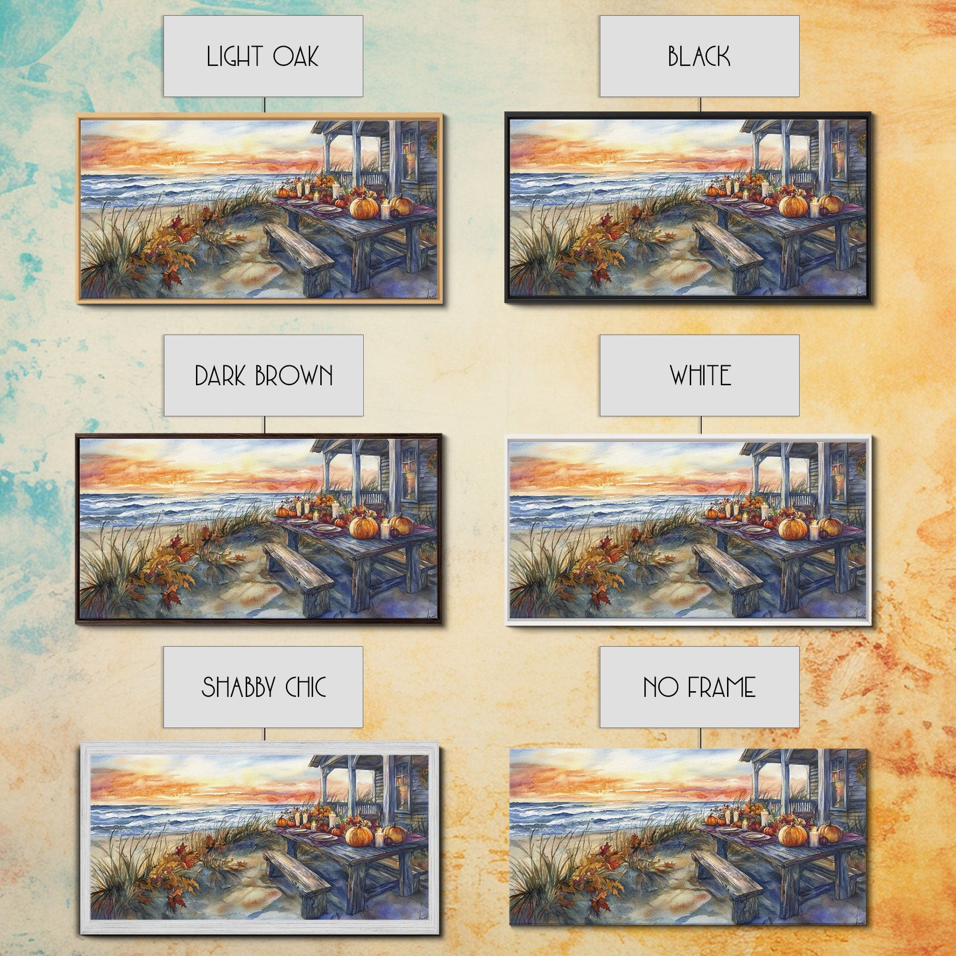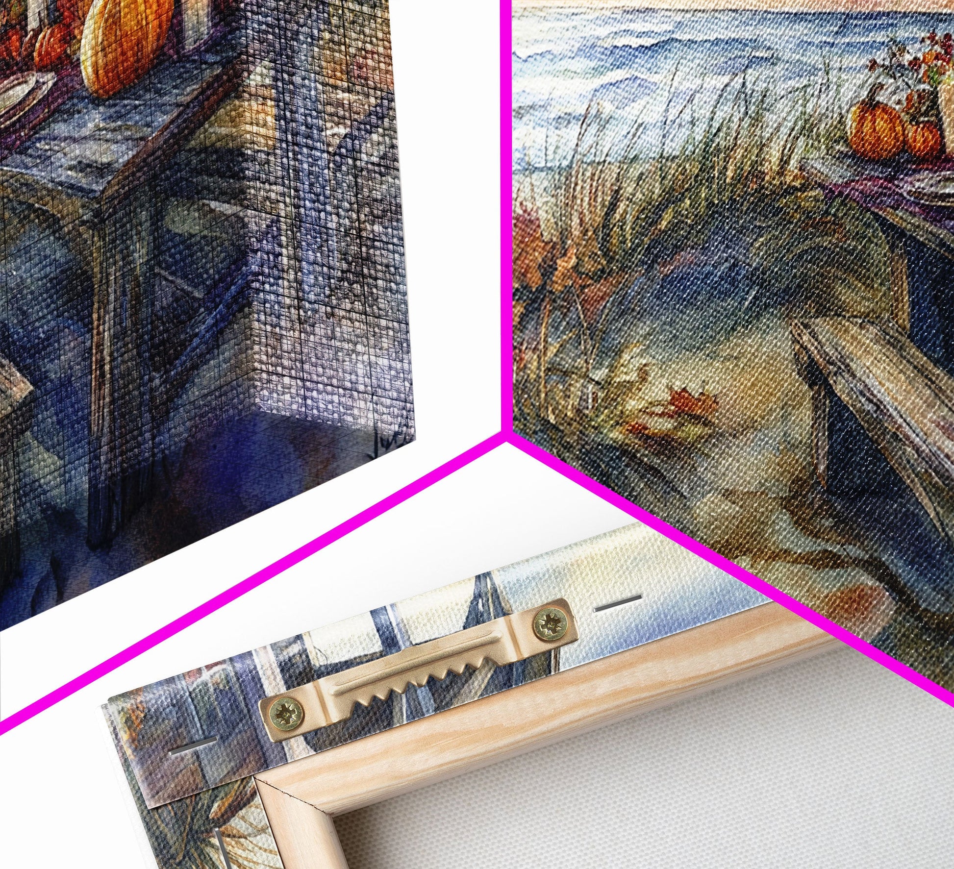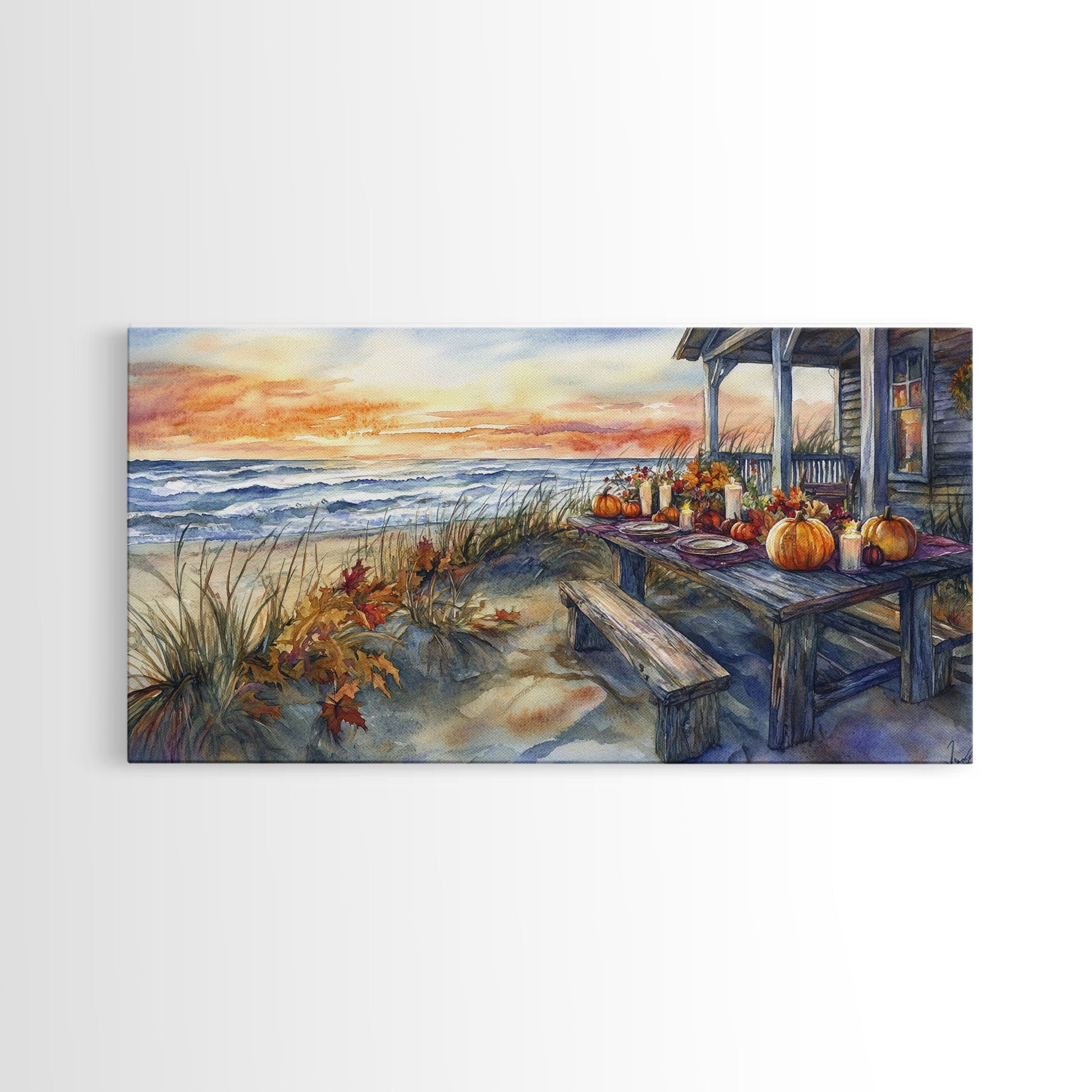 Beach Thanksgiving Table Pumpkins Canvas Print Fall Beach Decor Autumn Coastal Wall Art Framed Canvas Print Seasonal Wall Art
