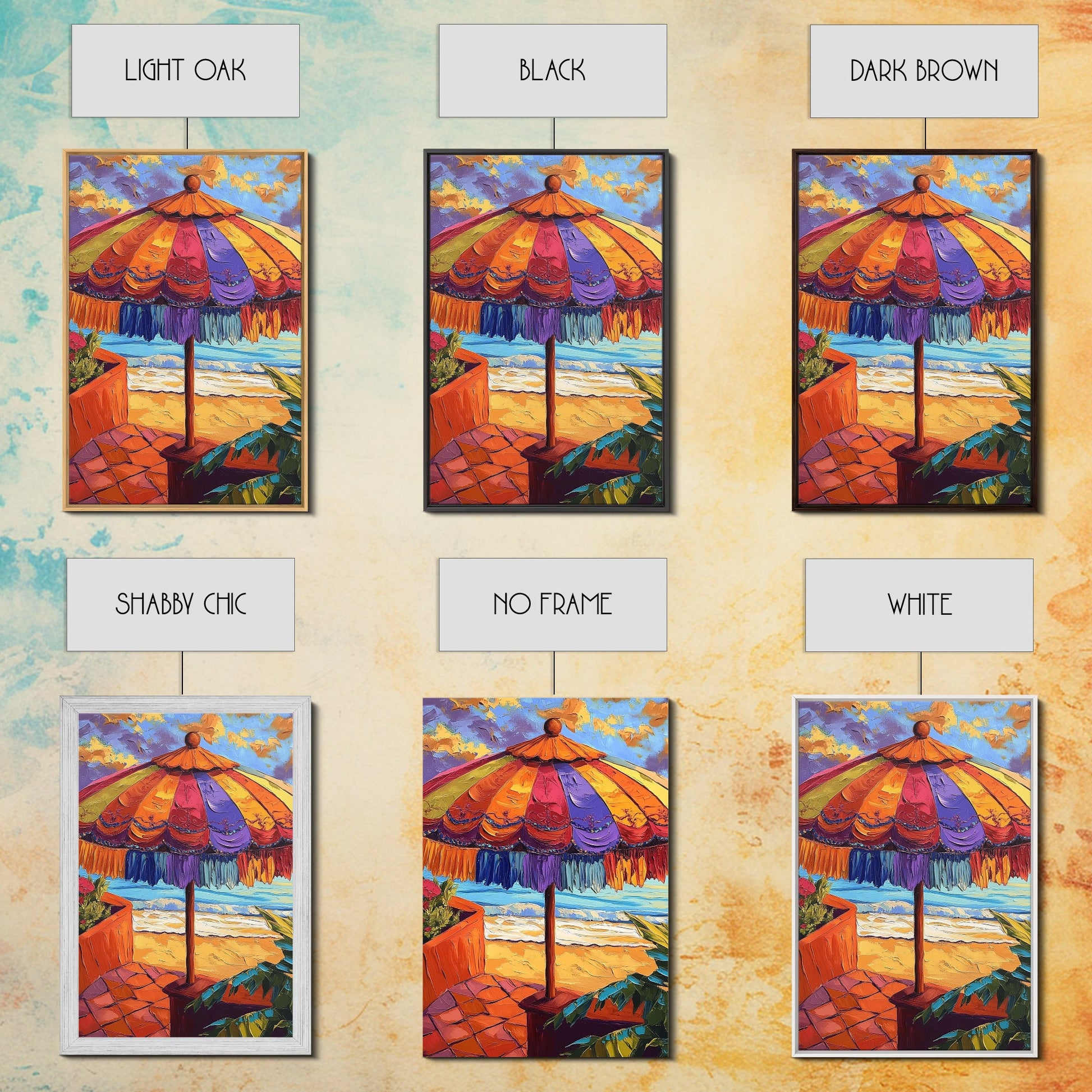 Beach Umbrella, Sunset, Framed Canvas Print, Tropical boho art, patio decor, summer beach vibe, colorful wall art, sunroom accent piece