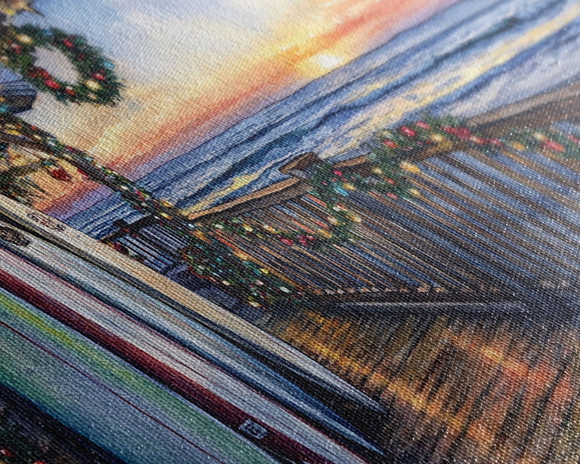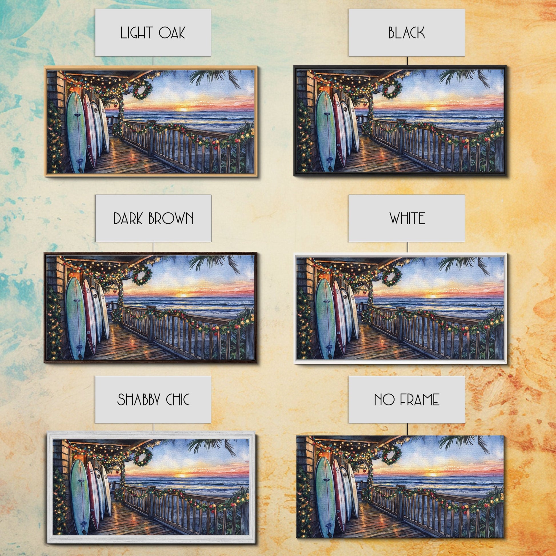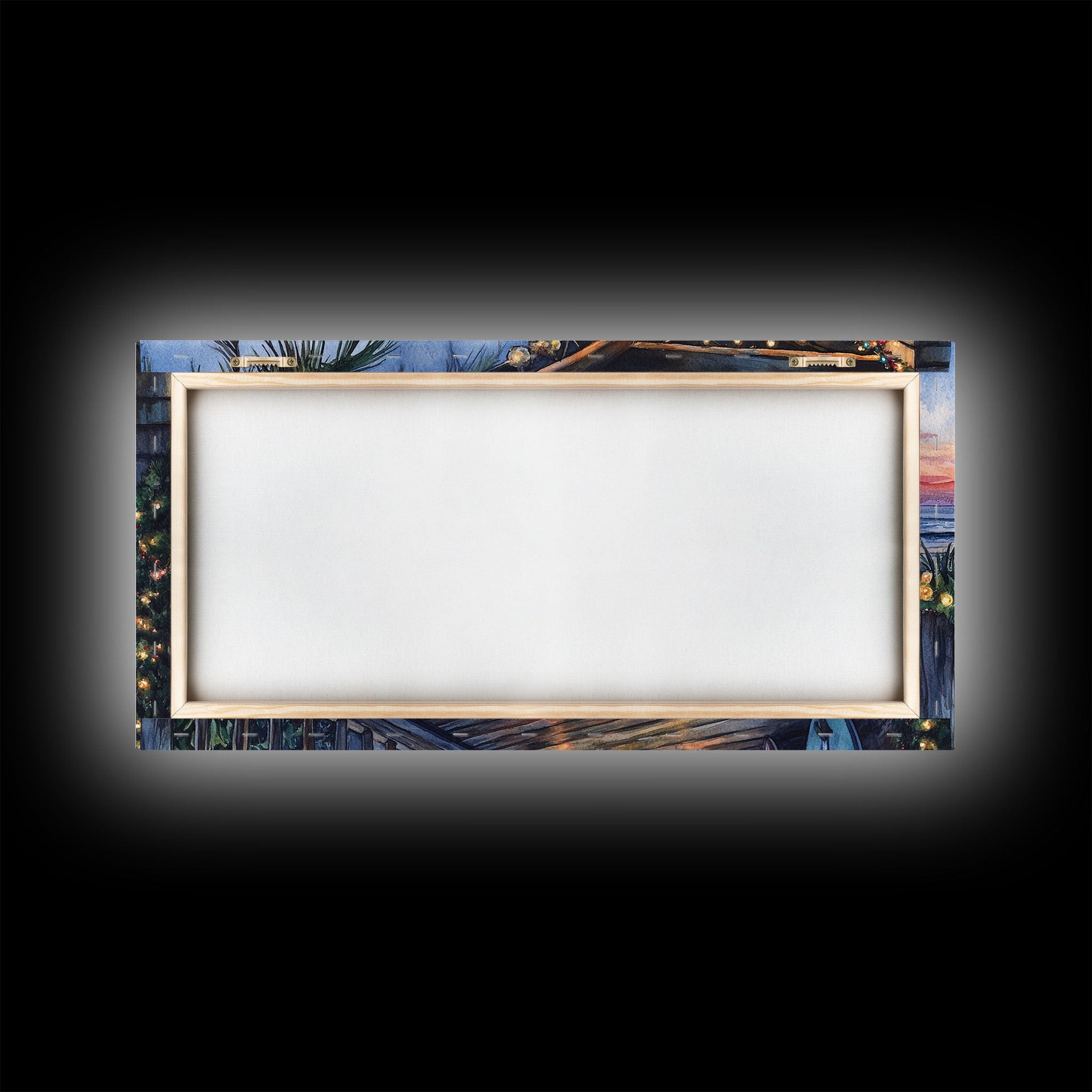 Beachfront porch with surfboards and Christmas lights, Framed Canvas Print with wreaths festive lights, coastal holiday wall art and decor