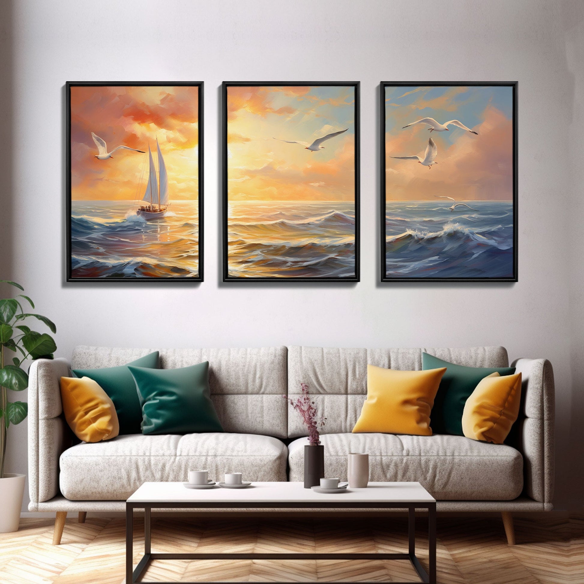 Beautiful Ocean At Sunset 3 Piece Canvas Print Wall Art, Above Sofa, Abstract Art, Modern Art, Minimalism Lakehouse Decor