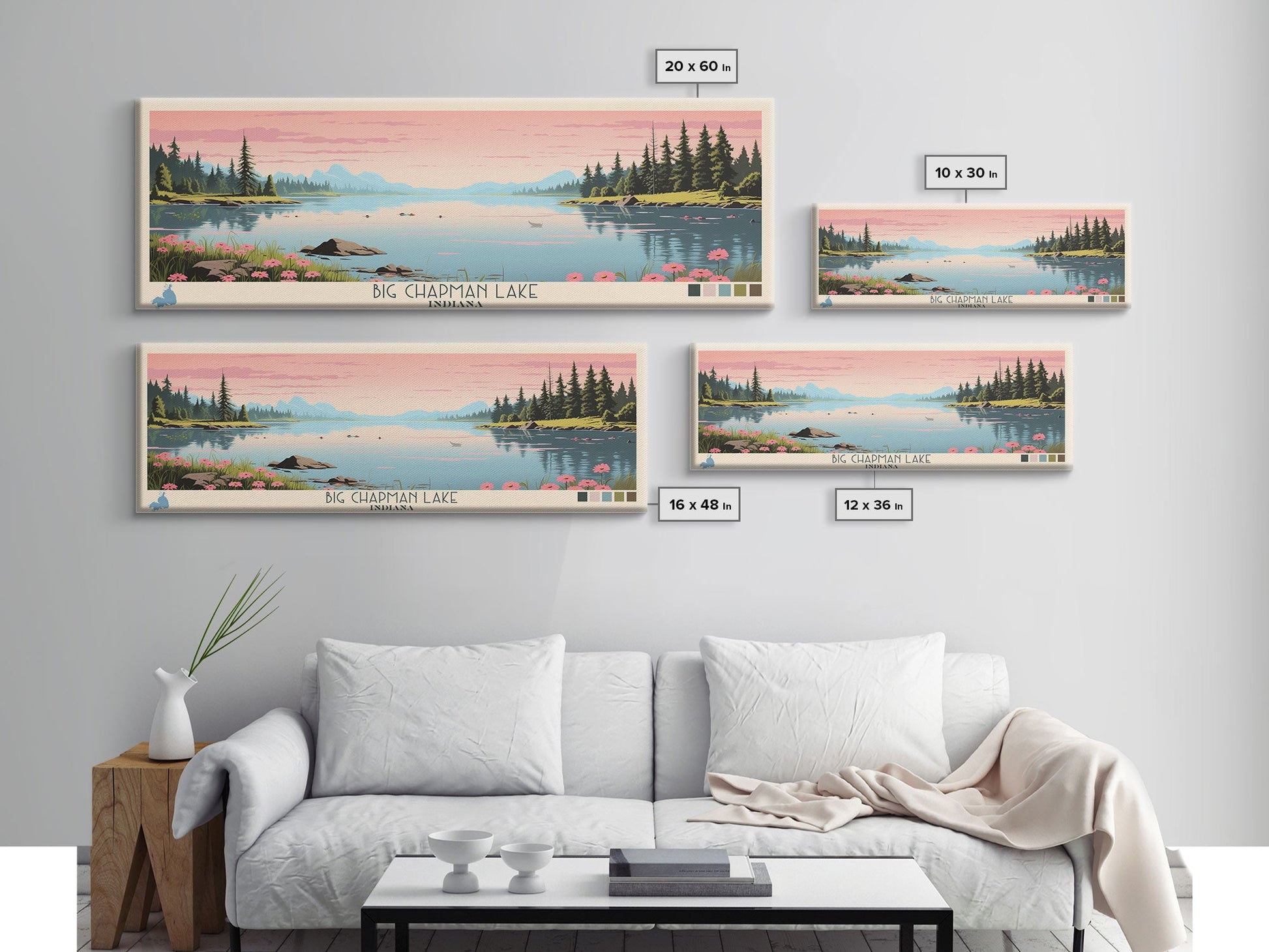 Big Chapman Lake Indiana Framed Canvas Print, Panoramic Travel Poster, Midcentury Modern Wall Art, Pop Art, Nature Lake House Art, Bedroom Decor