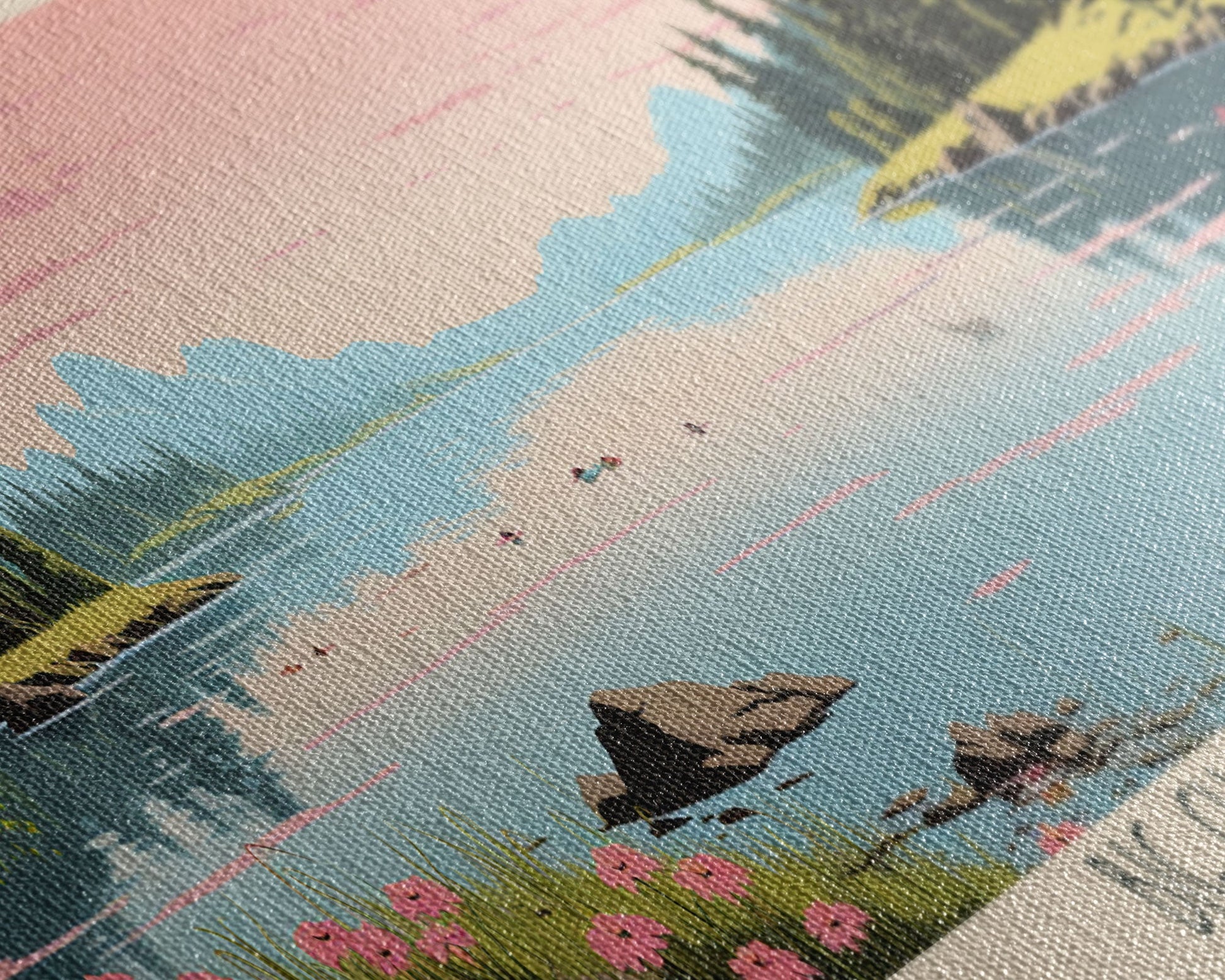 Most of our canvases are made in the USA, with the exception of canvases ordered with the light oak unstained frames, and any large canvases (24x48, 30x60, 16x48 and 20x60) ordered WITH a frame. These are temporarily made in and shipped from Europe, while we try to find a more consistent supplier in the USA.