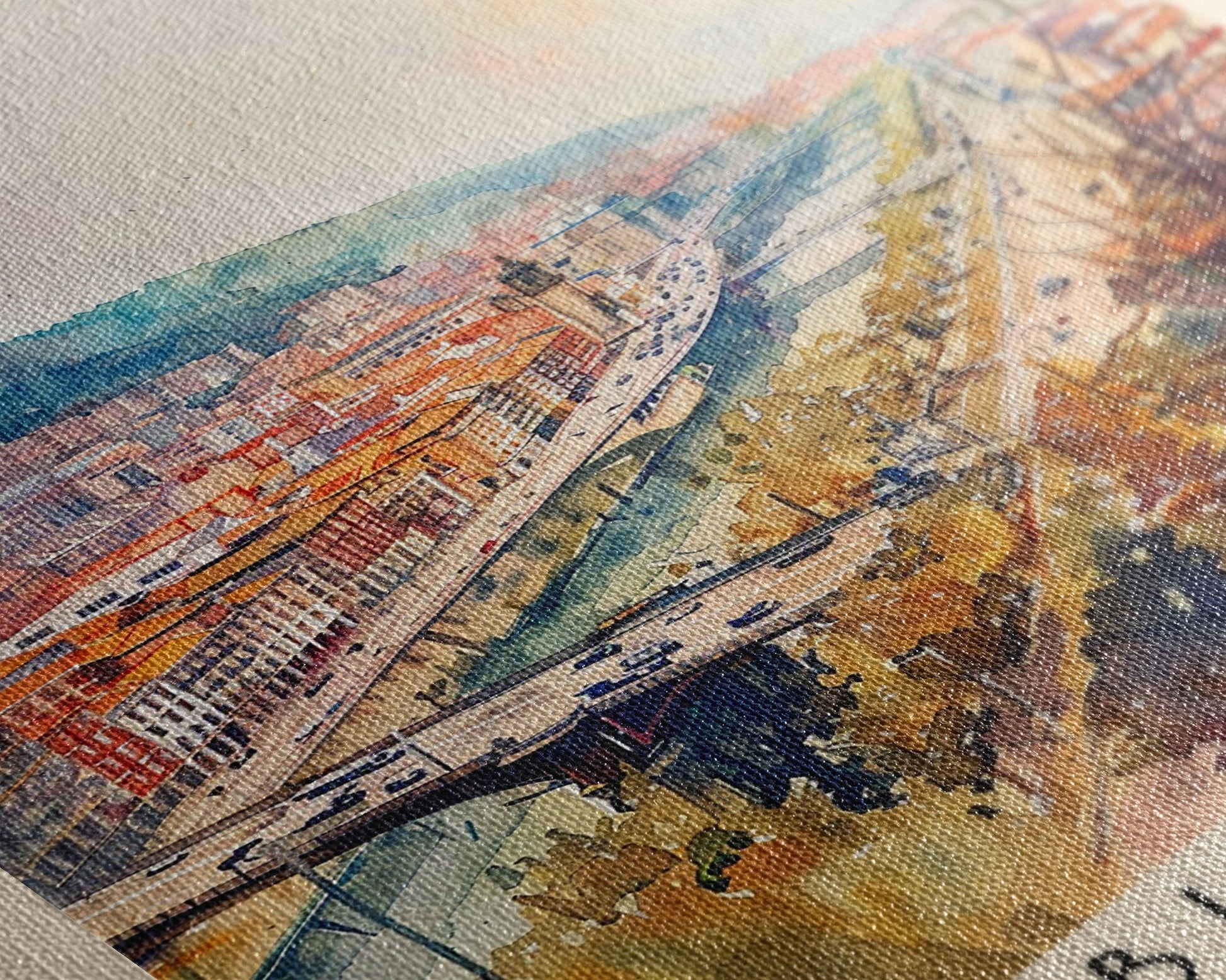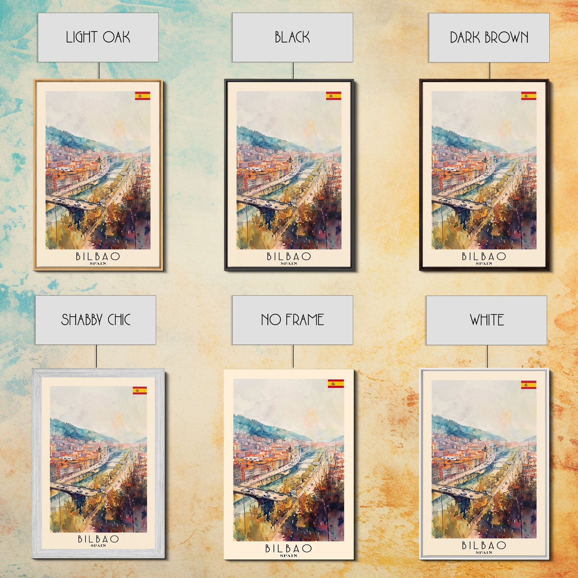 Bilbao Spain Travel Poster Framed Canvas Print, Watercolor Painting, Wall Art, Home Decor, Scenic Travel Print, Cityscape Art