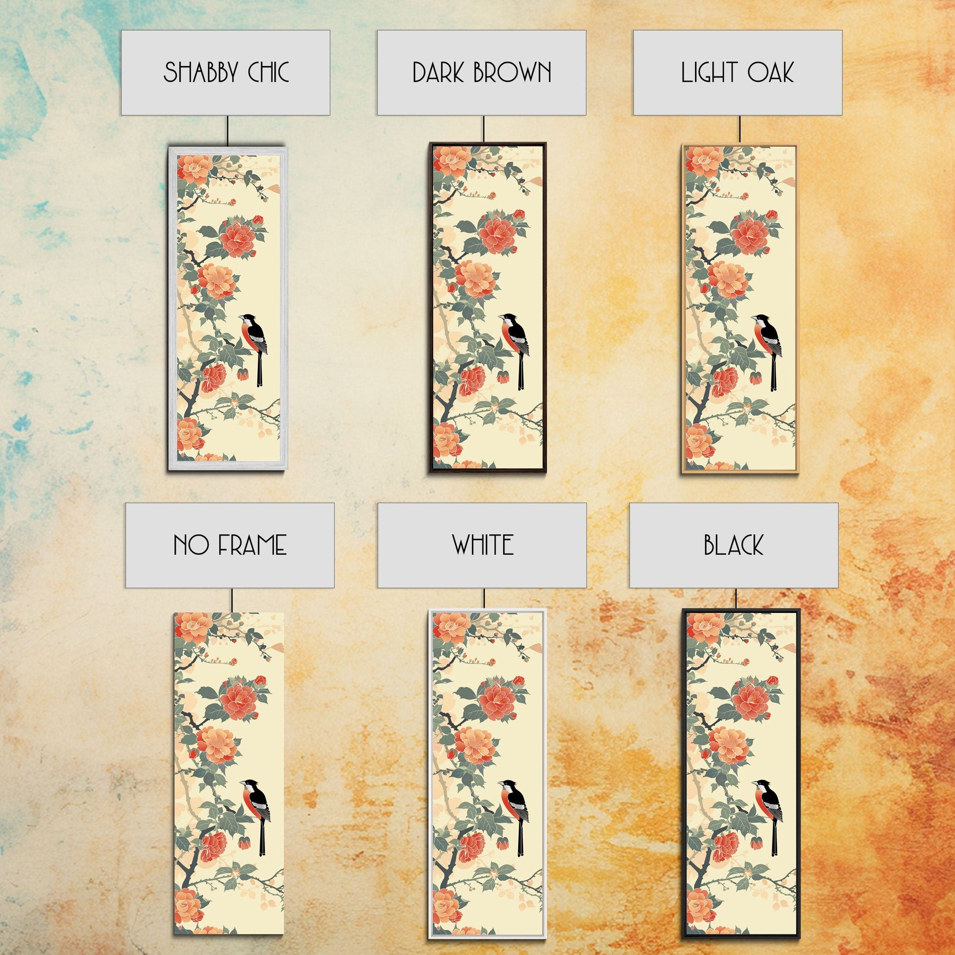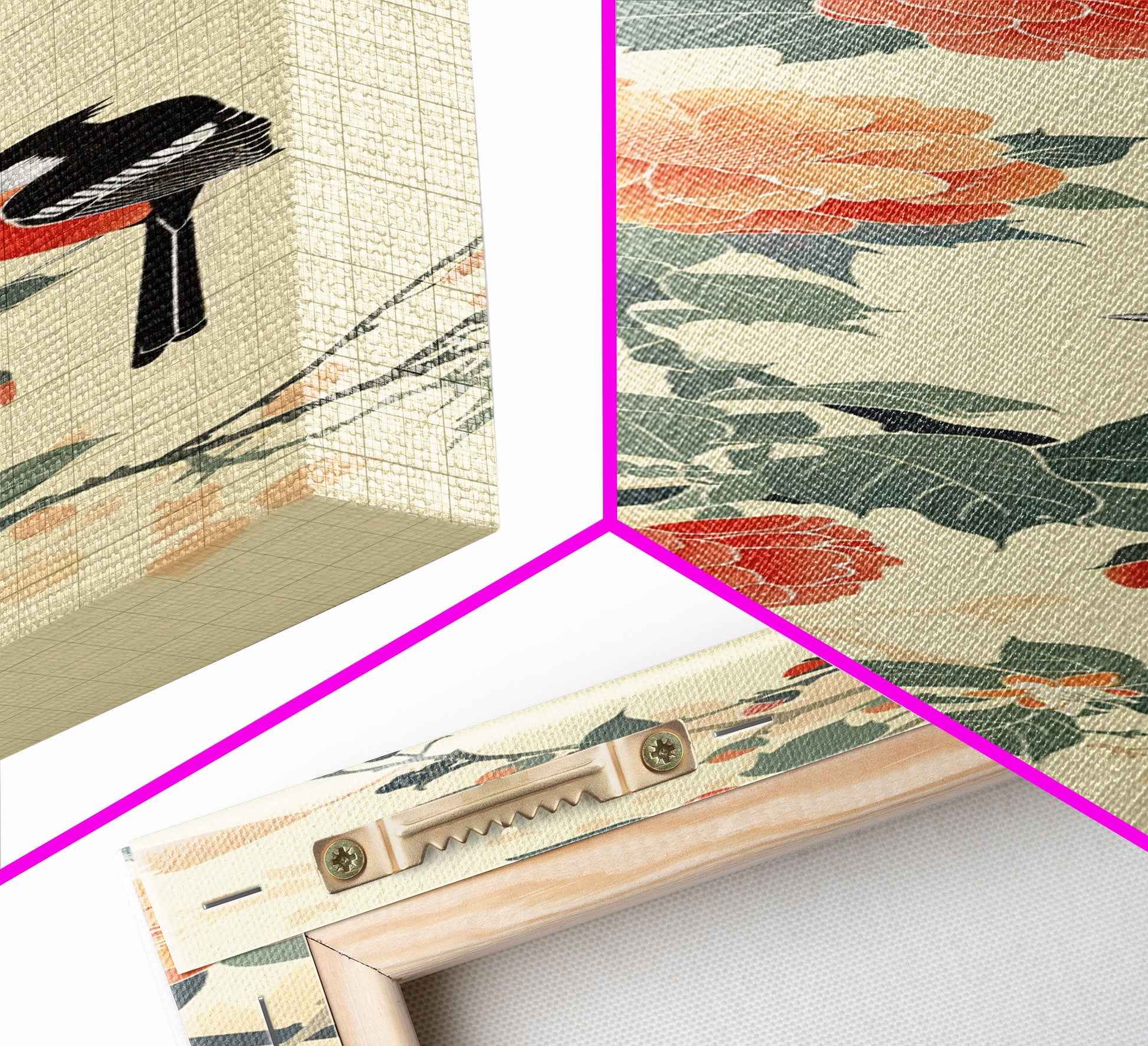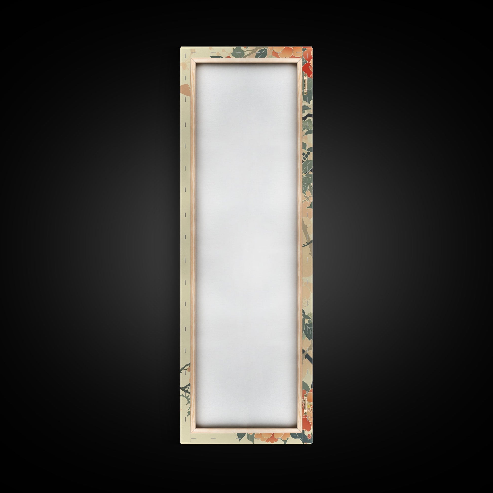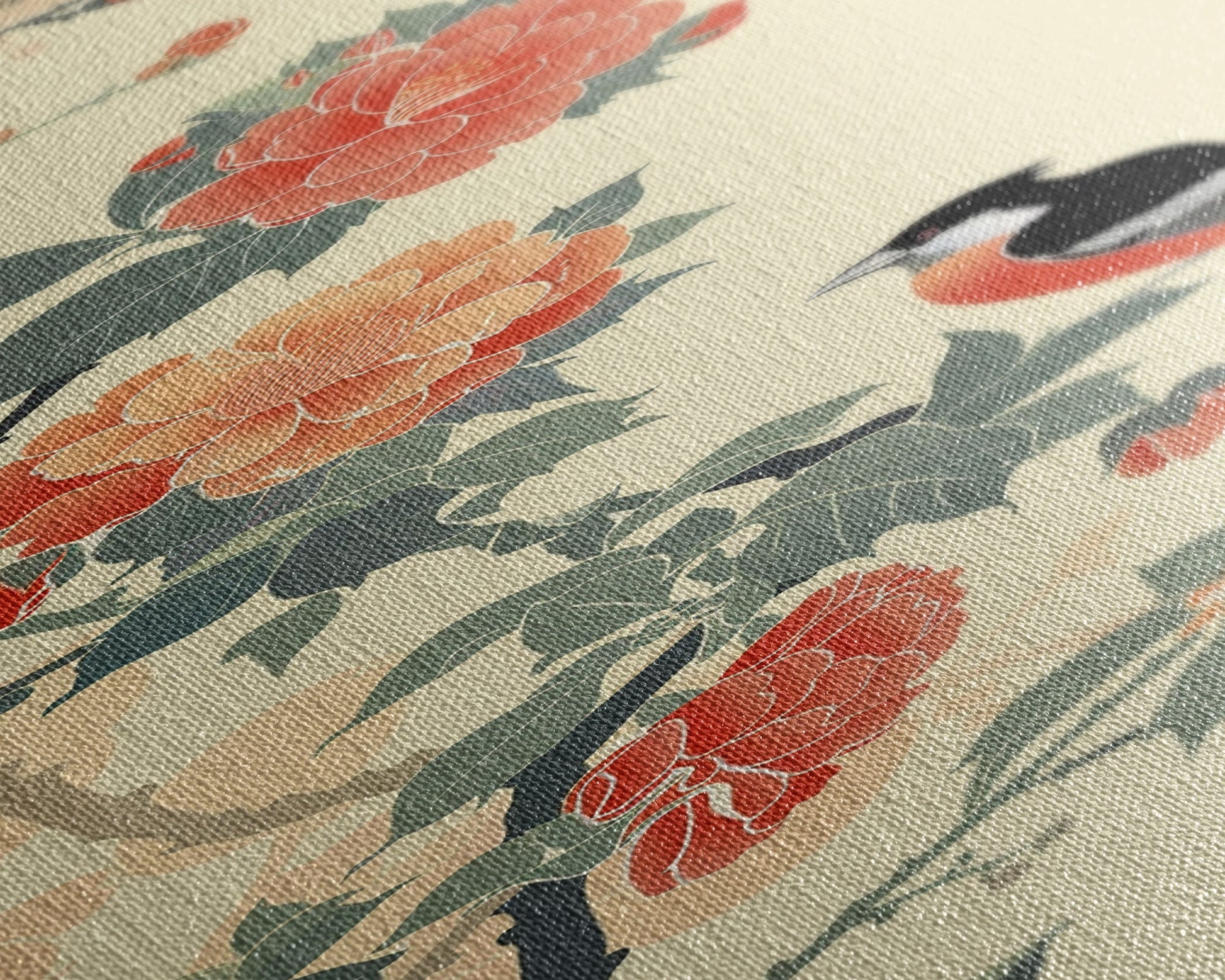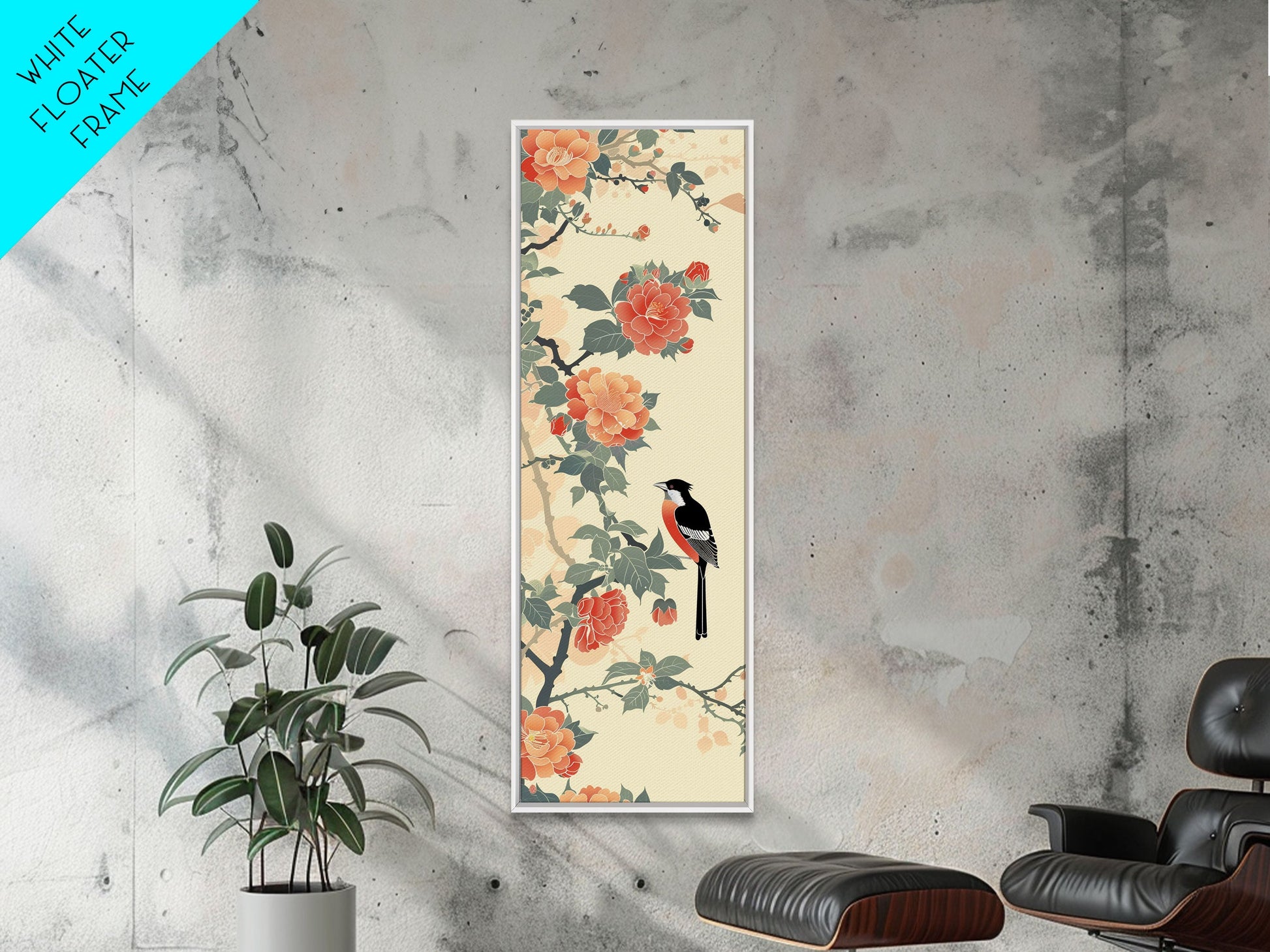Bird Among Camellia Flowers On Light Background Skinny Art Ukiyo-e Wood Block Print Framed Canvas Print