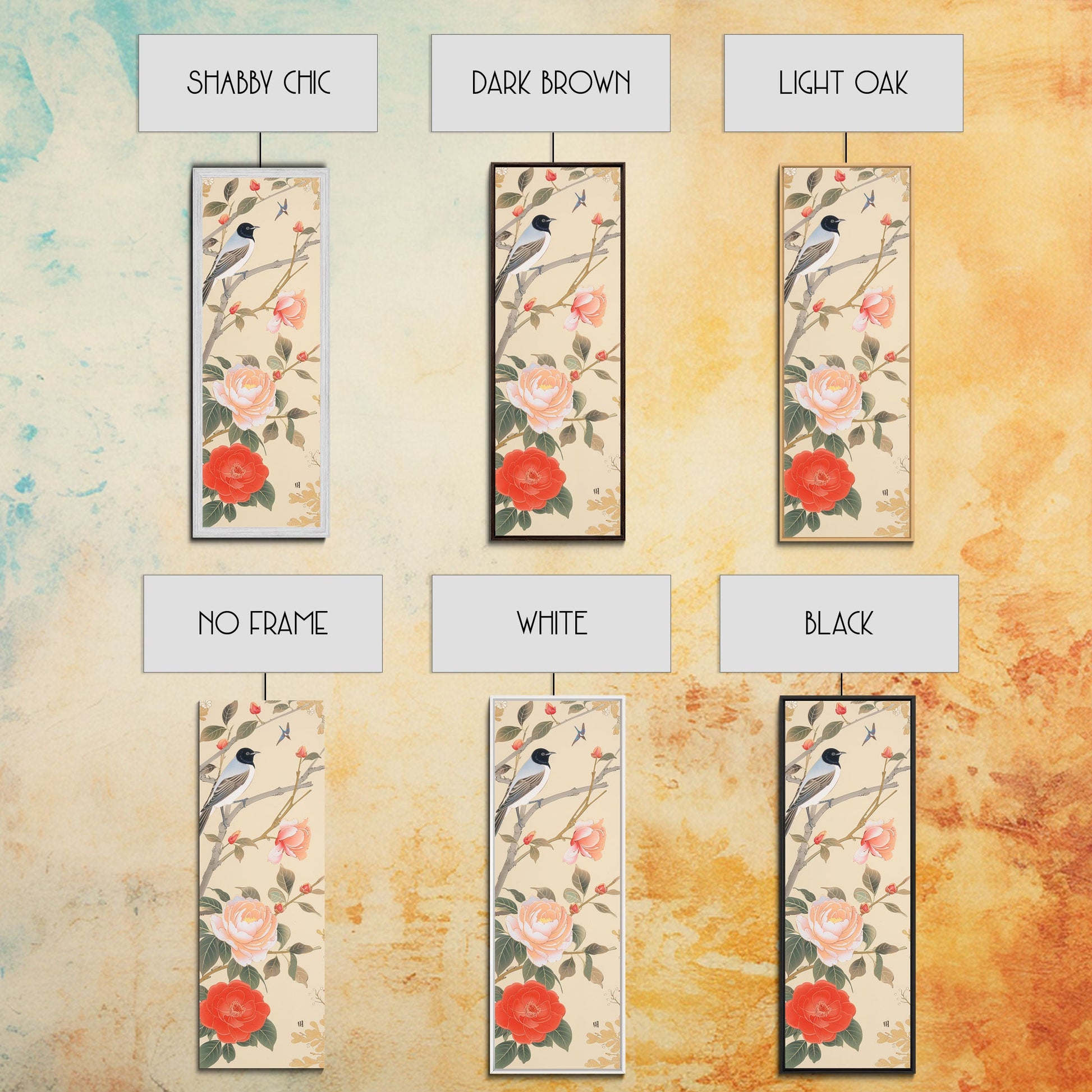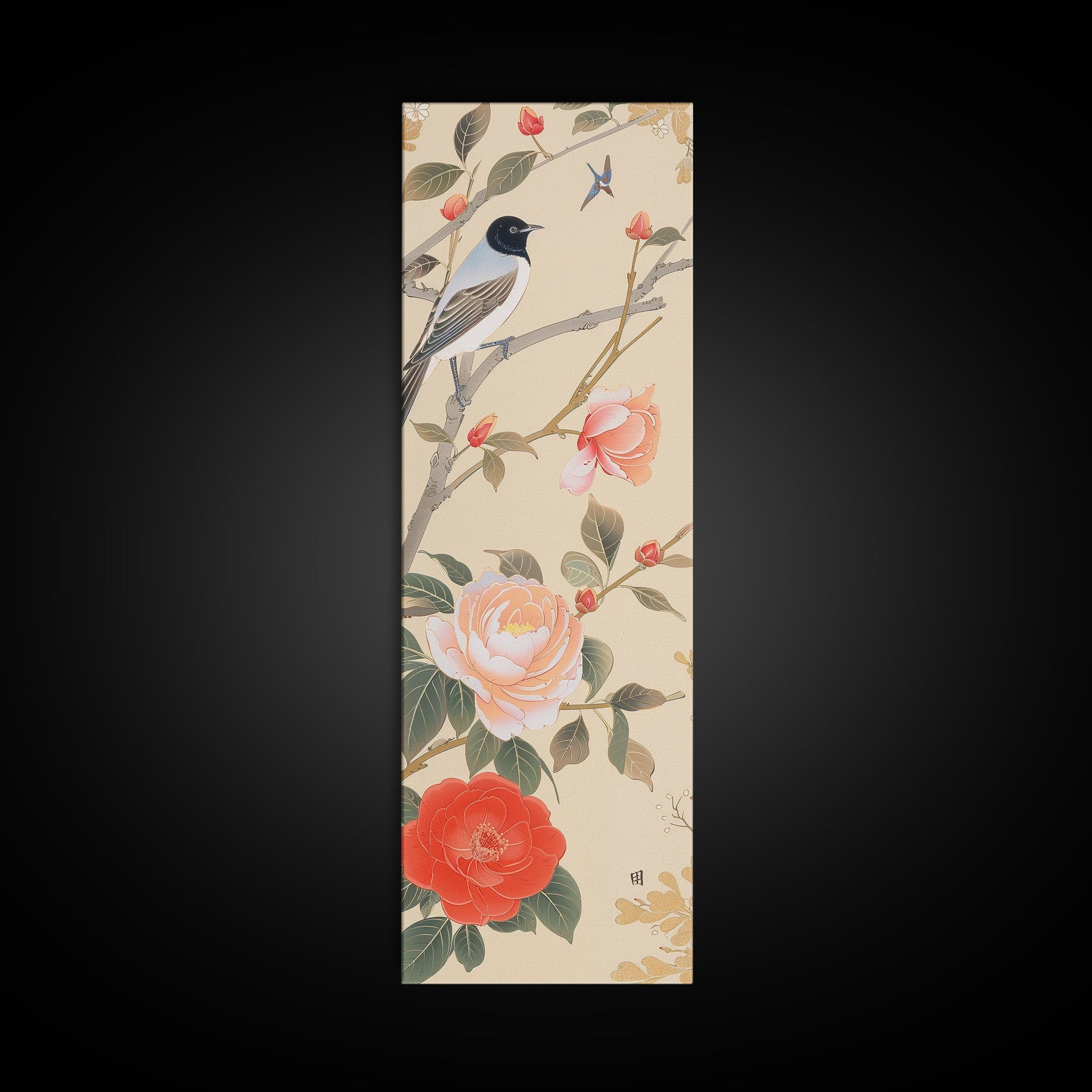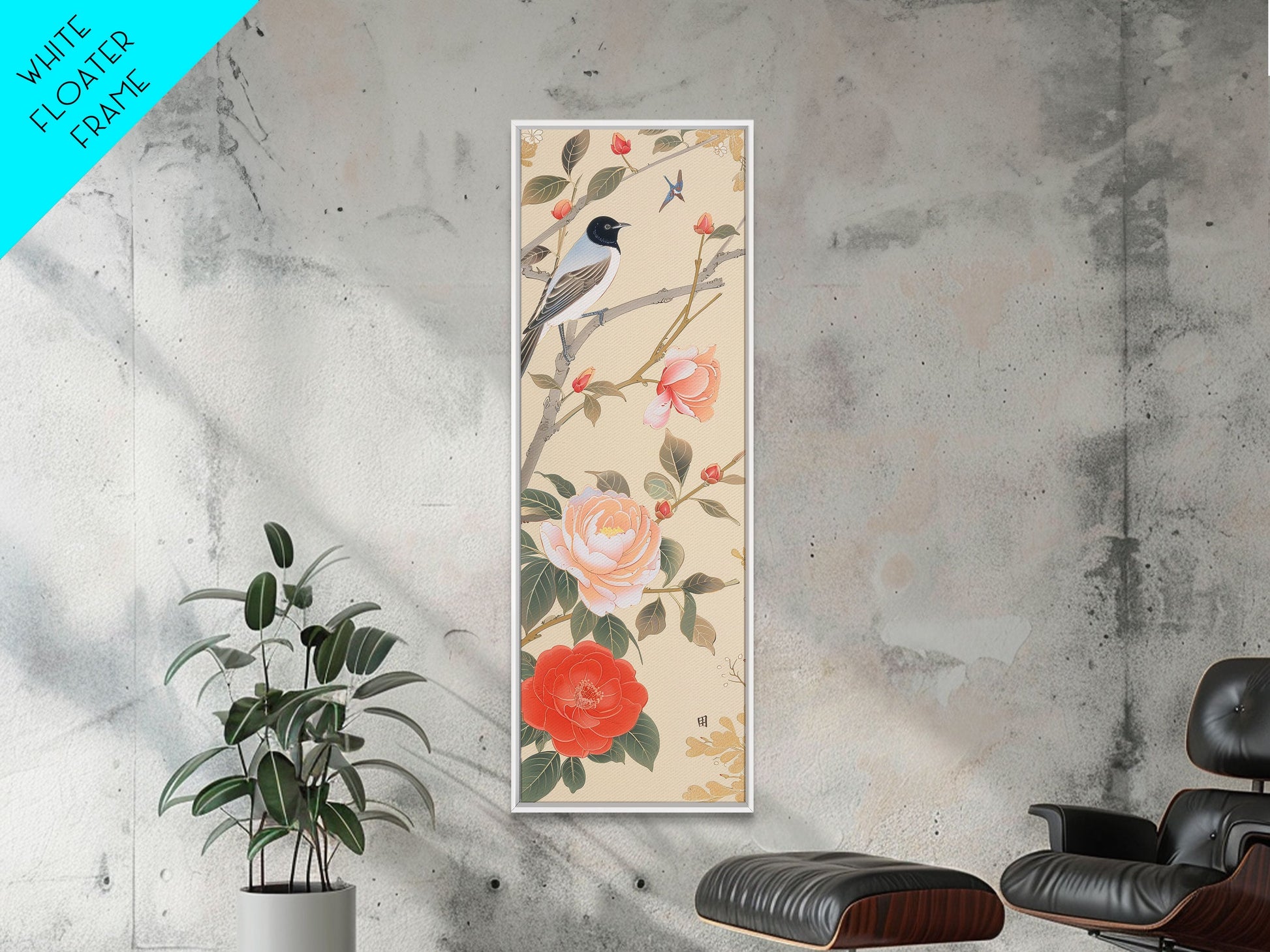 Bird On Branch With Red Peonies And Green Leaves Tall Art Skinny Art Framed Canvas Print Japanese Style Art Ukiyo-e Wood Block Print