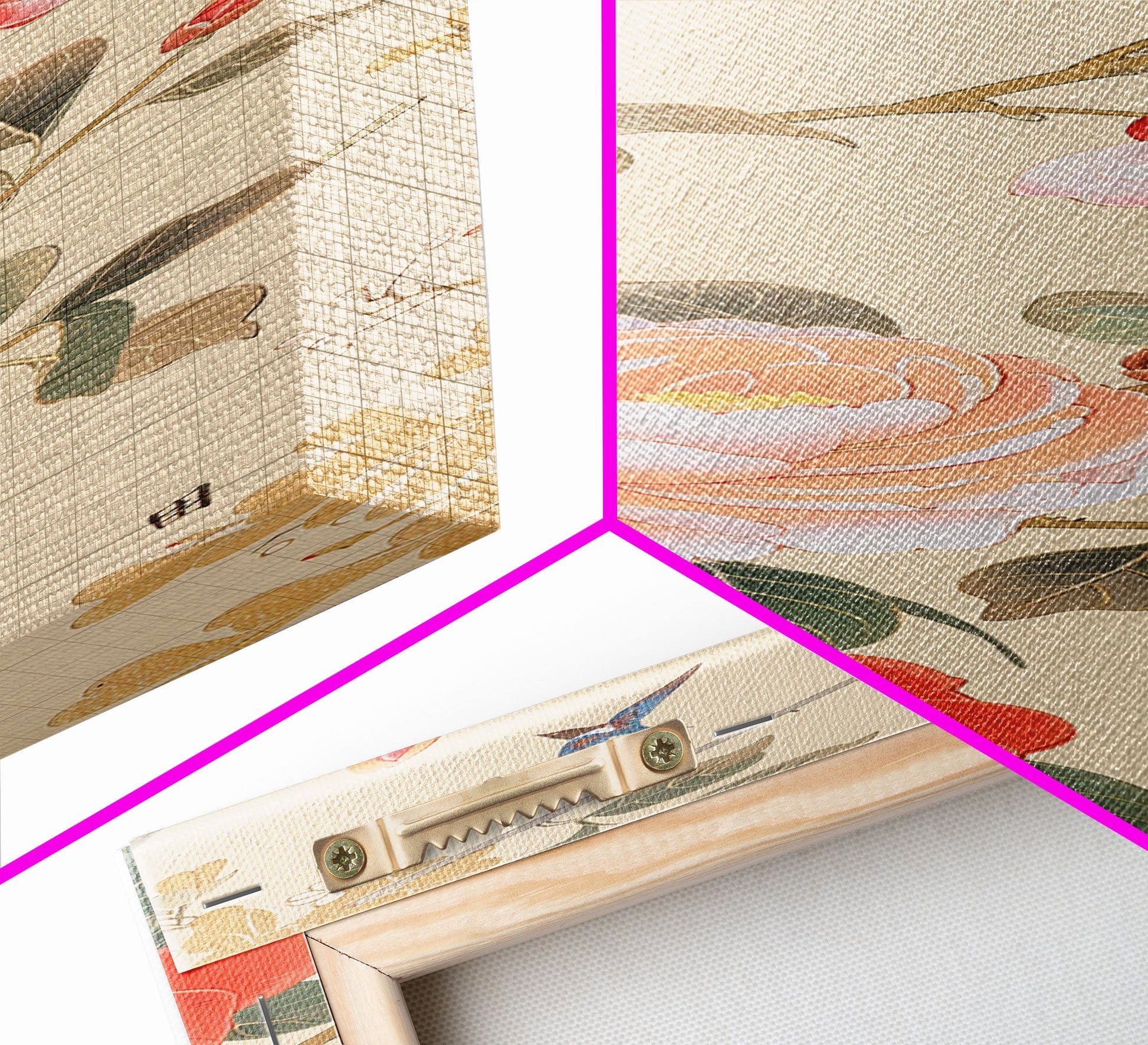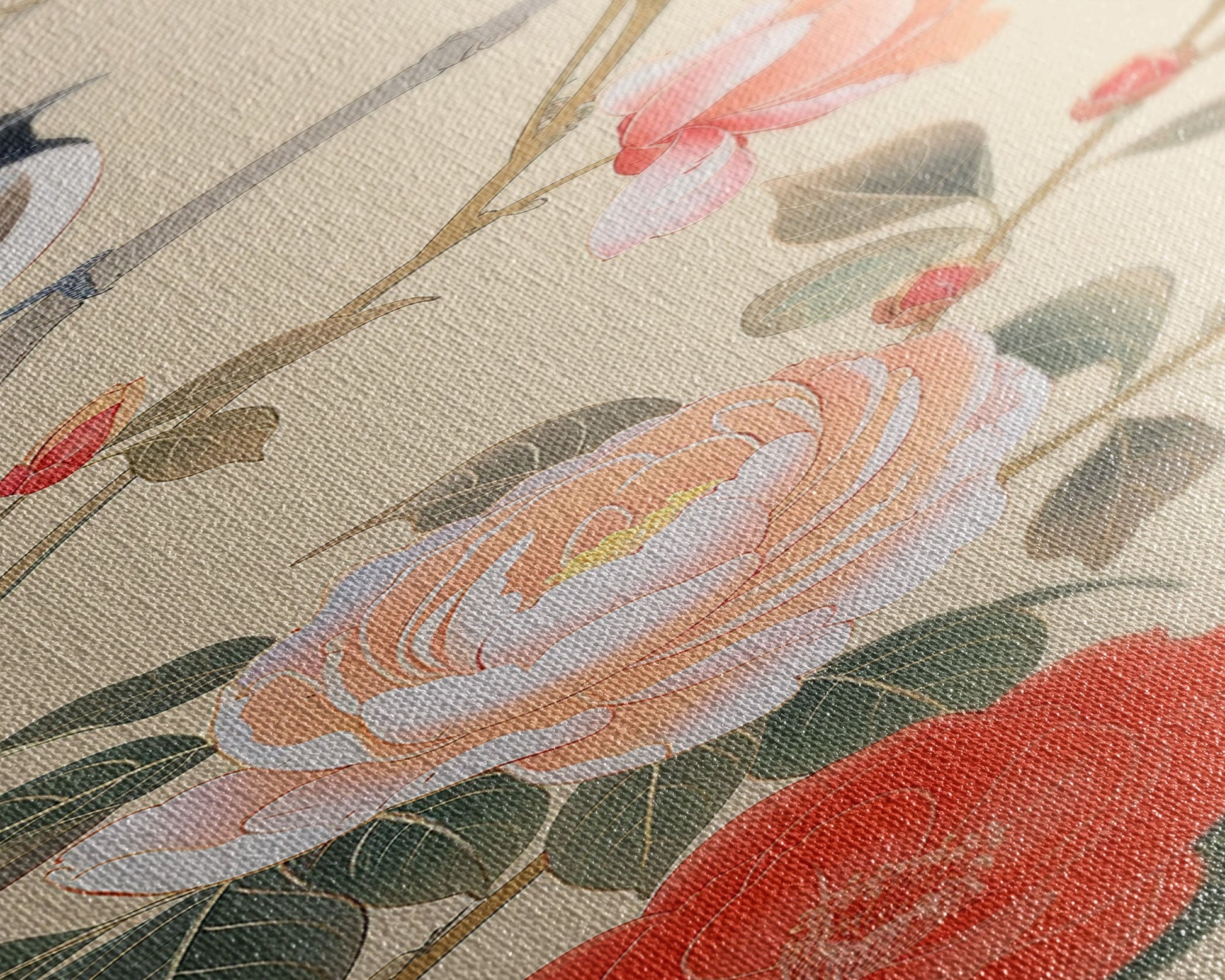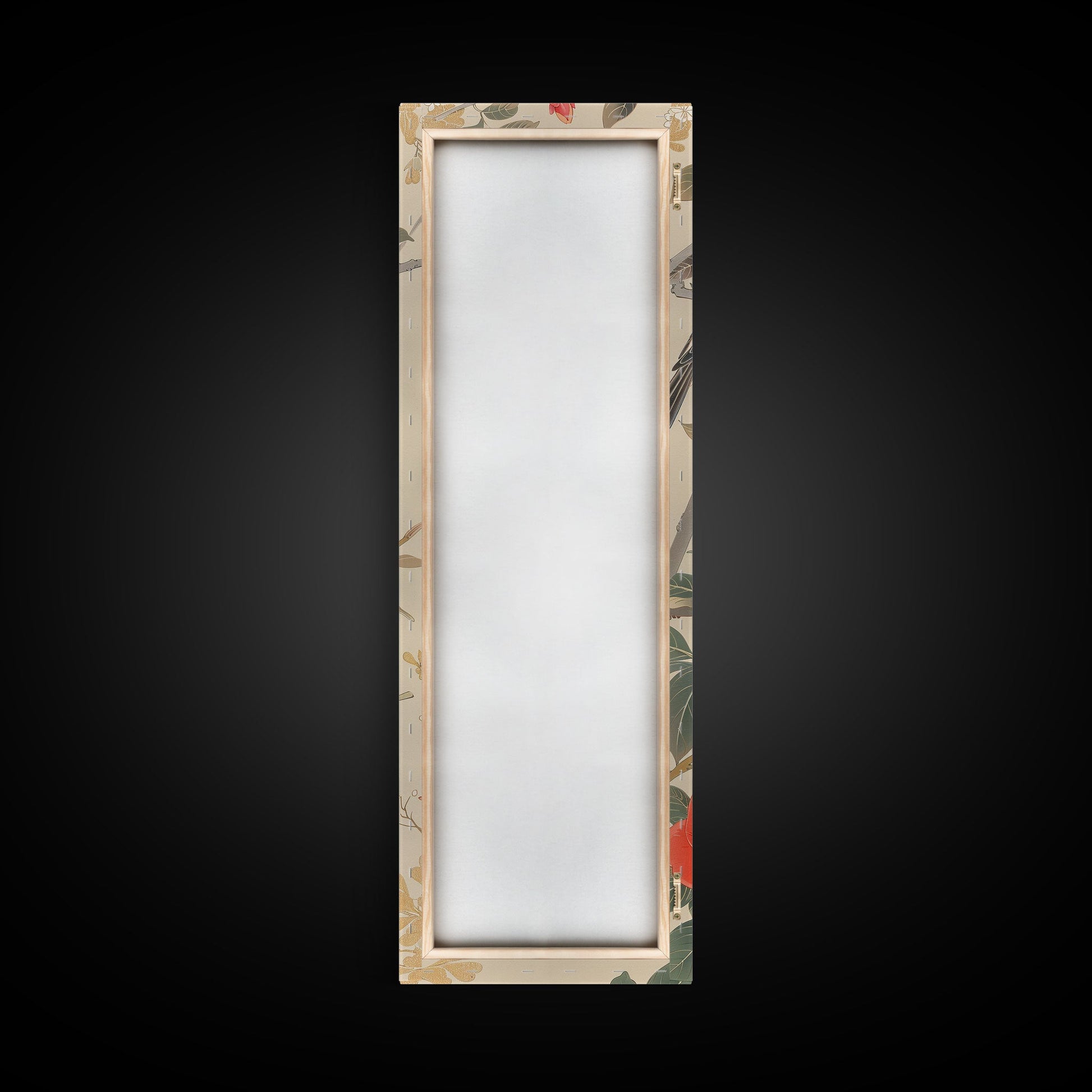 Bird On Branch With Red Peonies And Green Leaves Tall Art Skinny Art Framed Canvas Print Japanese Style Art Ukiyo-e Wood Block Print