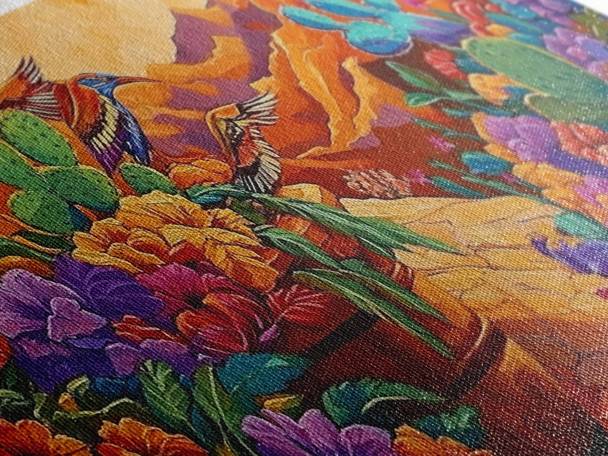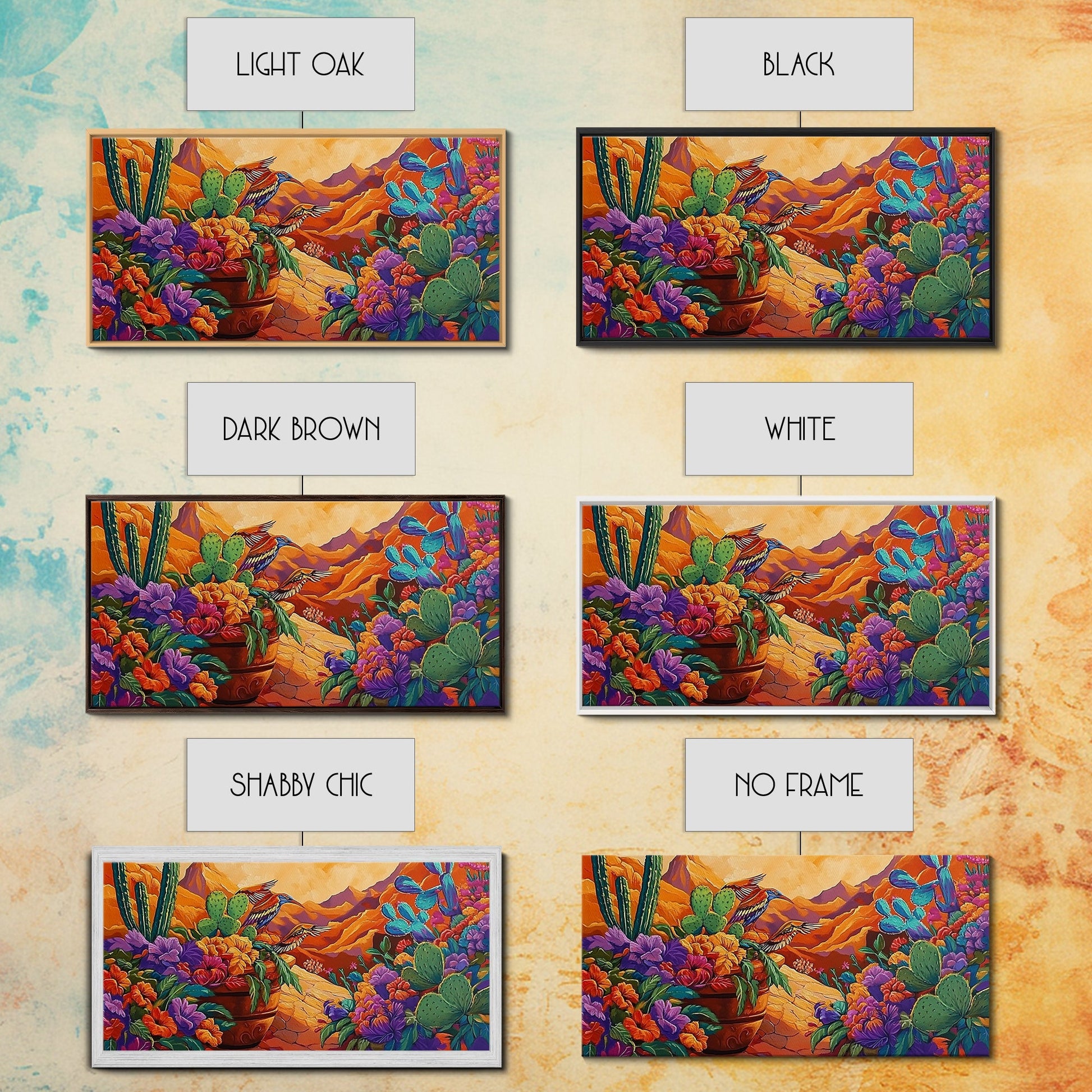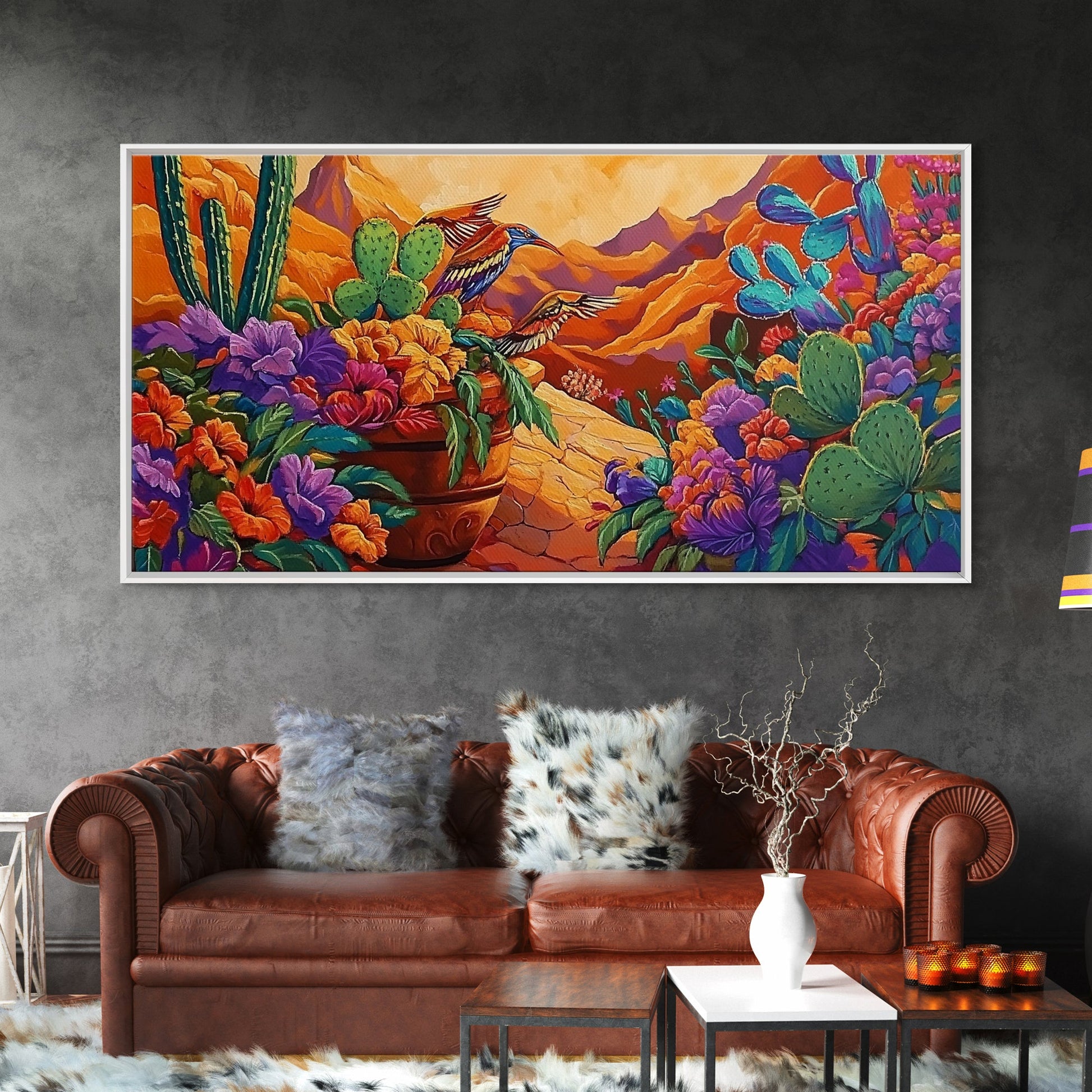 Birds Cactus, Blossoms, Bright Nature Framed Canvas Print, Desert Floral Wall Decor, Southwest Living Room Boho Wall Art