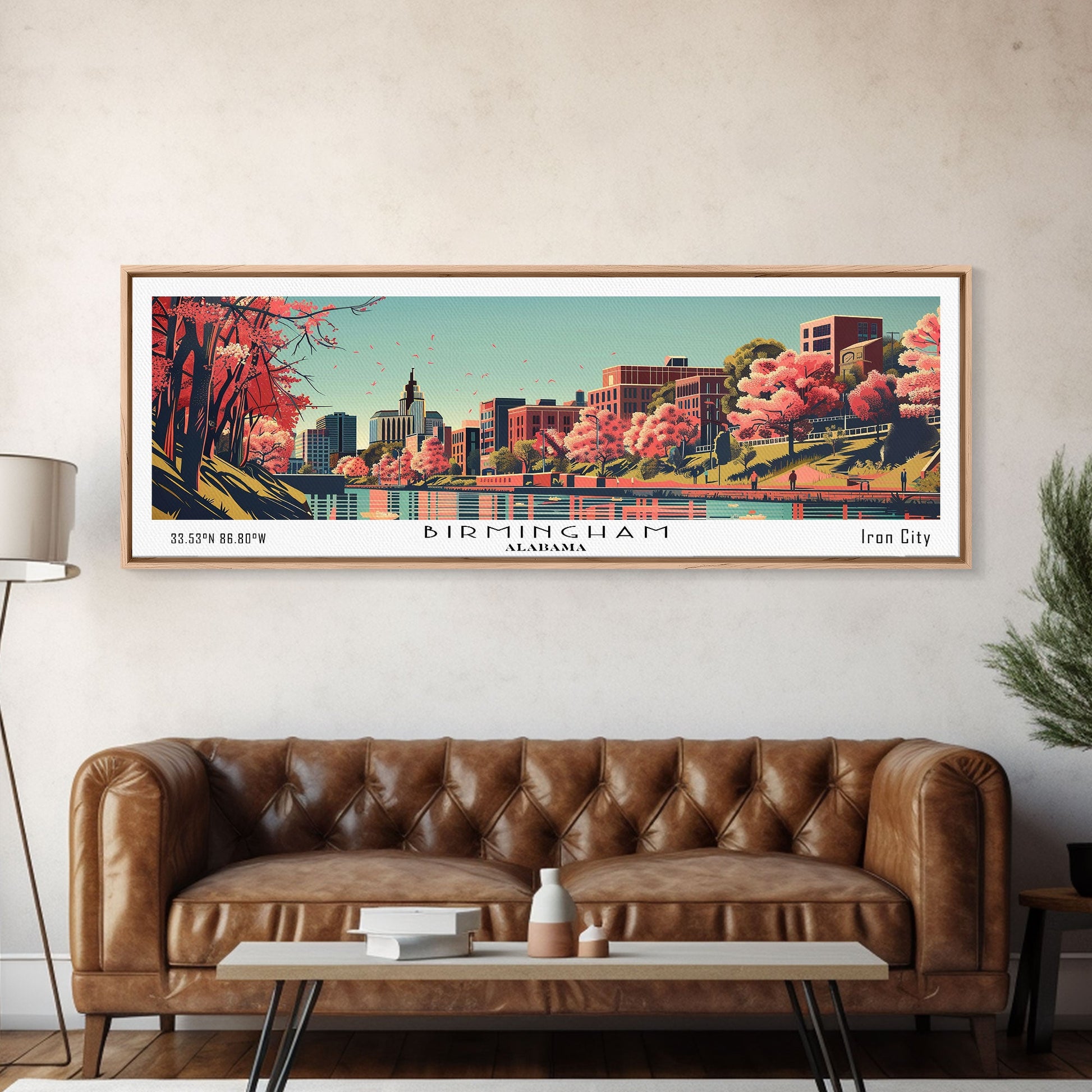 Birmingham Alabama Panoramic Painting, Framed Canvas Print, Mid Century Modern Wall Art, Retro Pop Art Travel Poster, Office Decor, City Art