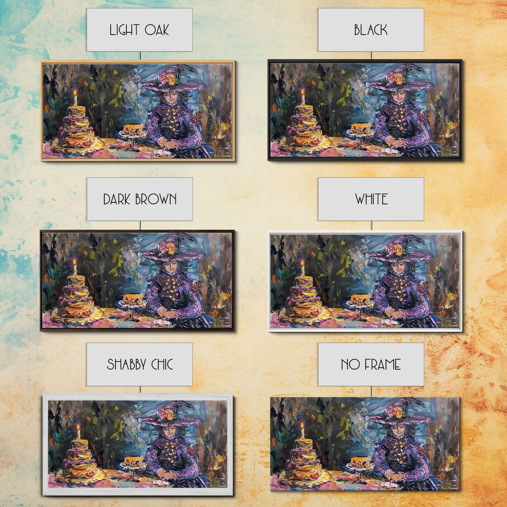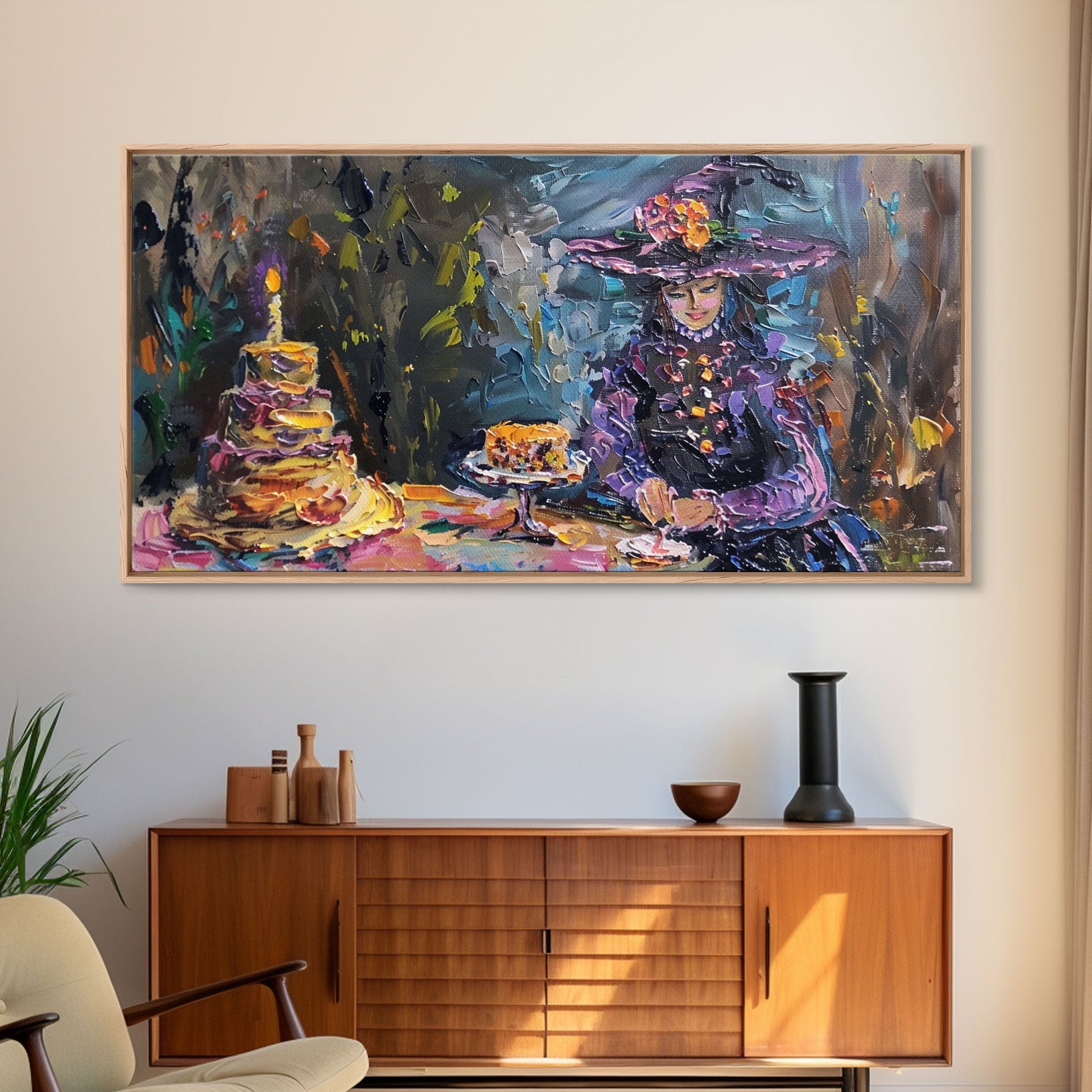 Birthday Party for One, Springtime Witch and A Birthday Cake, Framed Canvas Print, Funny Halloween Art