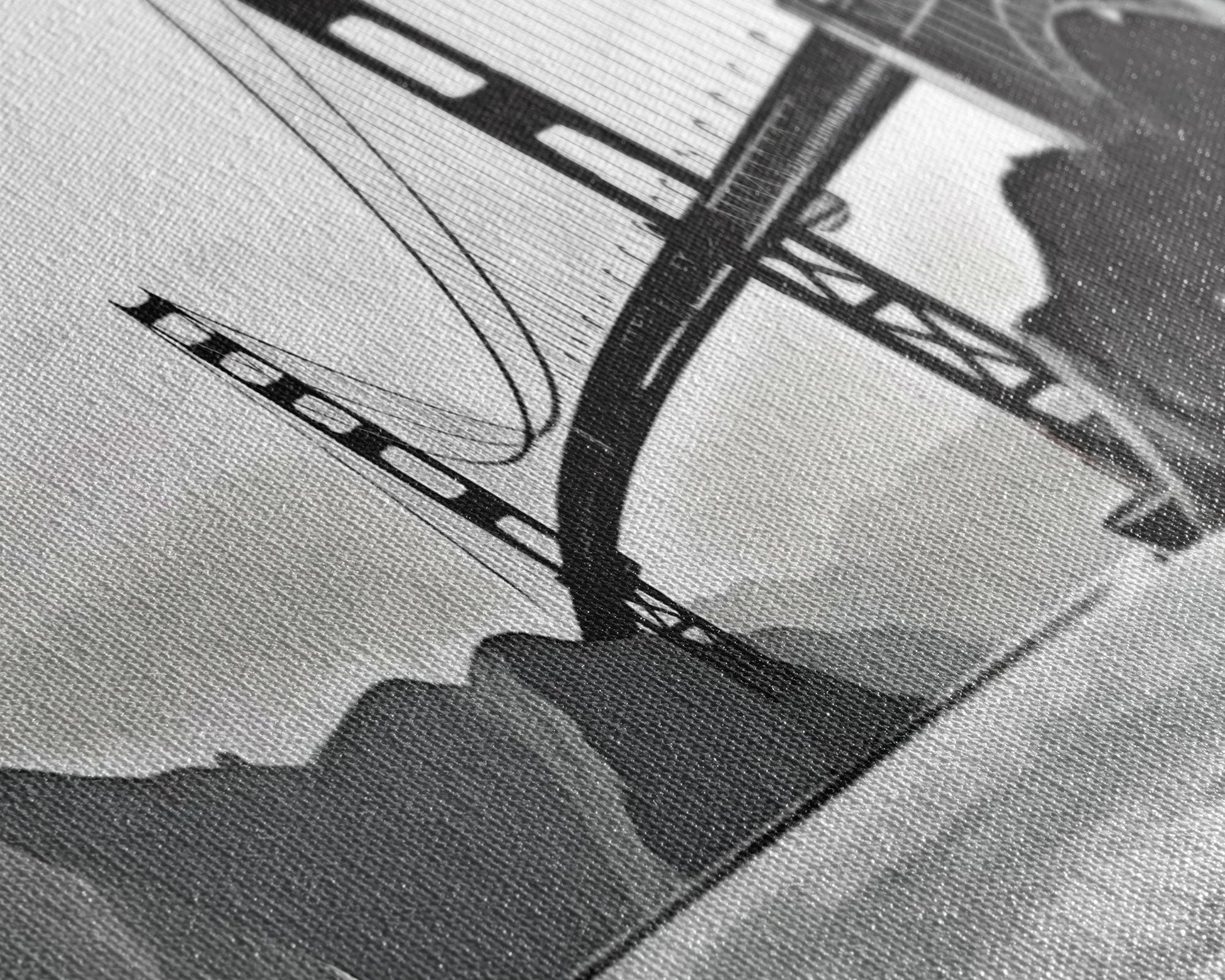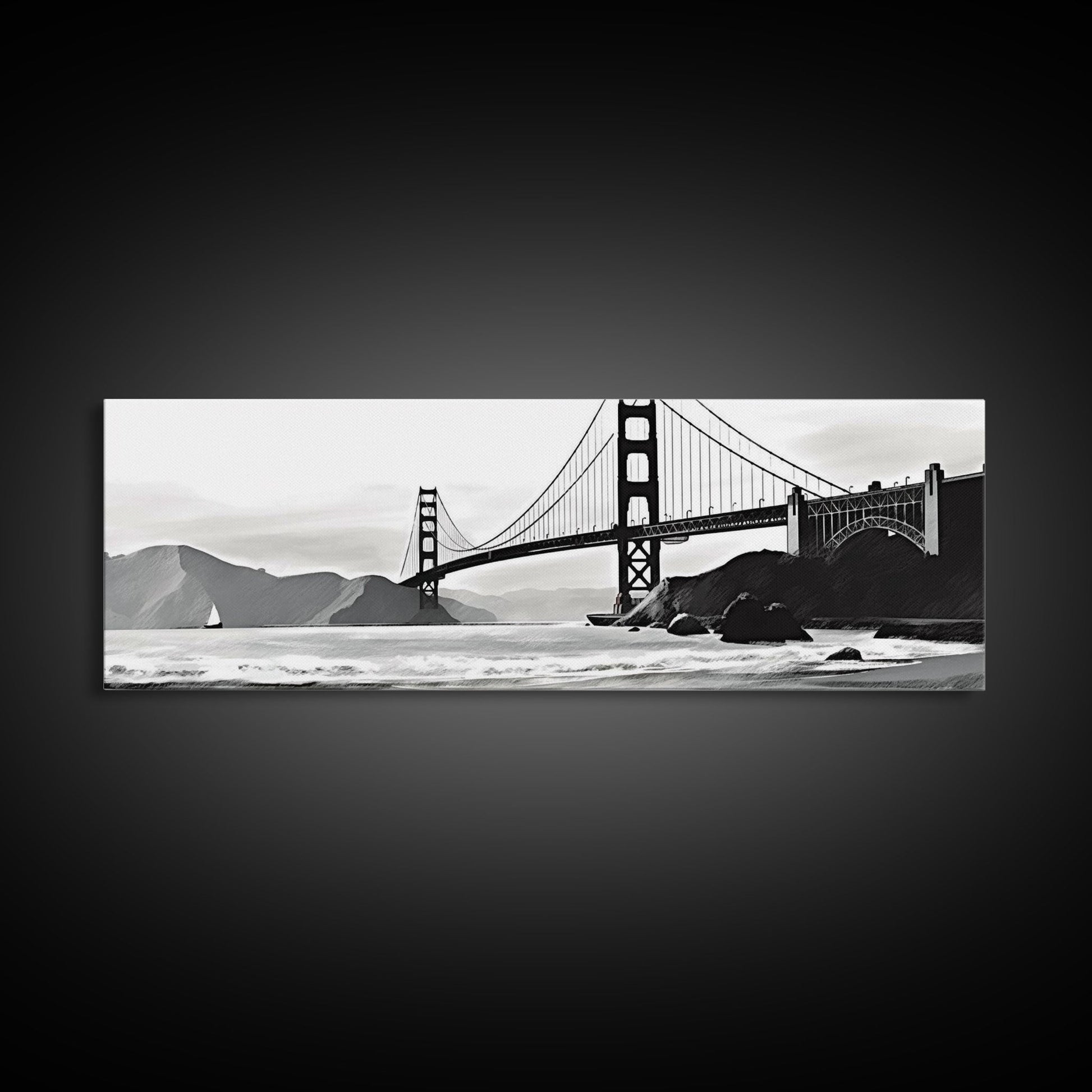 Black And White Suspension Bridge Canvas Print, Large Urban Art Print, Sailboat, River, Landscape, Panoramic, Wall Art, Canvas Print