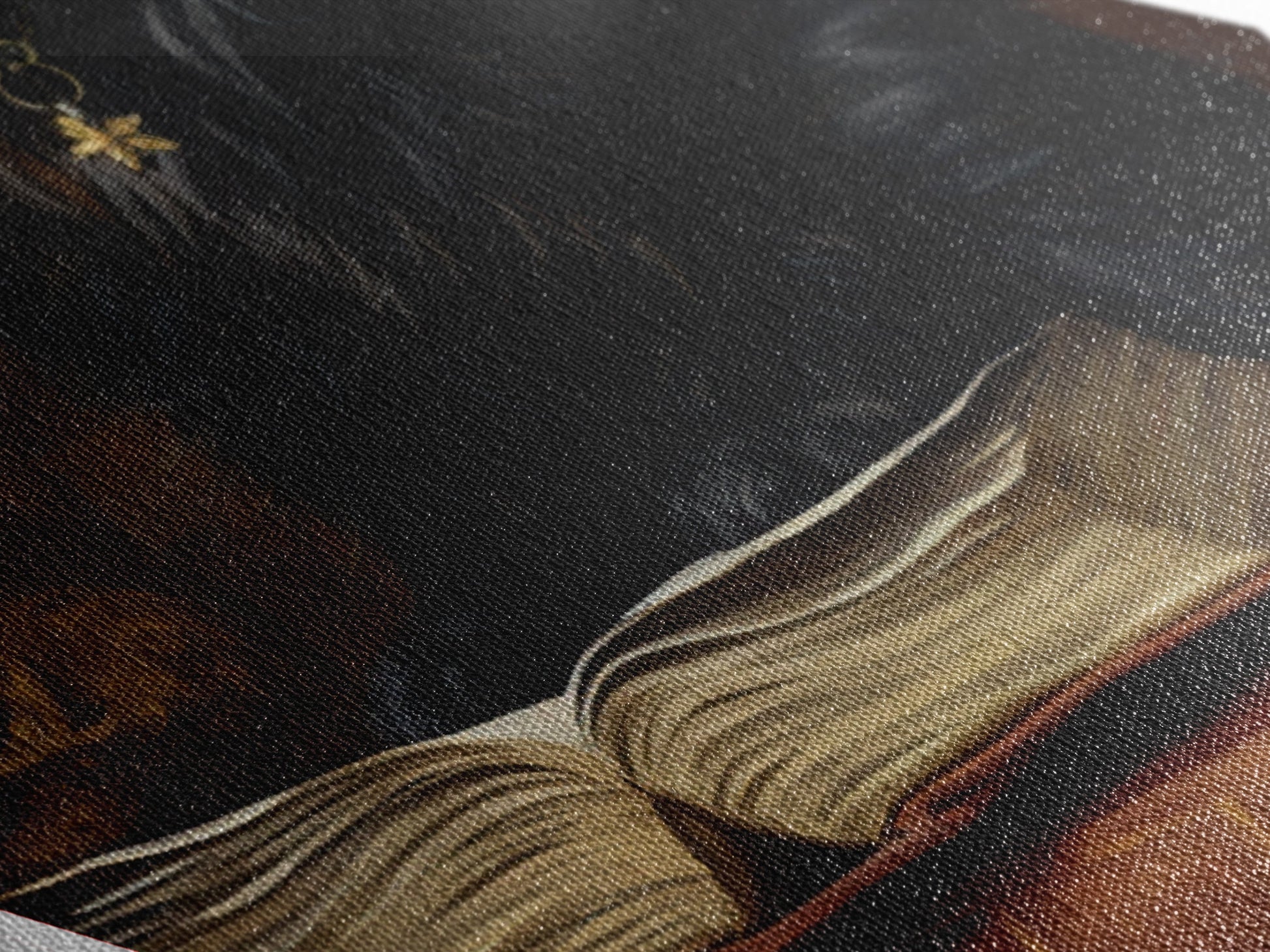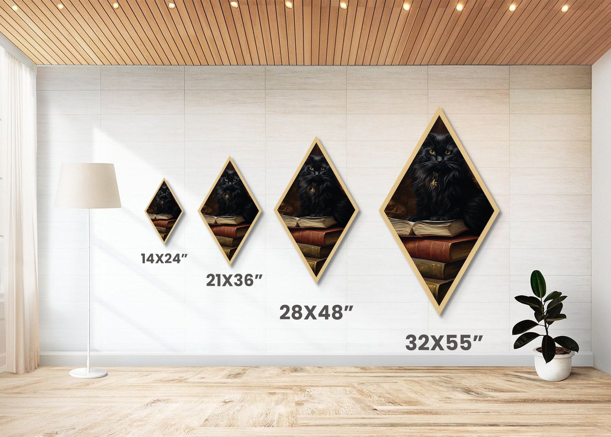 Black Cat with Spellbook and Antique Library Canvas Art Print, Dark Academia Diamond Shaped Art for Halloween Gothic Witch Decor