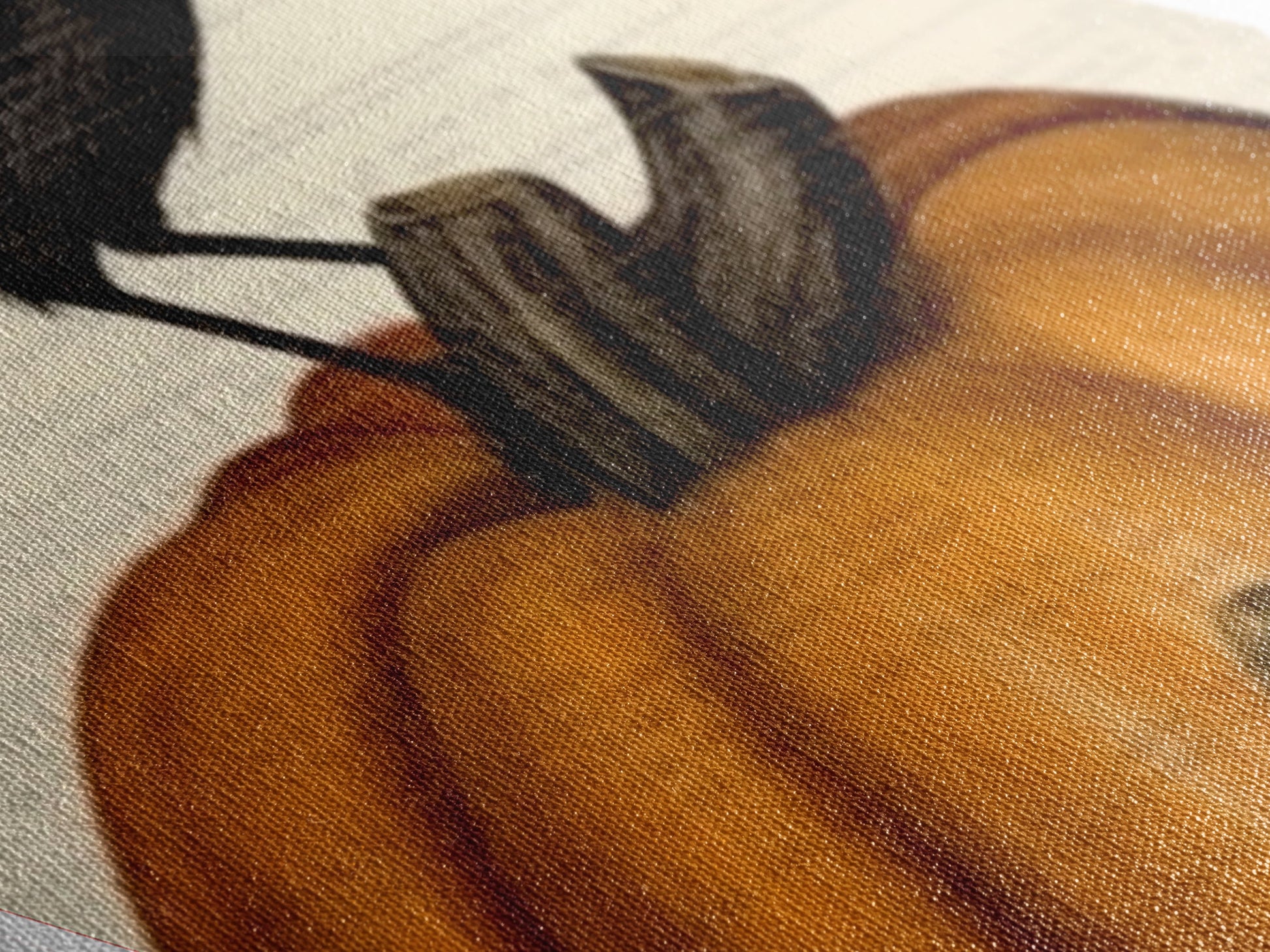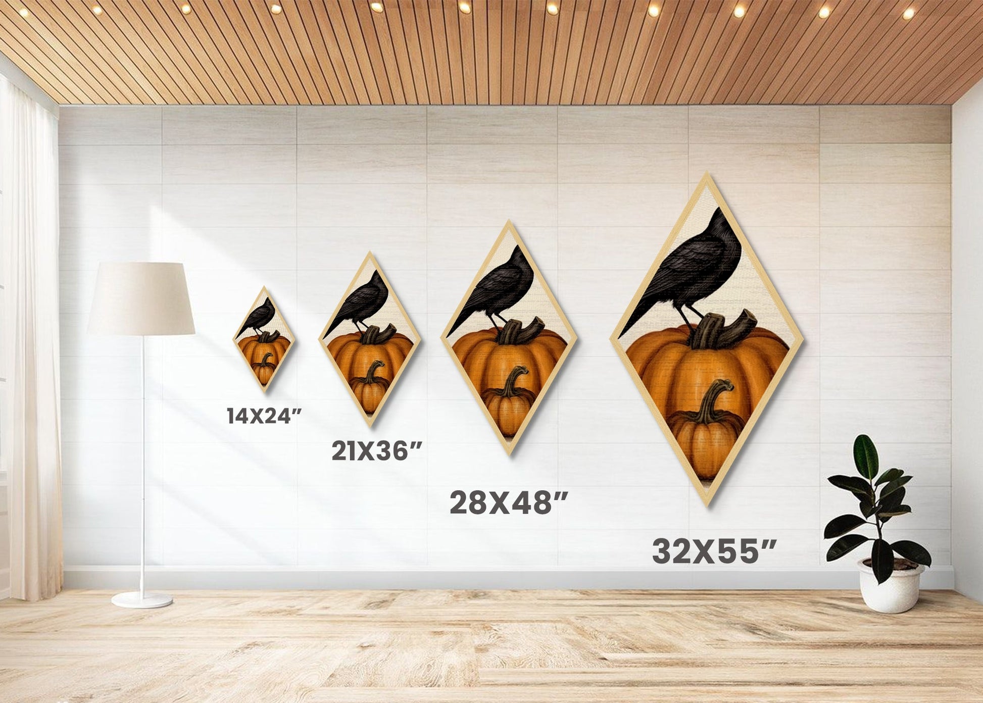 Black crow on stacked pumpkins Canvas Art Print in vintage Halloween aesthetic with dark farmhouse Diamond Shaped Art finish