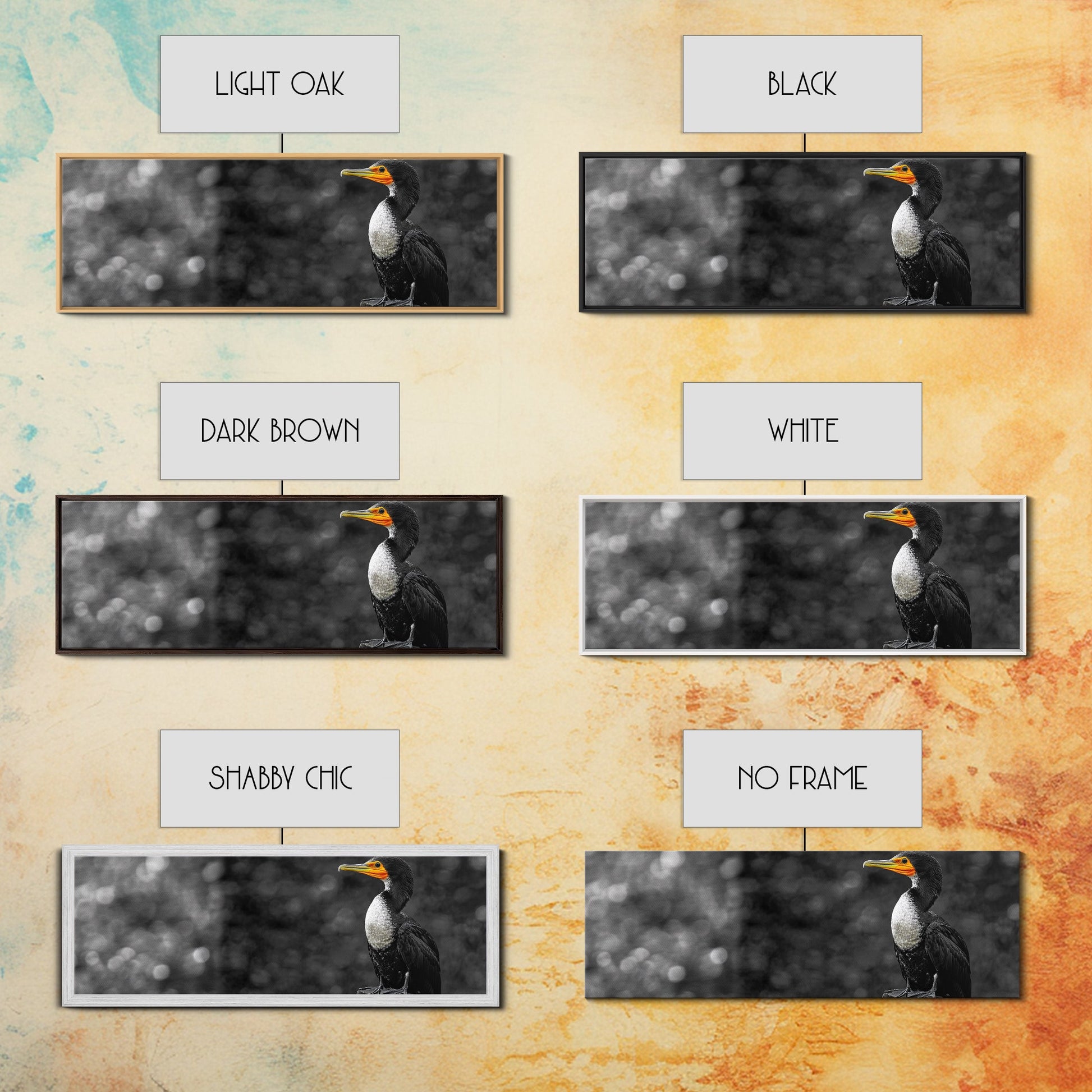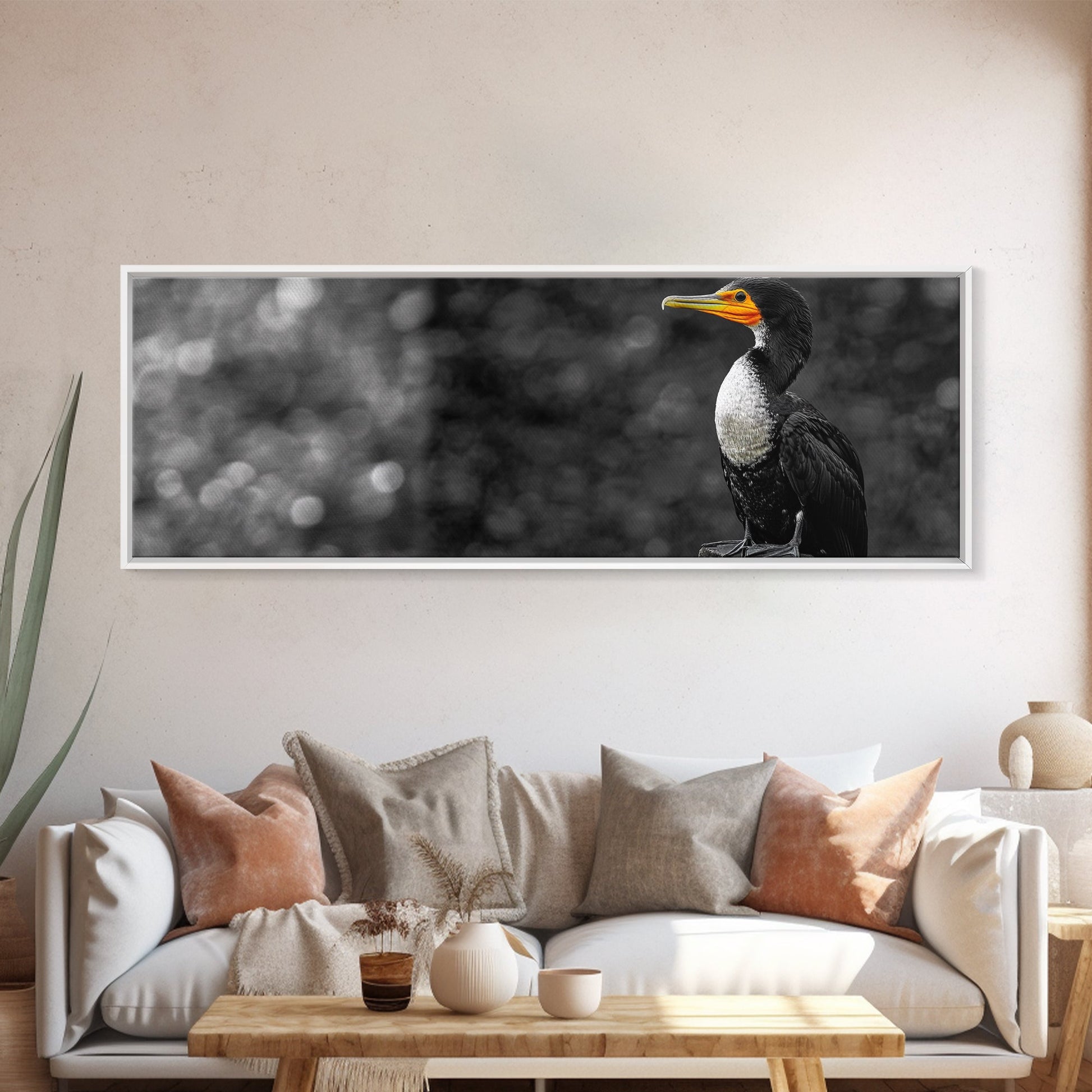 Black White Bird, Orange Beak Detail, Minimal Nature Portrait, Framed Canvas Print, Rustic Wall Art, Study or Cabin Decor