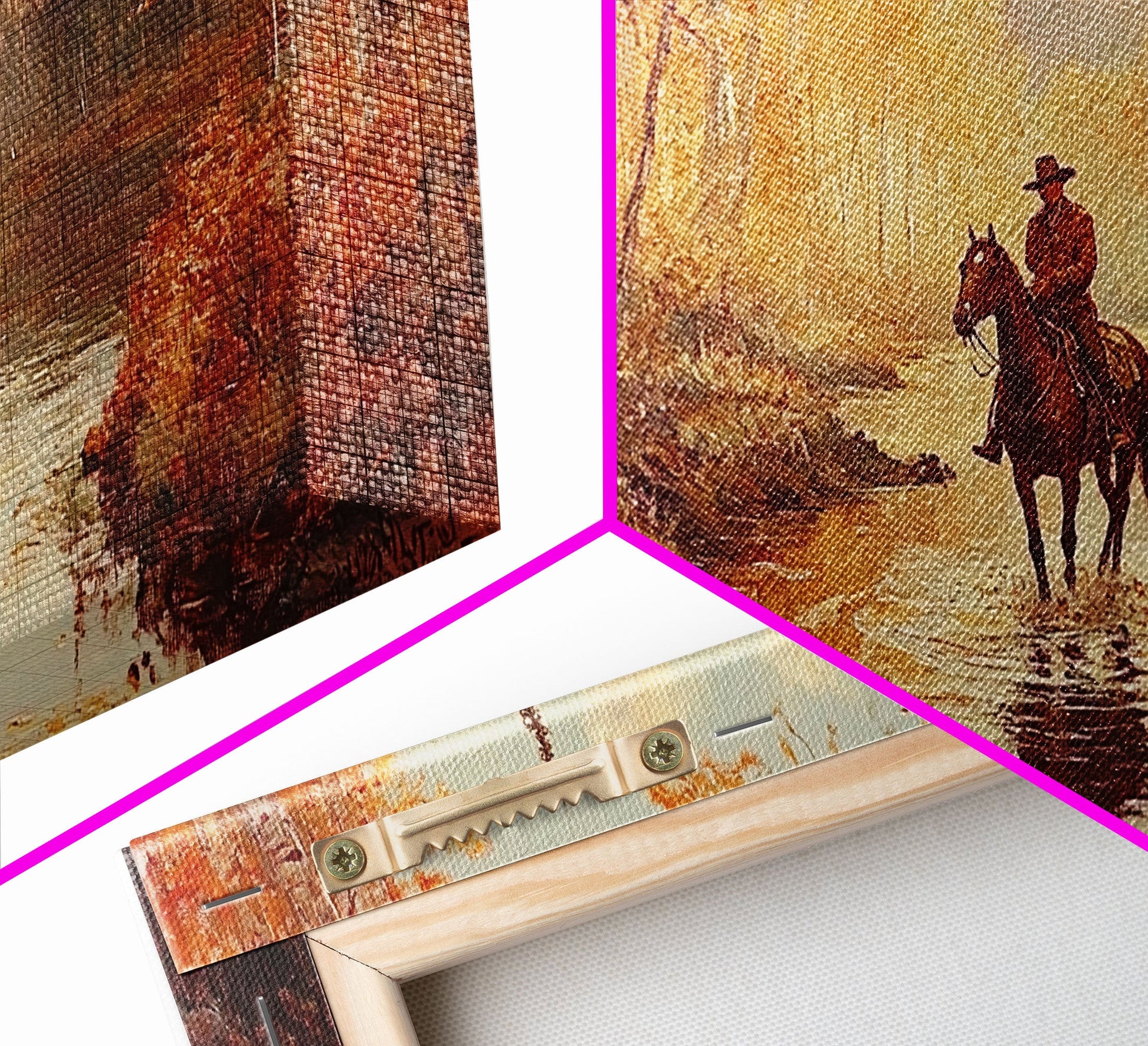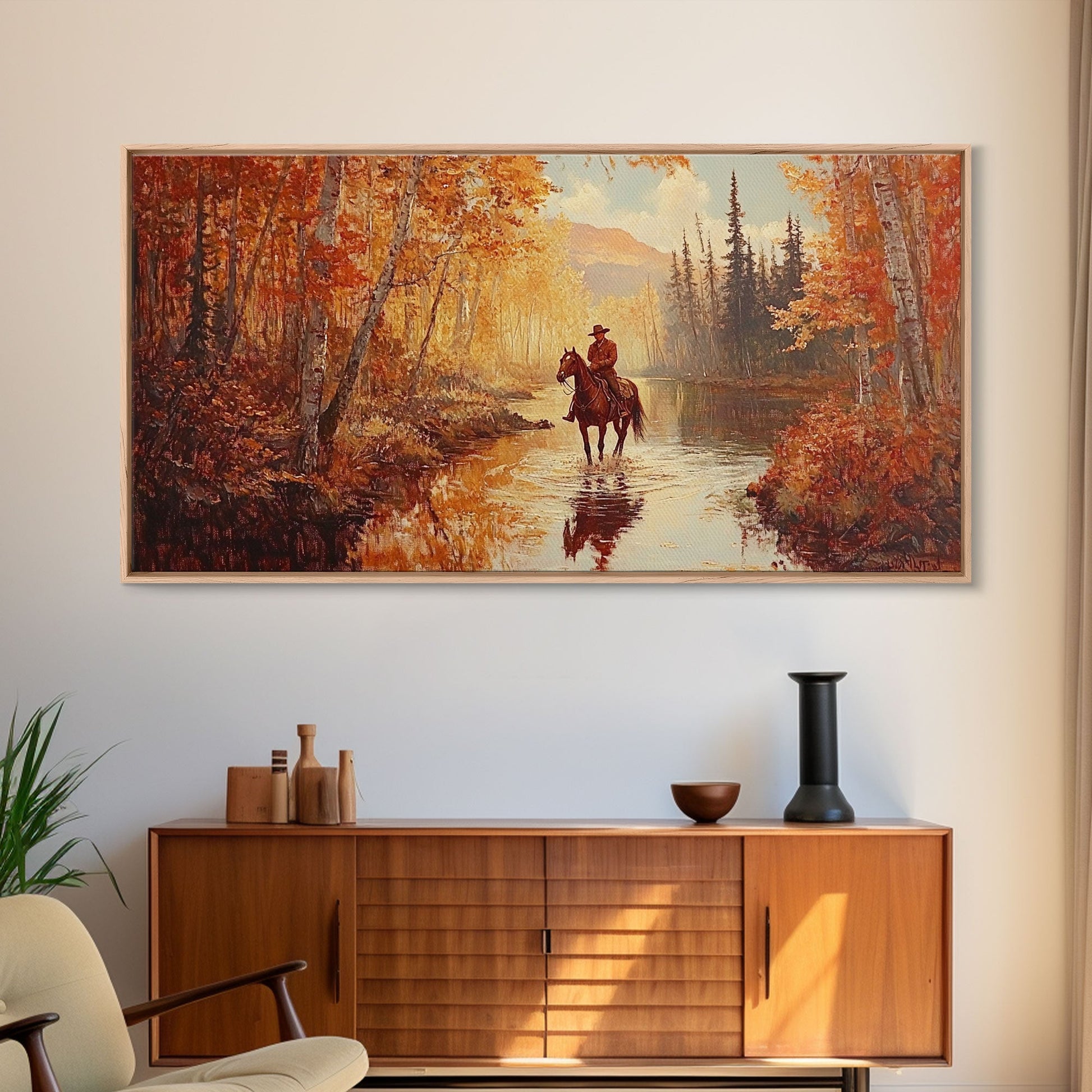Black white cowboy riding toward snow-covered mountains, Framed Canvas Print, minimalist winter wall art, moody landscape, western decor