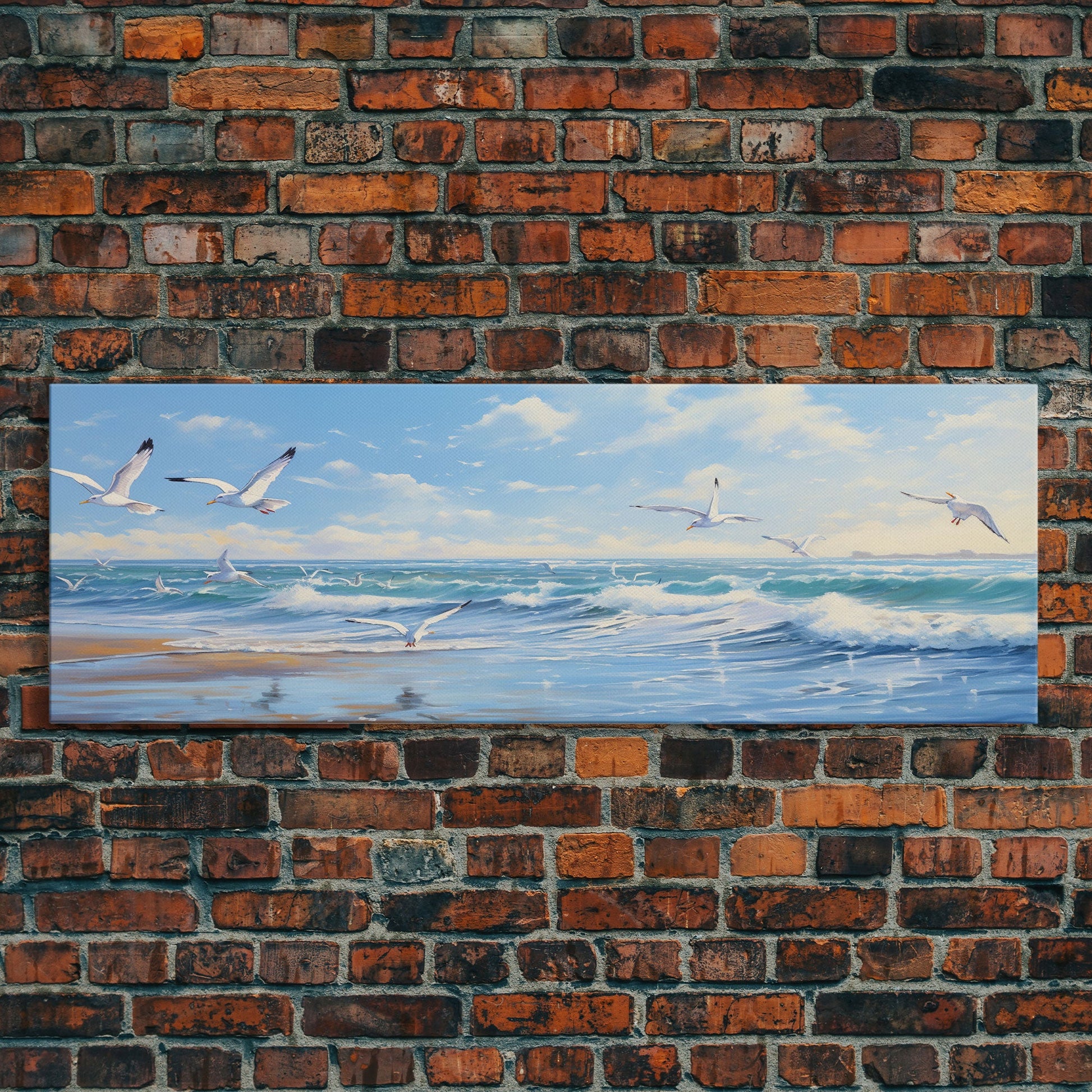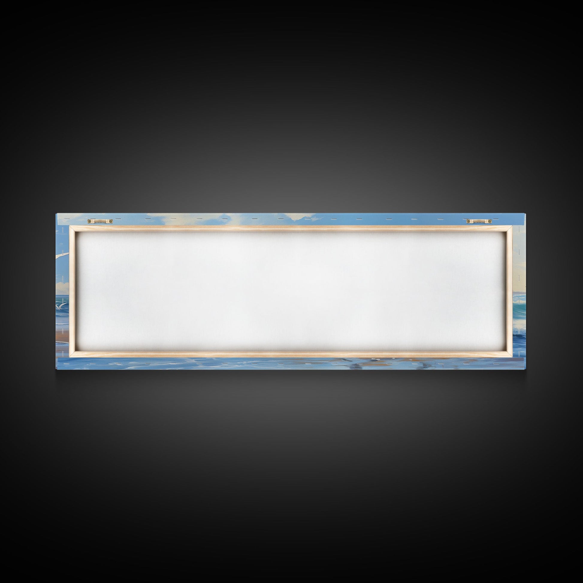 Blue Beach, Ocean Waves & Seagulls Panoramic Framed Canvas Print - Perfect for Living Room, Bedroom, Office Decor