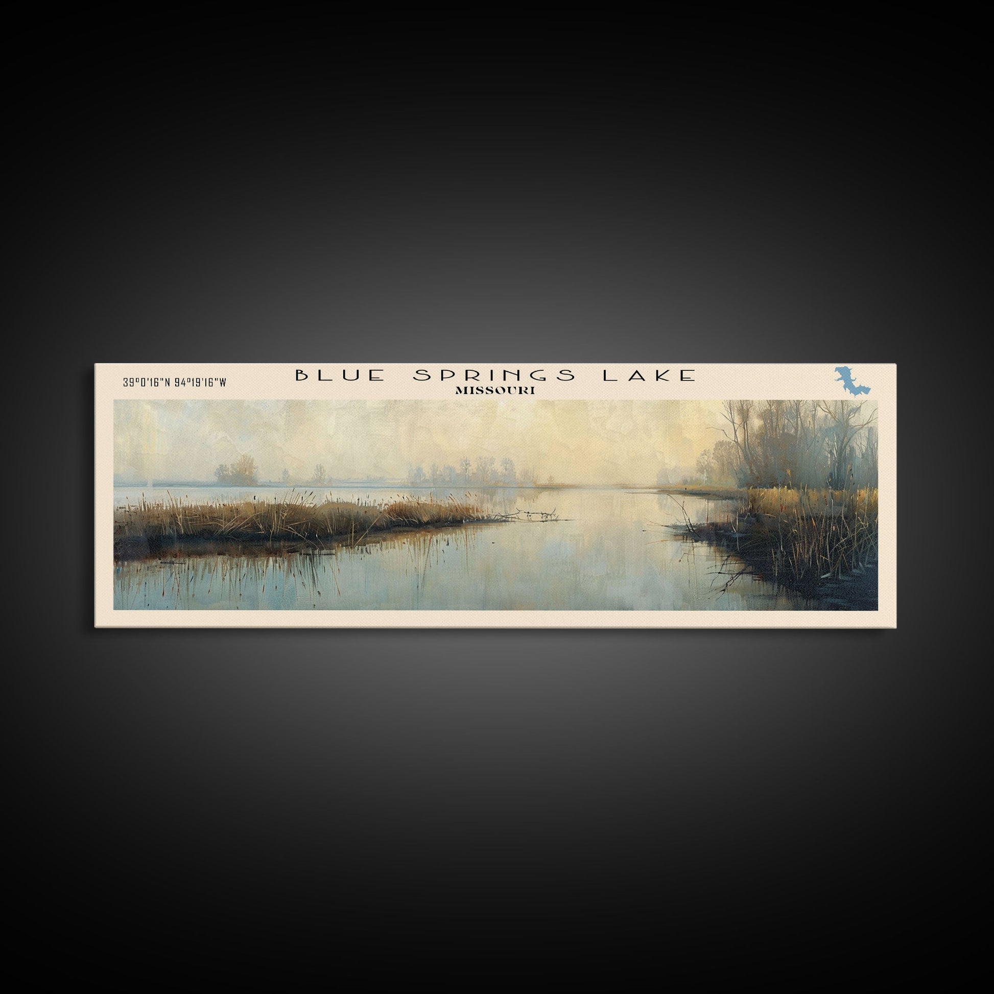 Blue Springs Lake Missouri Framed Canvas Print, Lake House Art, Panoramic Scenic View, Travel Poster, Minimalist Art, Lake Painting