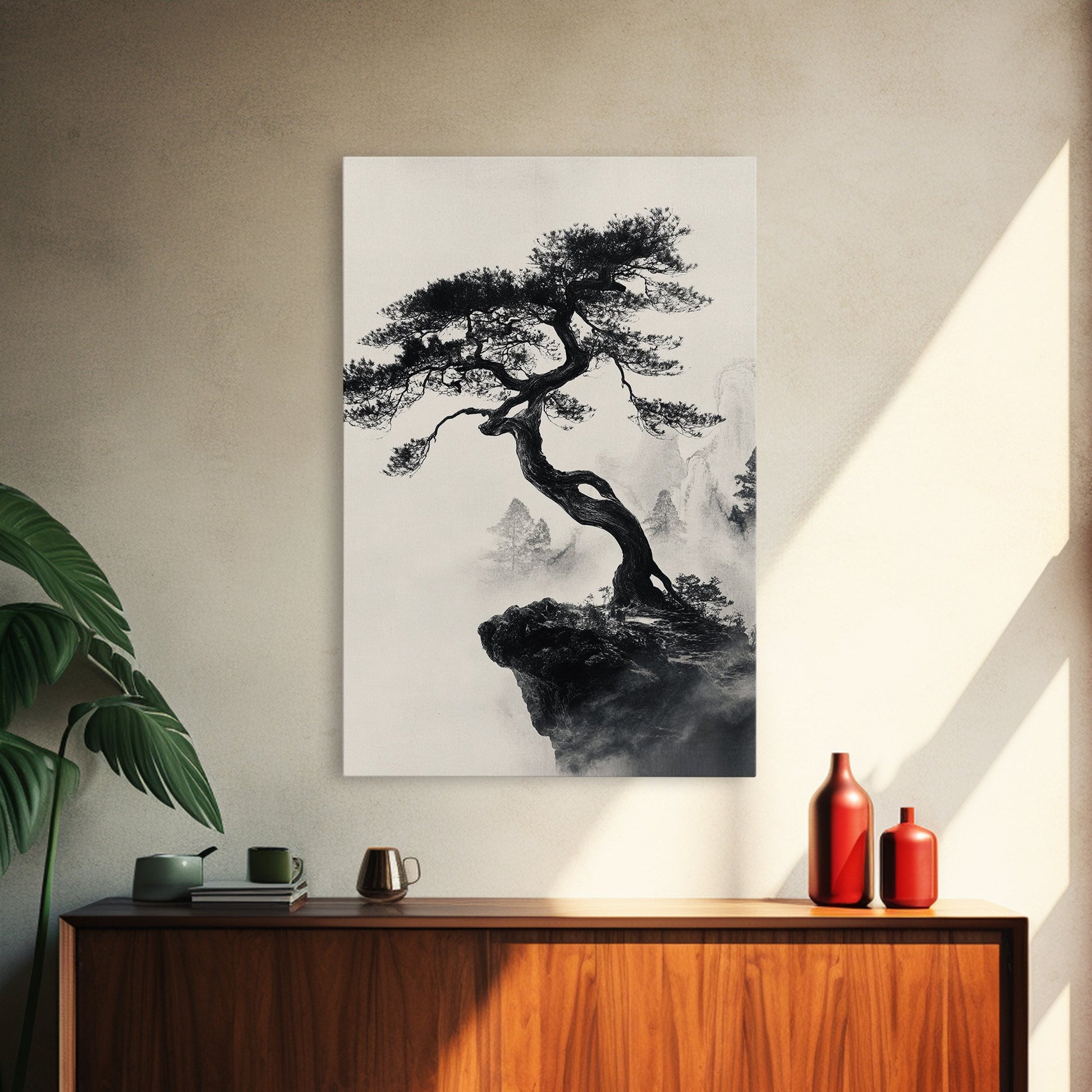 Bonzai Tree on a Cliff Wabi Sabi Painting Print, Wood Framed Wall Art, Bonzai Tree Art, Japanese Style Artwork