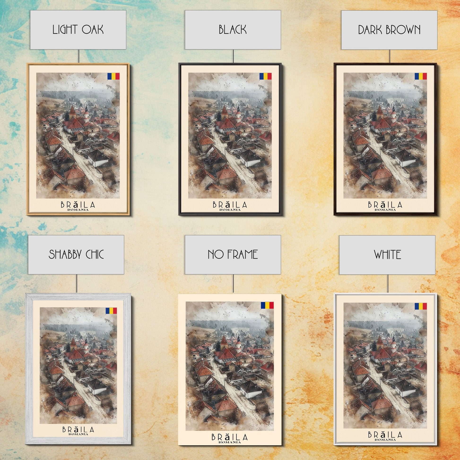 Brăila Romania Travel Poster Framed Canvas Print, Cityscape Art, Wall Decor, Travel Print, Watercolor Painting, Rustic Scene Art