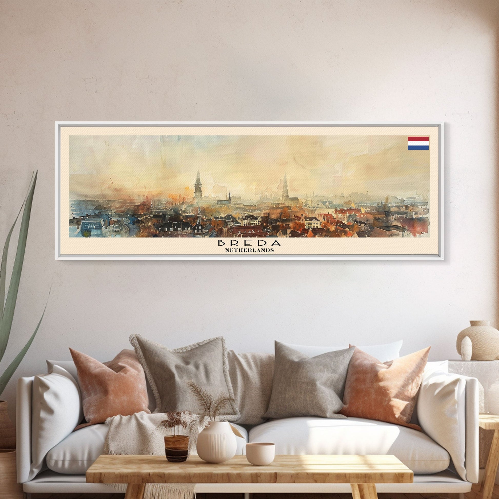 Breda Netherlands Panoramic Travel Poster, Framed Canvas Print or Metal Wall Art, Travel Art, Home Decor, Panoramic Painting, Midcentury Art