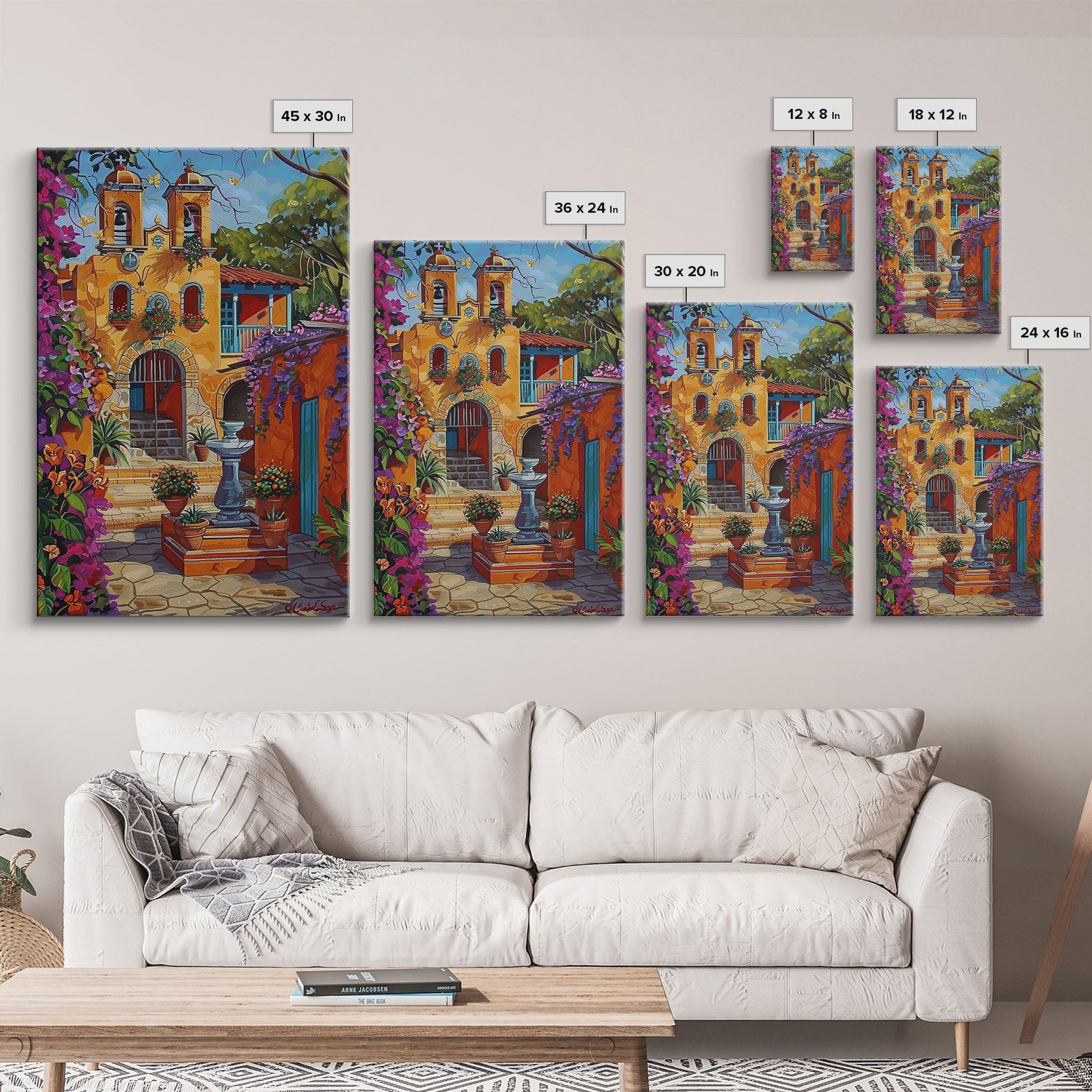 Bright Mexican Style Tall Art Framed Canvas Print Depicting Ornate Blue Door And Rustic Courtyard