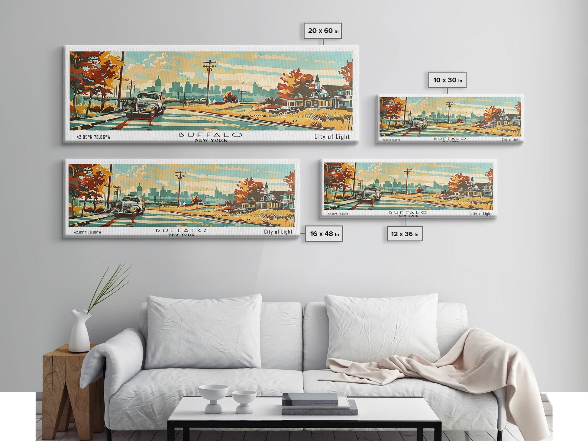 Buffalo New York Panoramic Painting, Mid Century Modern Framed Canvas Print, Retro Pop Art Travel Poster, Wall Decor, Home Decor, Wall Hanging