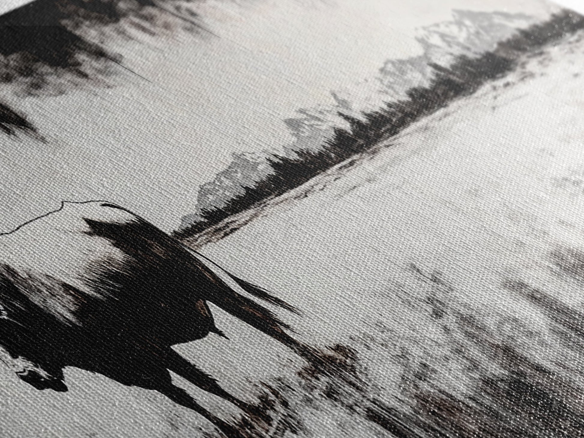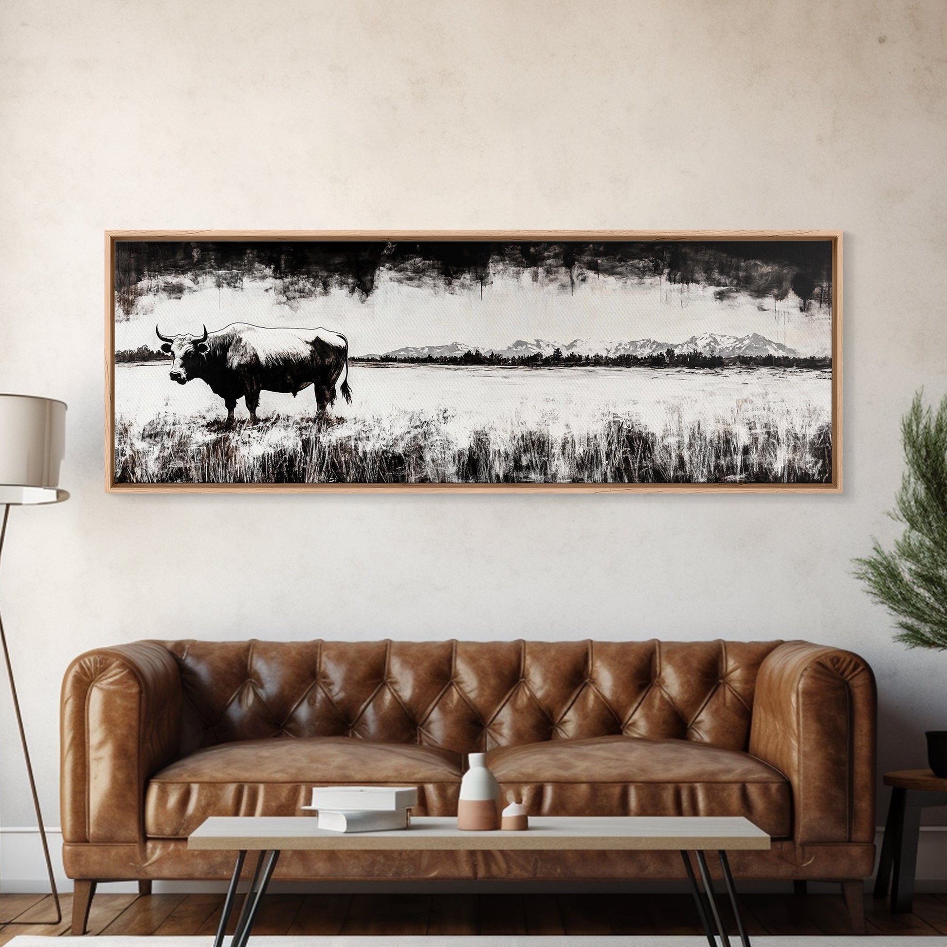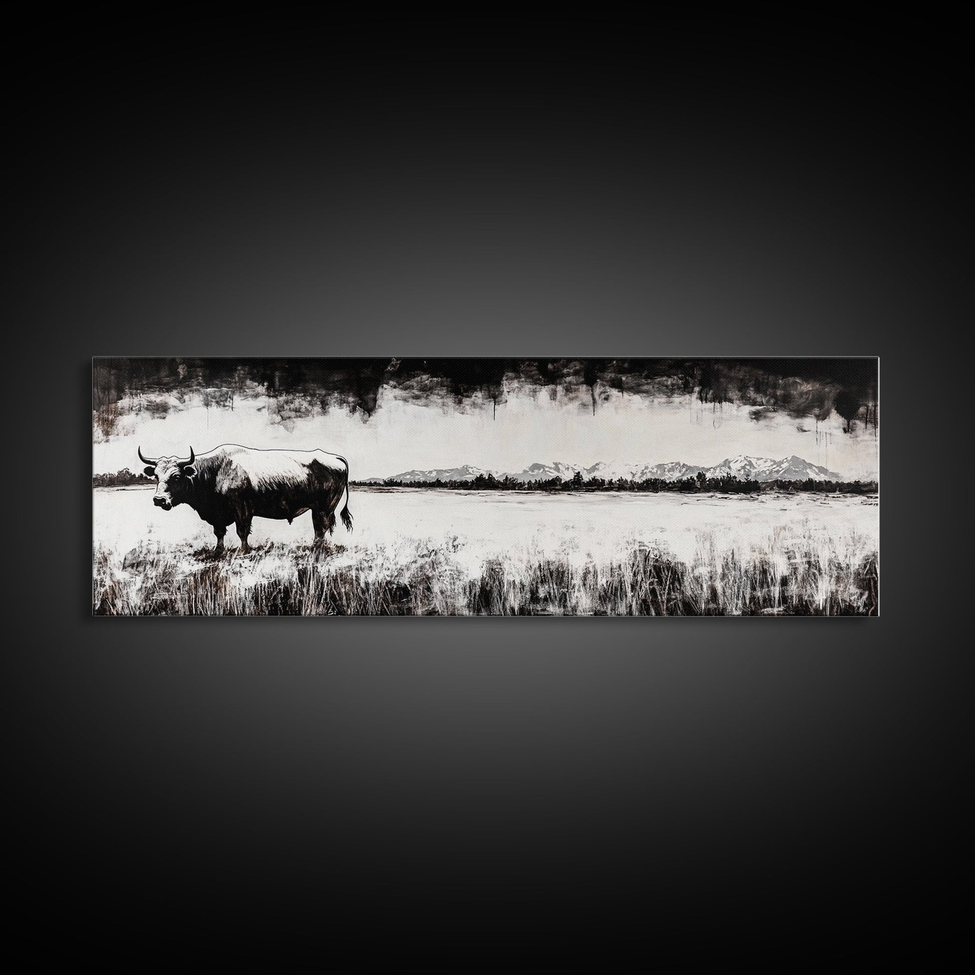 Bull and bear art, black and white painting, rustic wall art, farmhouse decor, extra wide art, framed canvas print, moody art, landscape painting