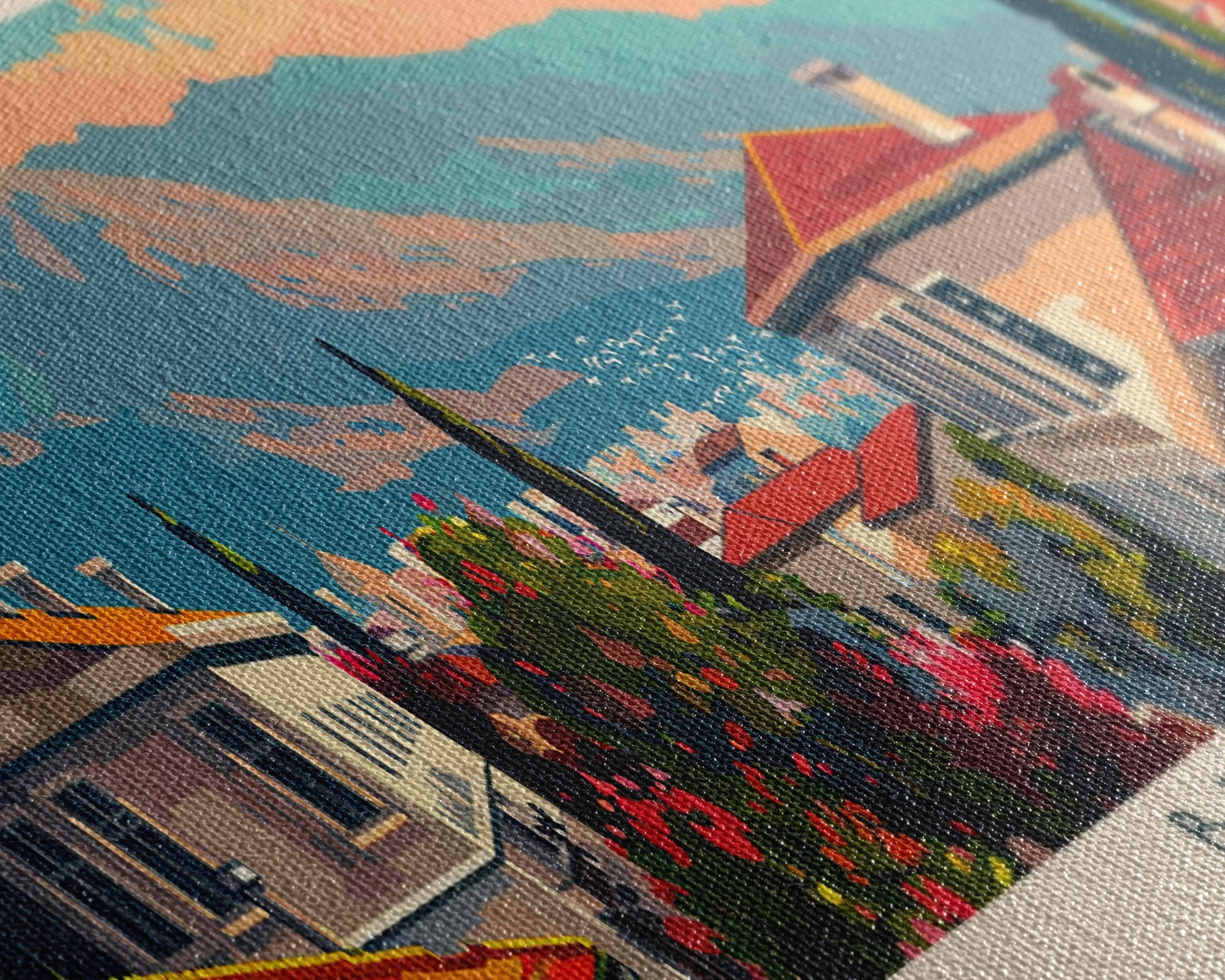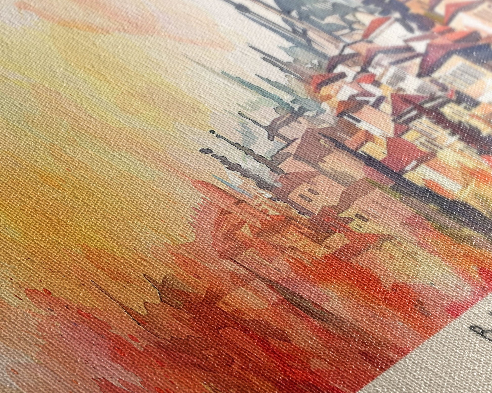 Most of our canvases are made in the USA, with the exception of canvases ordered with the light oak unstained frames, and any large canvases (24x48, 30x60, 16x48 and 20x60) ordered WITH a frame. These are temporarily made in and shipped from Europe, while we try to find a more consistent supplier in the USA.