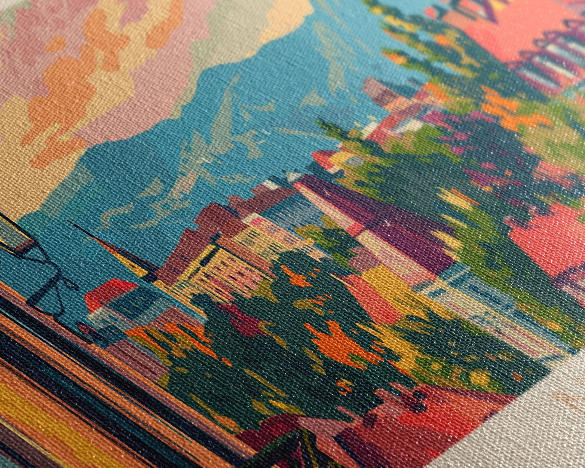 Most of our canvases are made in the USA, with the exception of canvases ordered with the light oak unstained frames, and any large canvases (24x48, 30x60, 16x48 and 20x60) ordered WITH a frame. These are temporarily made in and shipped from Europe, while we try to find a more consistent supplier in the USA.