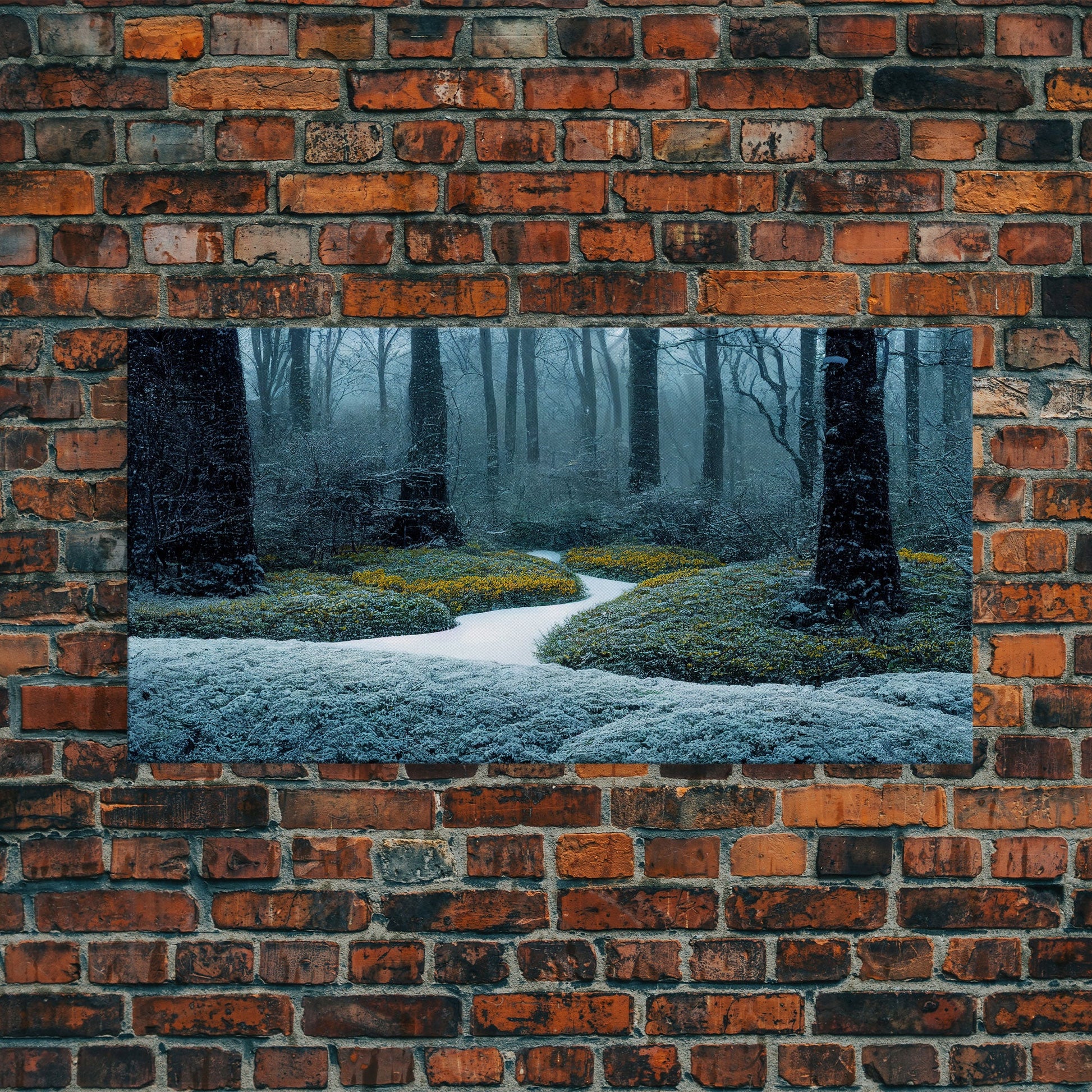 Cabin art, snow covered winter forest, winter vacation home art, framed canvas print, ready to hang framed wall art