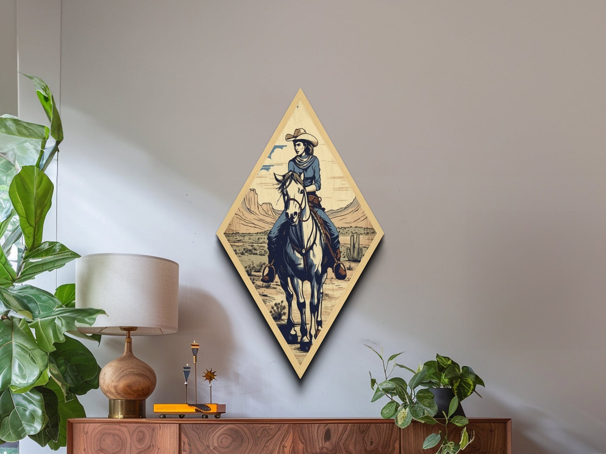 Cactus Cowgirl Ride Diamond Shaped Vintage Western Scene Canvas Textured Print Southwestern Wall Art Country Equestrian Gift