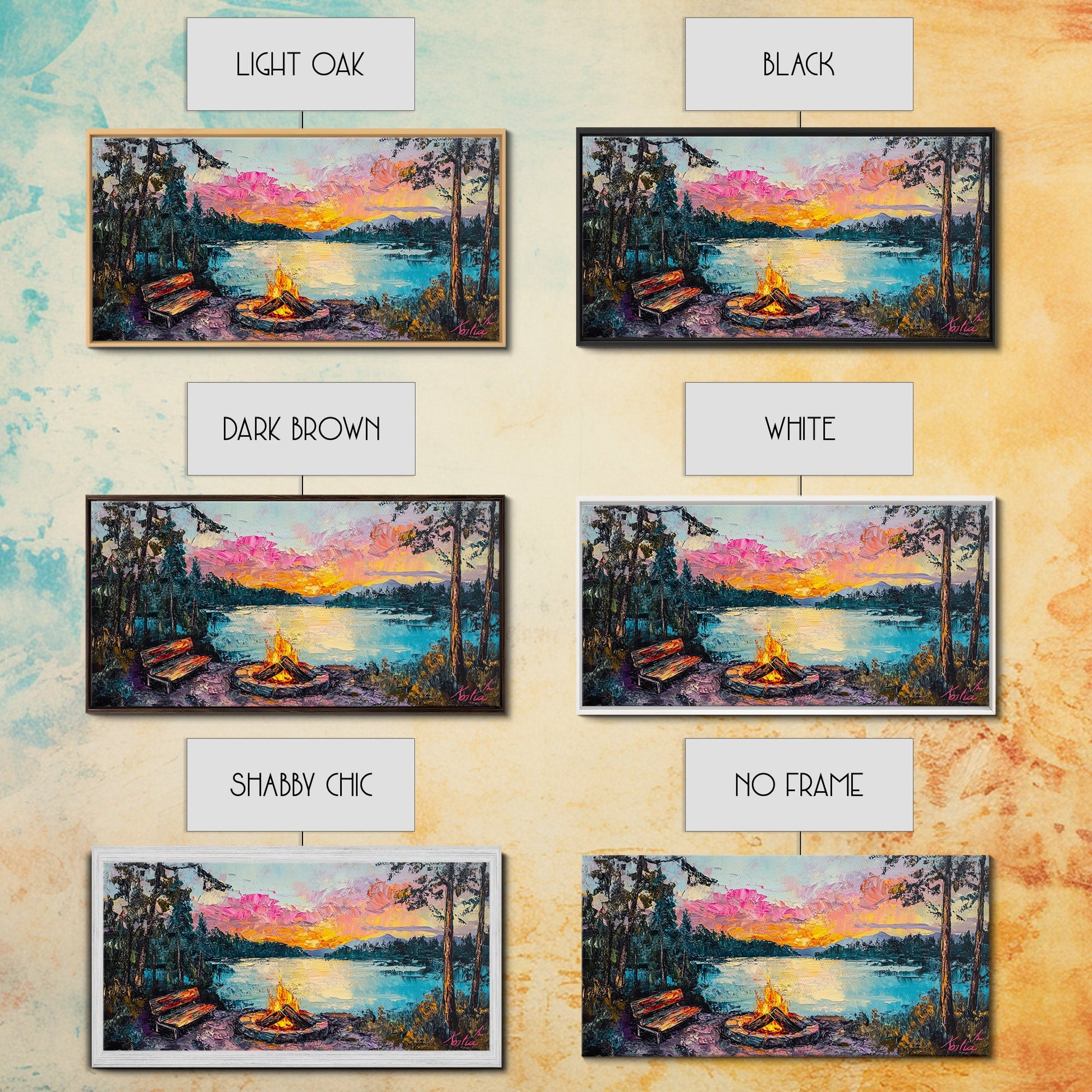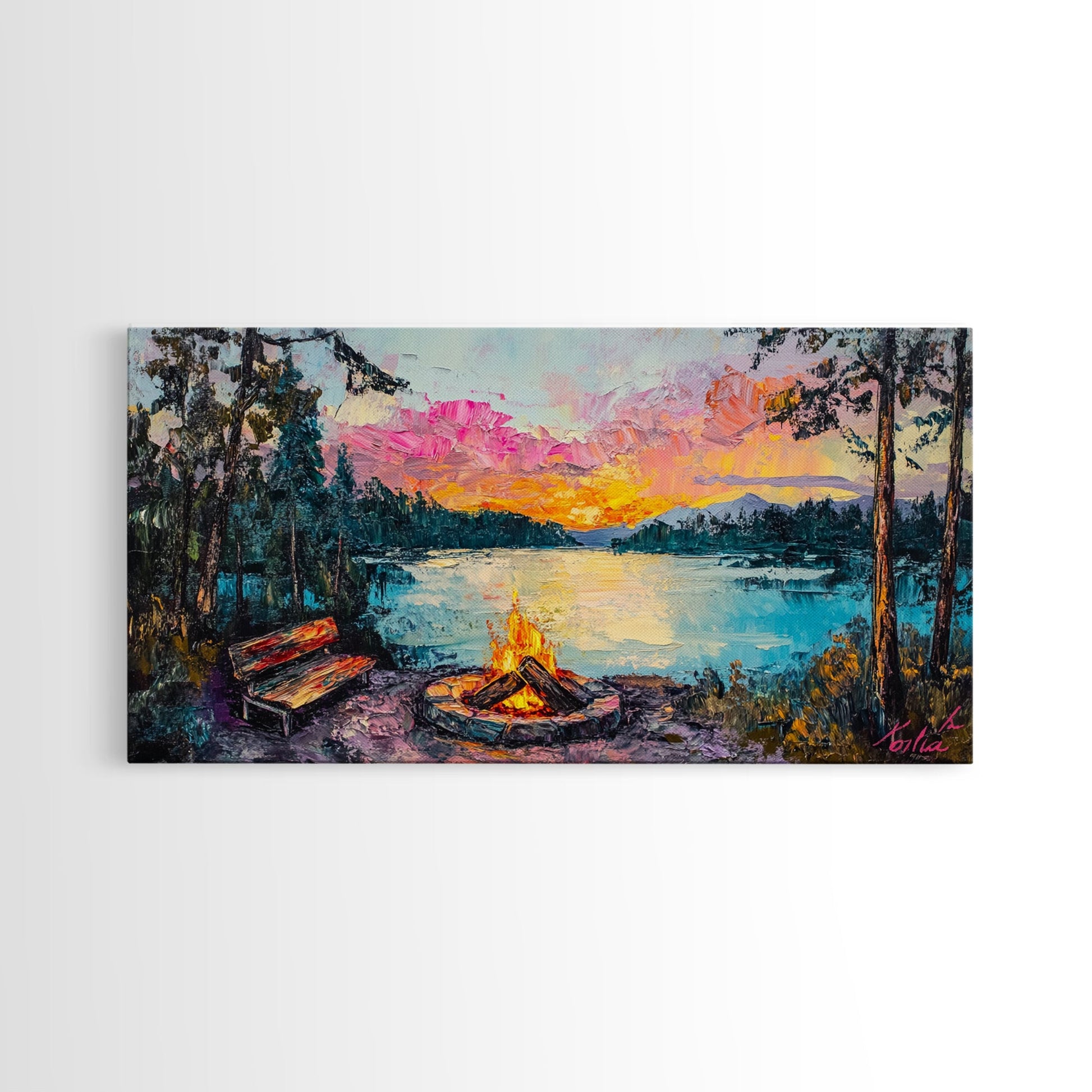 Campfire by Lake, Mountain Painting, Landscape Art, Moody Art, Framed Canvas Print, Above Sofa Art, Wabi Sabi Art, Rustic Decor