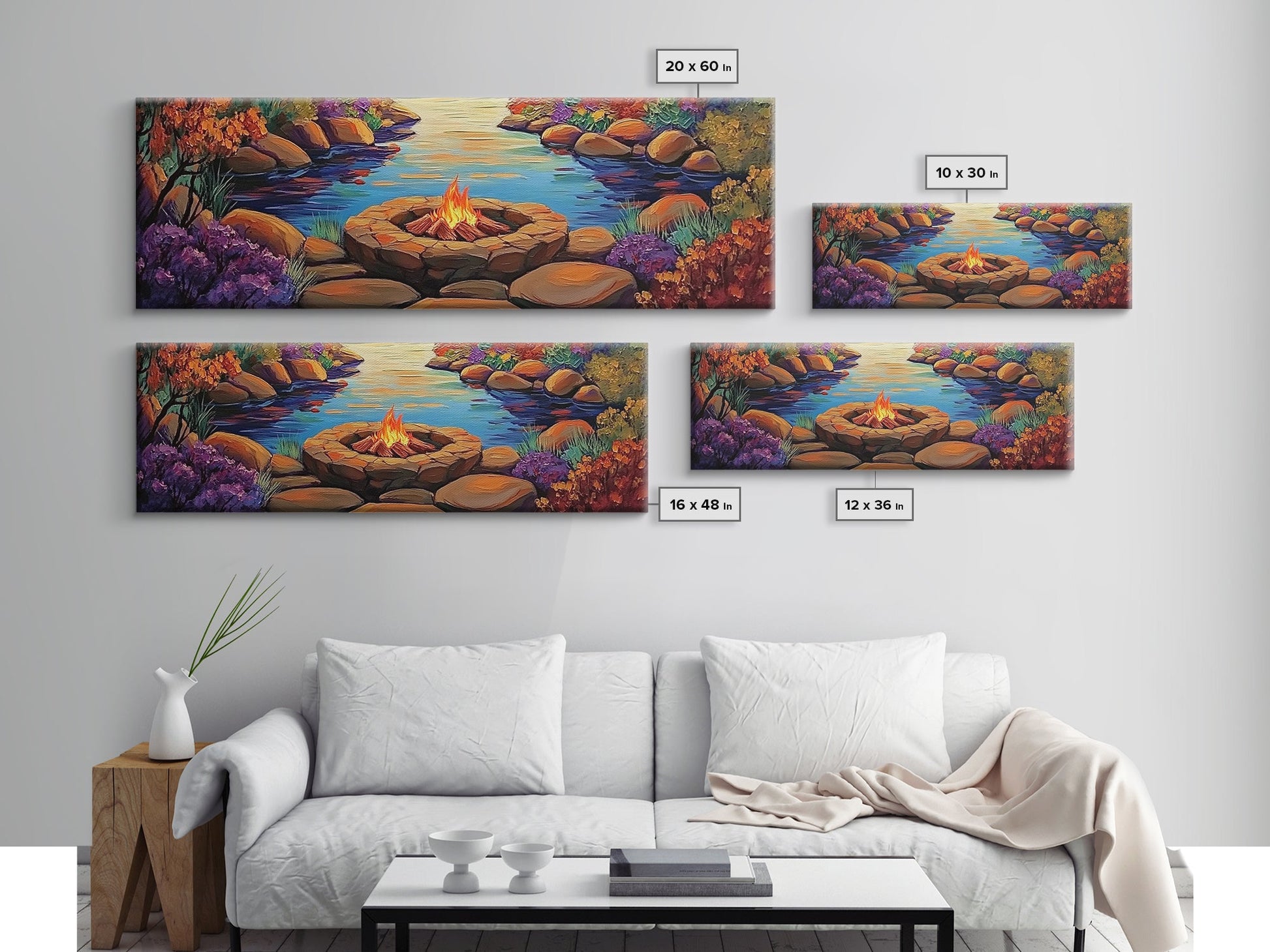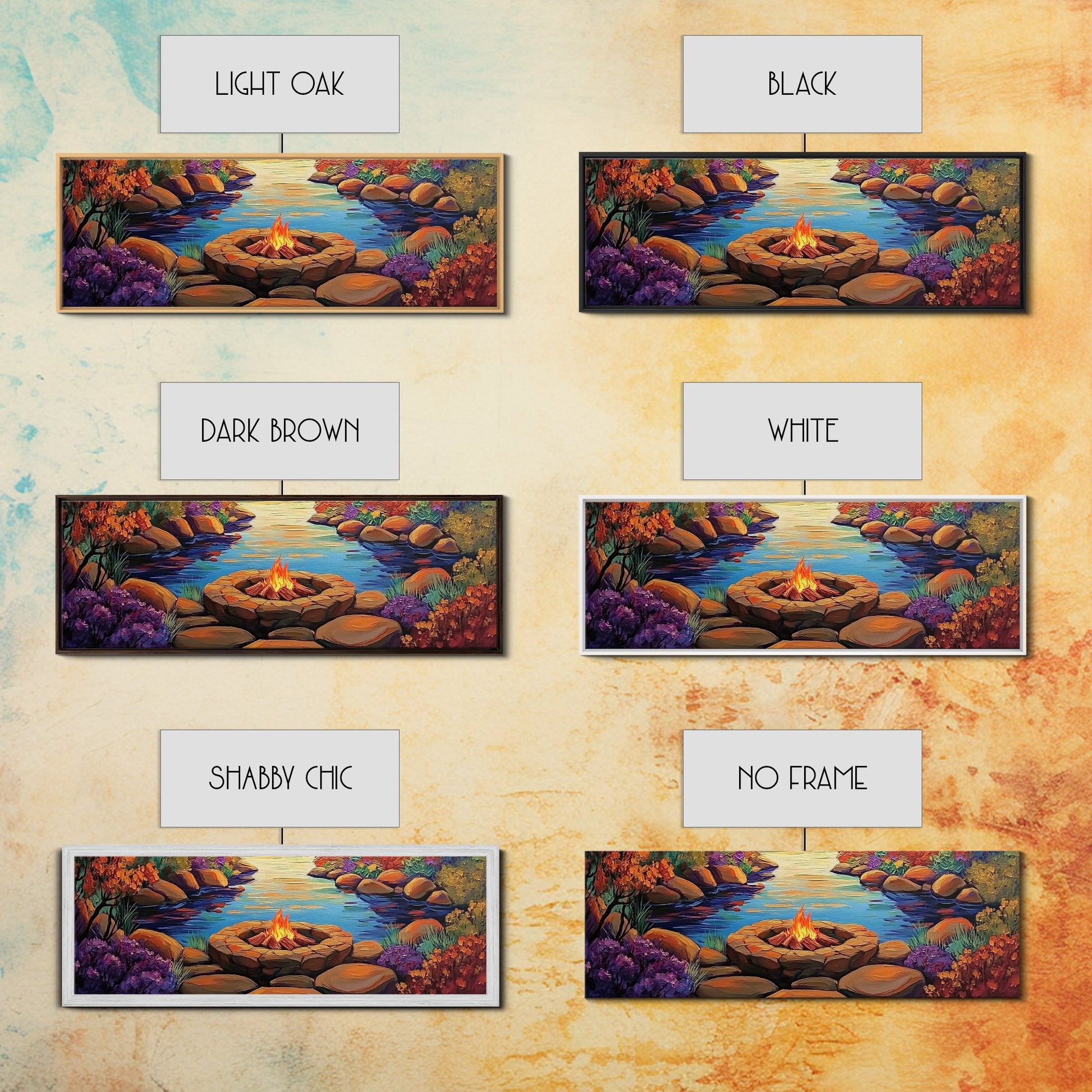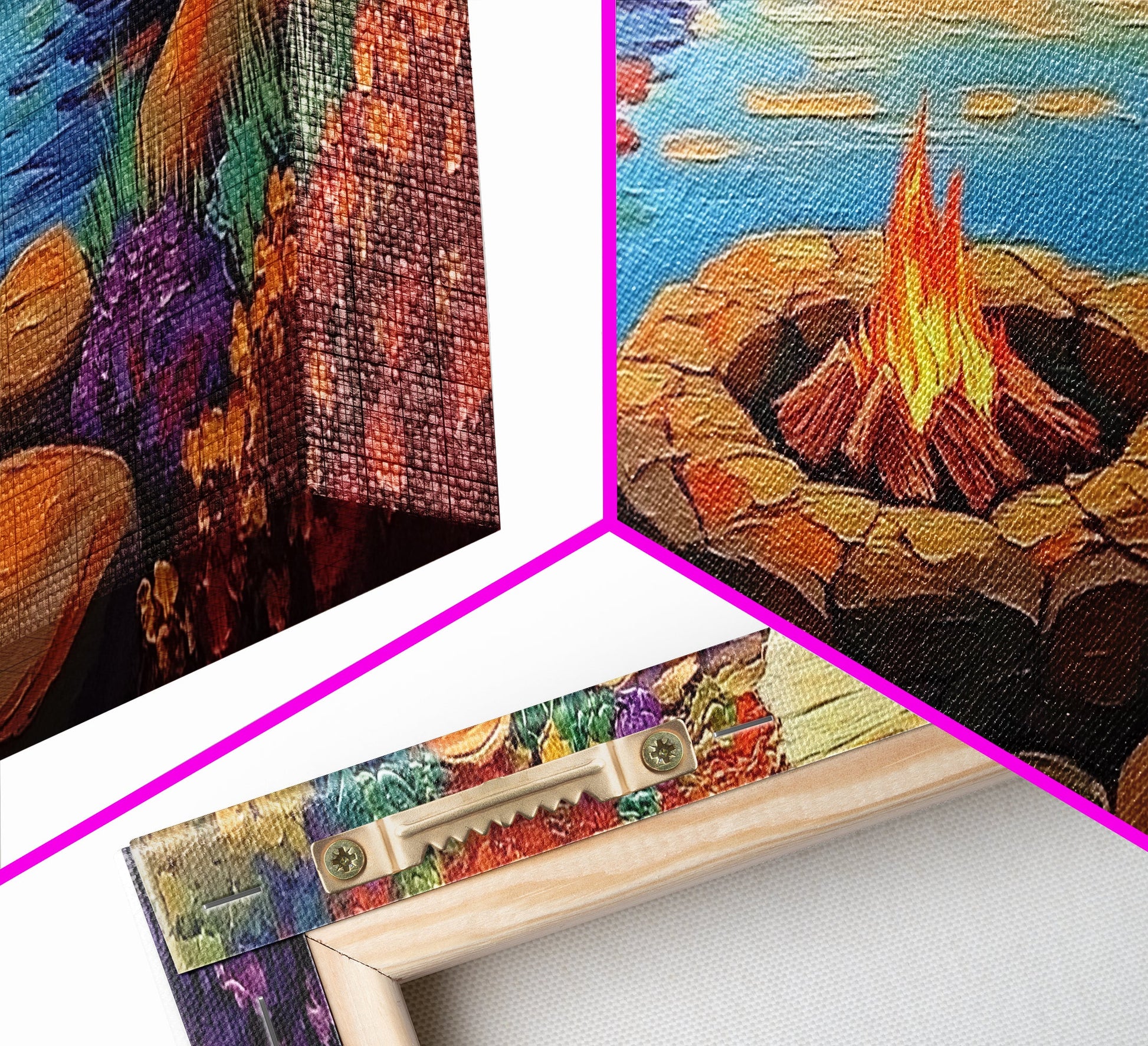 Campfire by River, Autumn Glow, Cozy Outdoor Scene, Framed Canvas Print, fall landscape, rustic decor, lodge wall art, den artwork