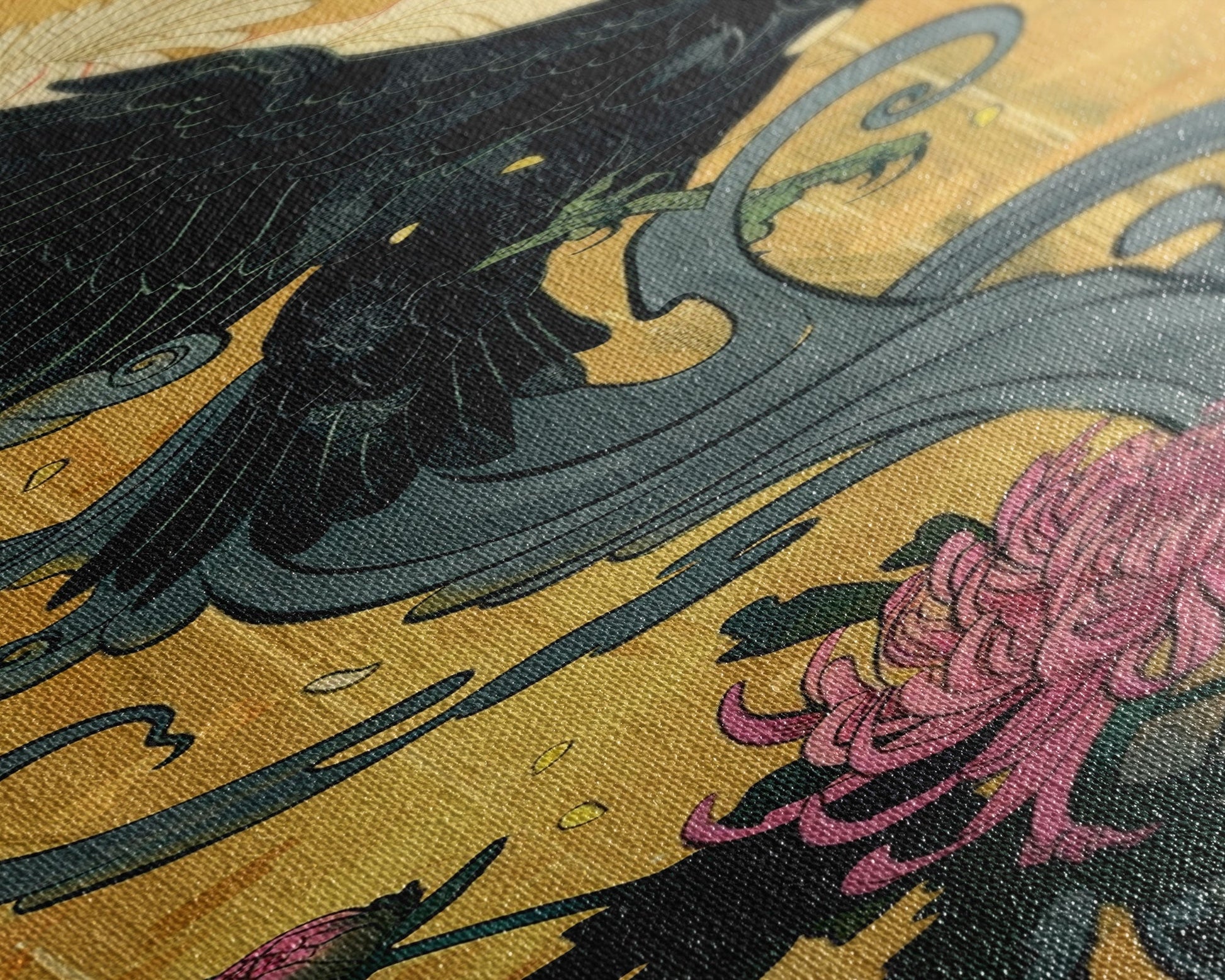 Canvas Print Japanese Eagle In Flight Over Chrysanthemum Flowers, Bold Traditional Art For Statement Wall Piece, Cultural Home Decor