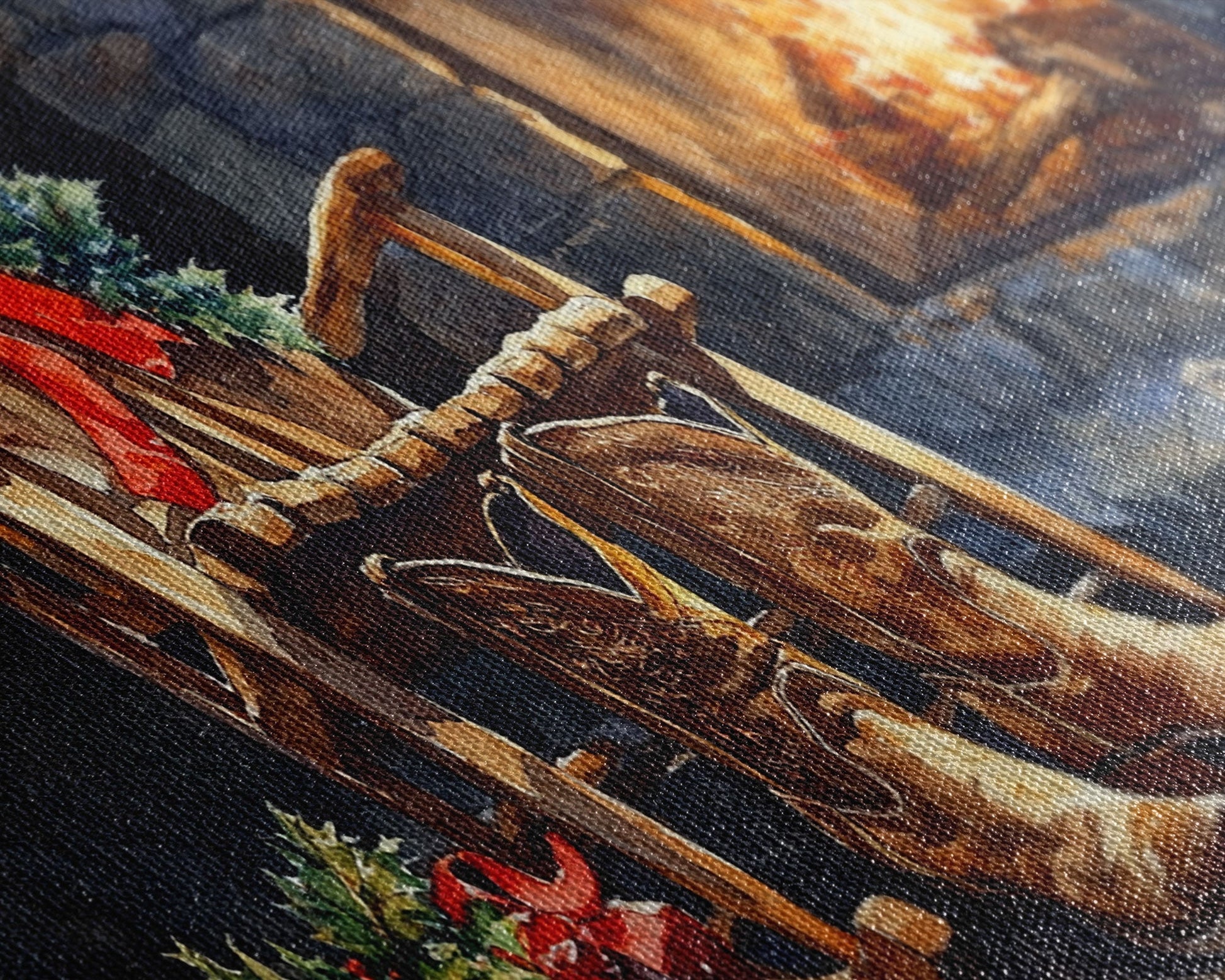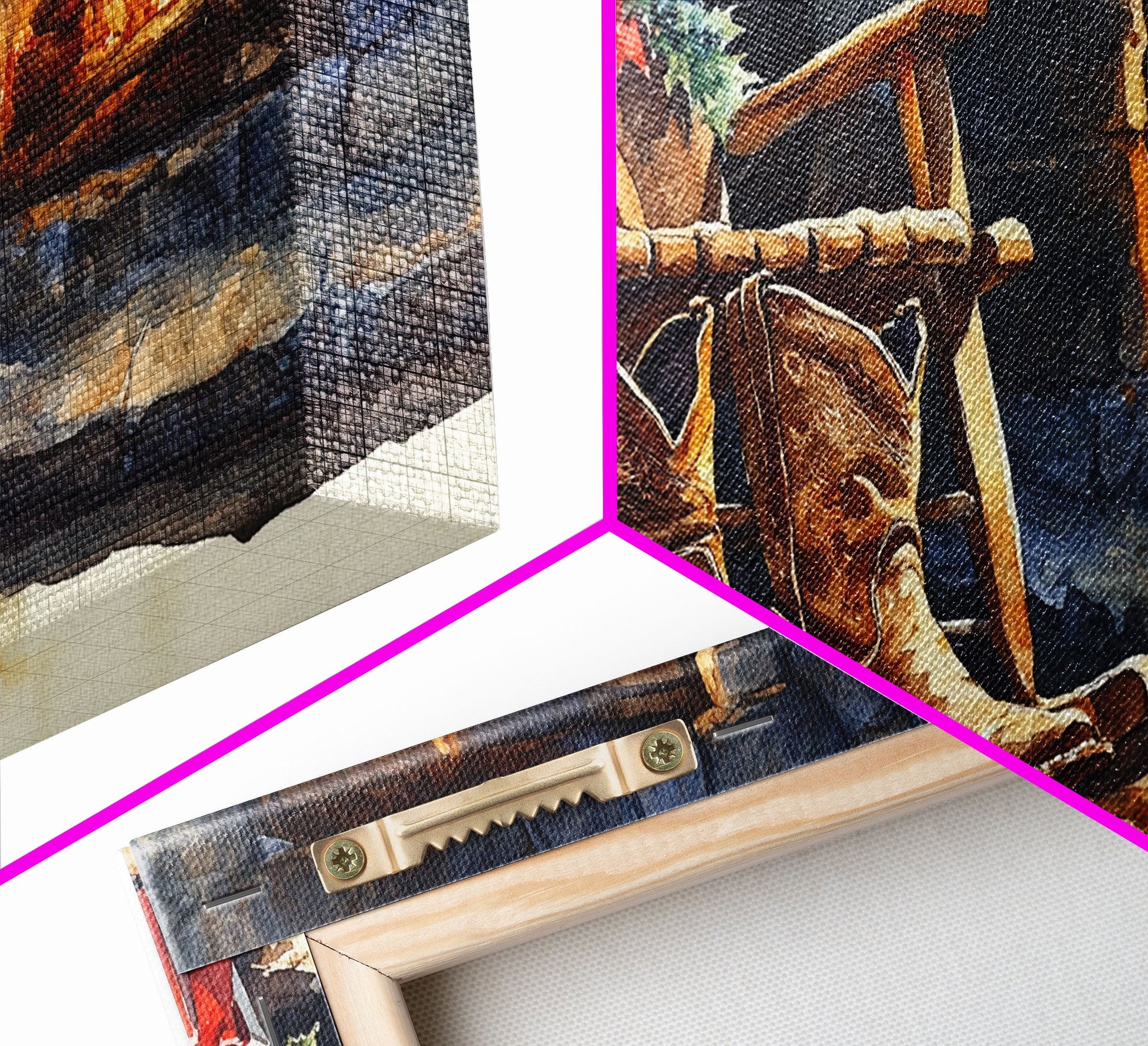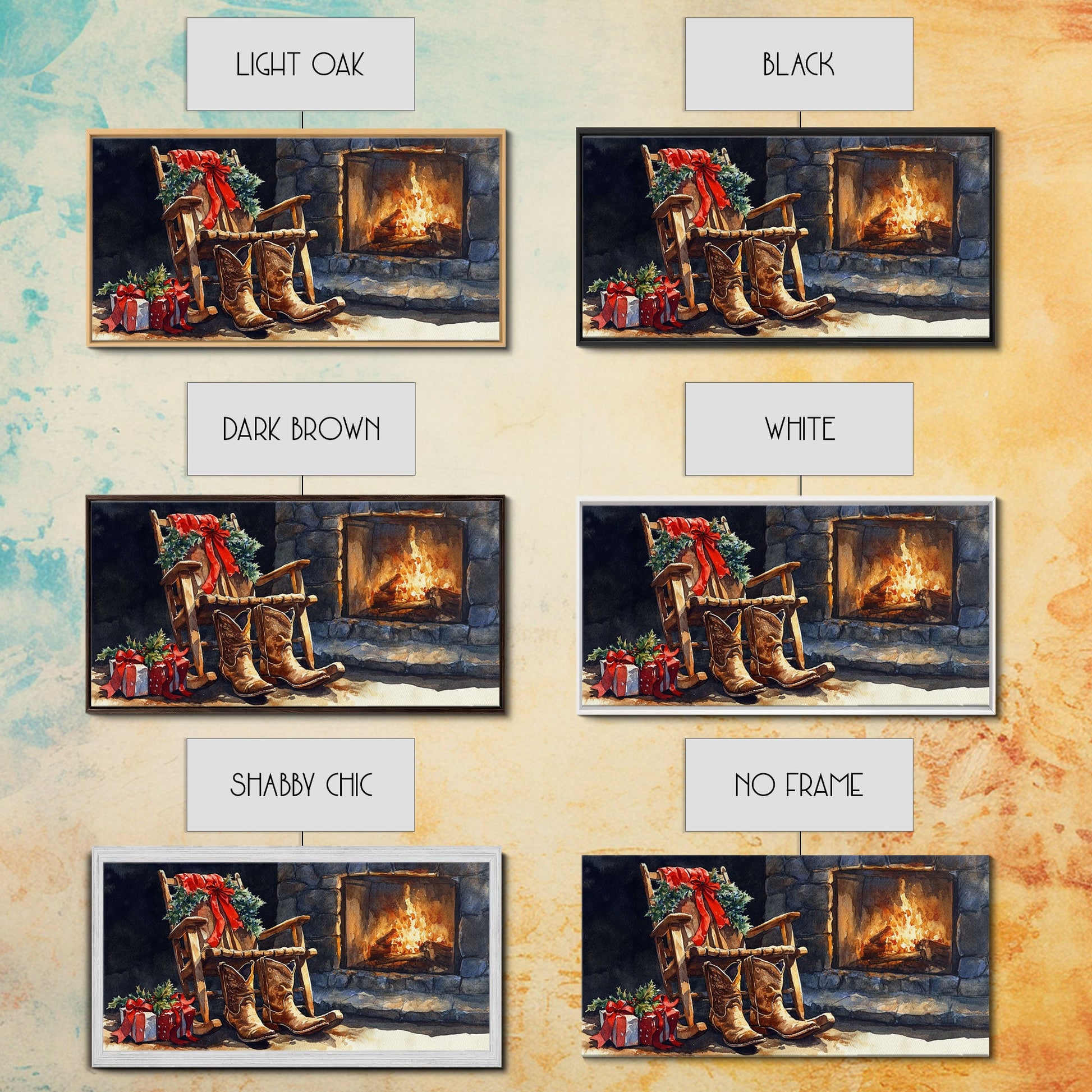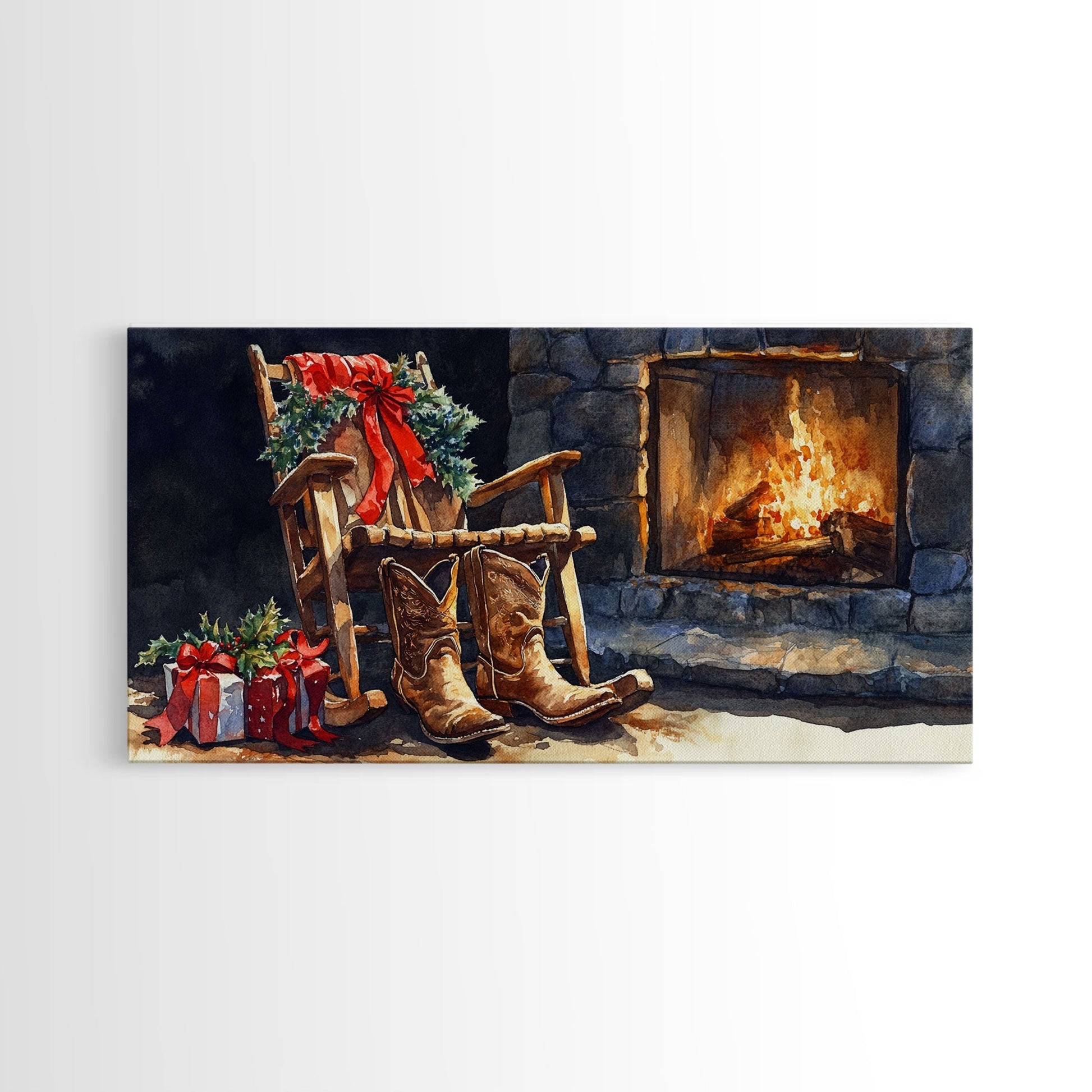 Canvas Print Rocking Chair and Cowboy Boots by Fireplace, Cozy Christmas Decor, Western Holiday Wall Art, Rustic Christmas Scene