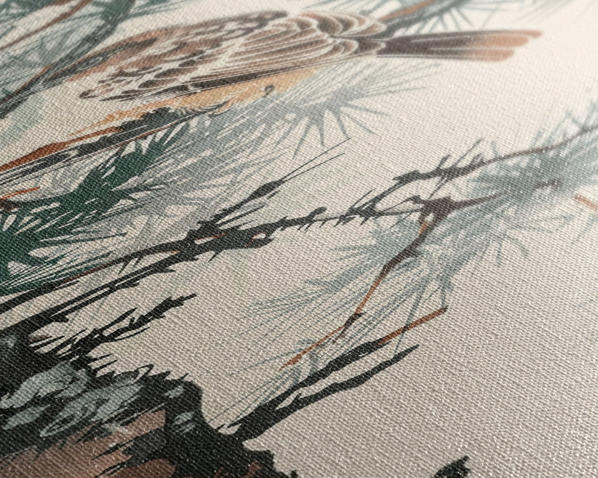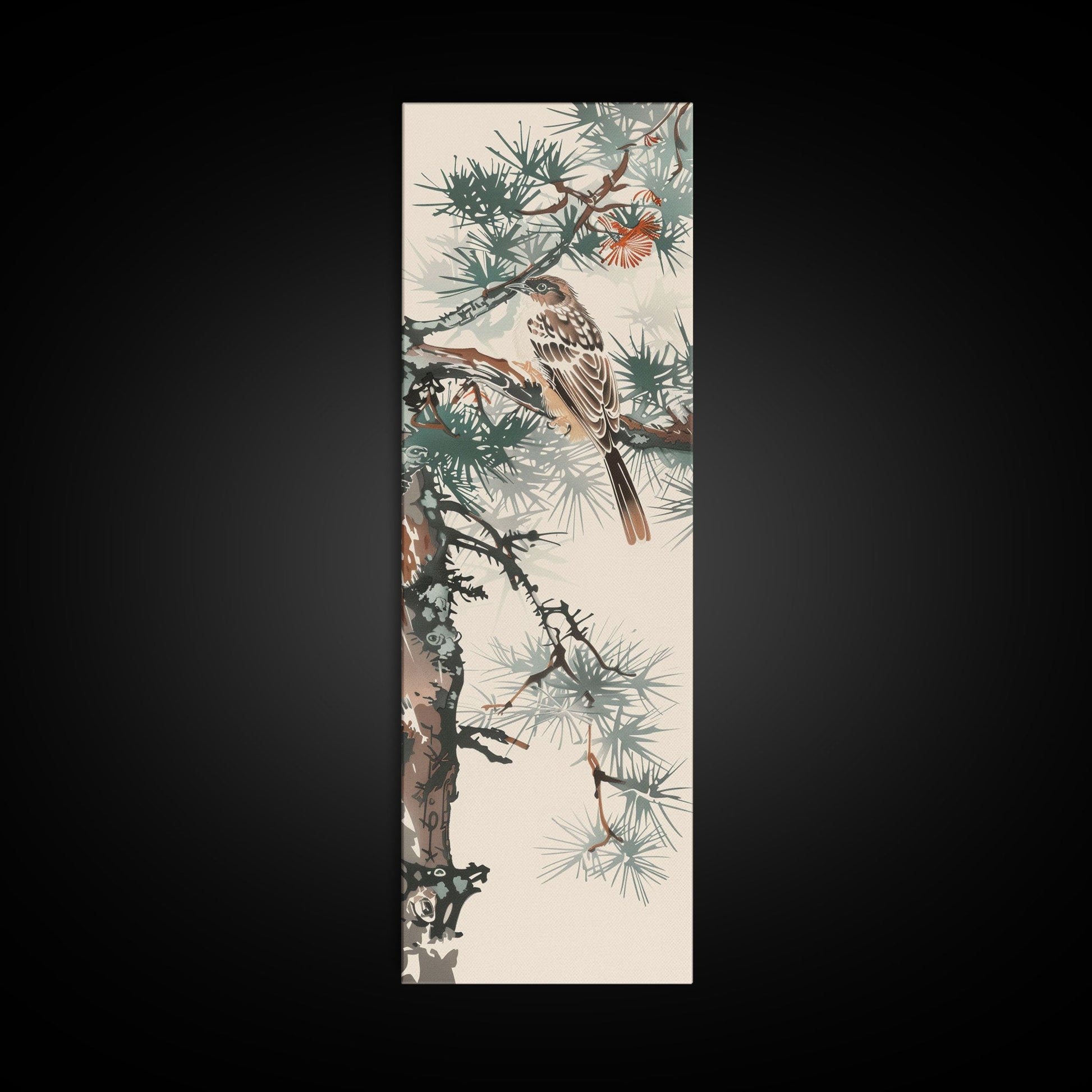 Canvas Print Sparrow Perched On Pine Tree Branch, Subtle And Serene Japanese Nature Scene For Tranquil Home Decor, Wall Decoration