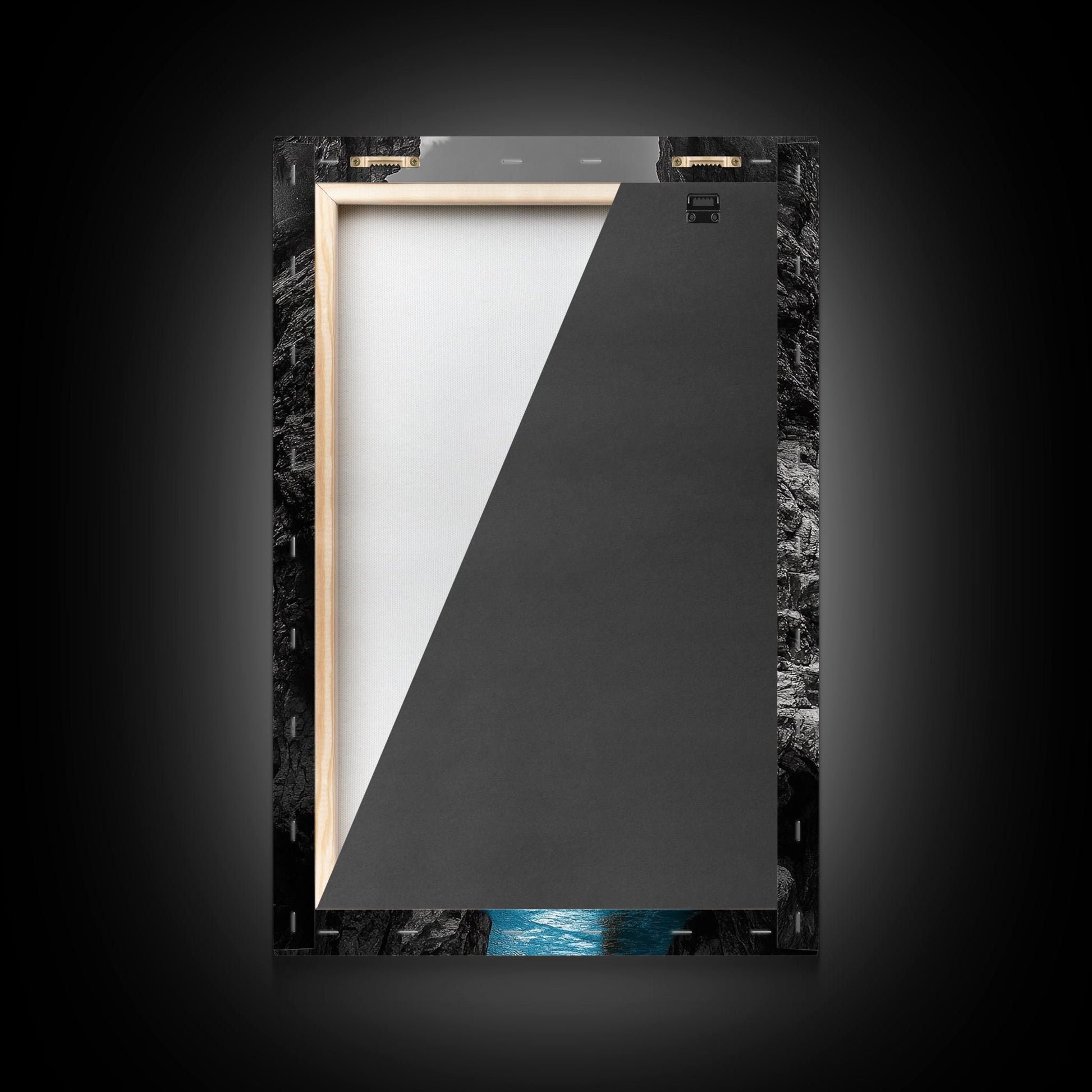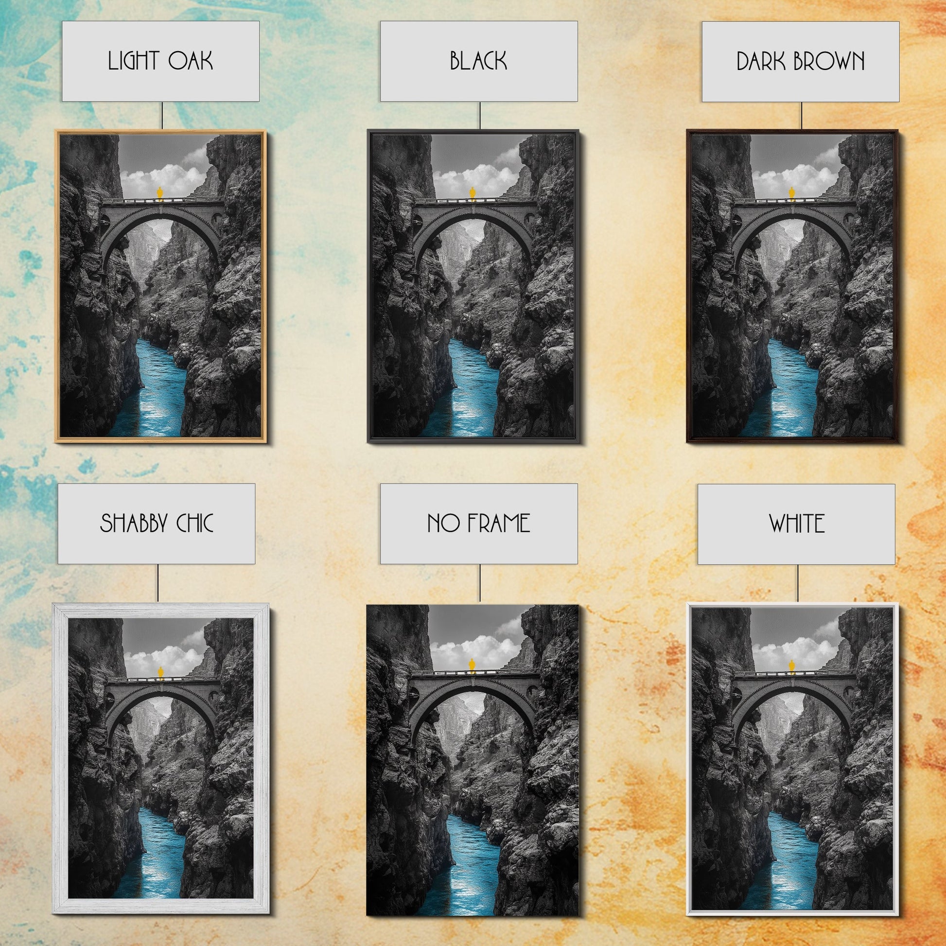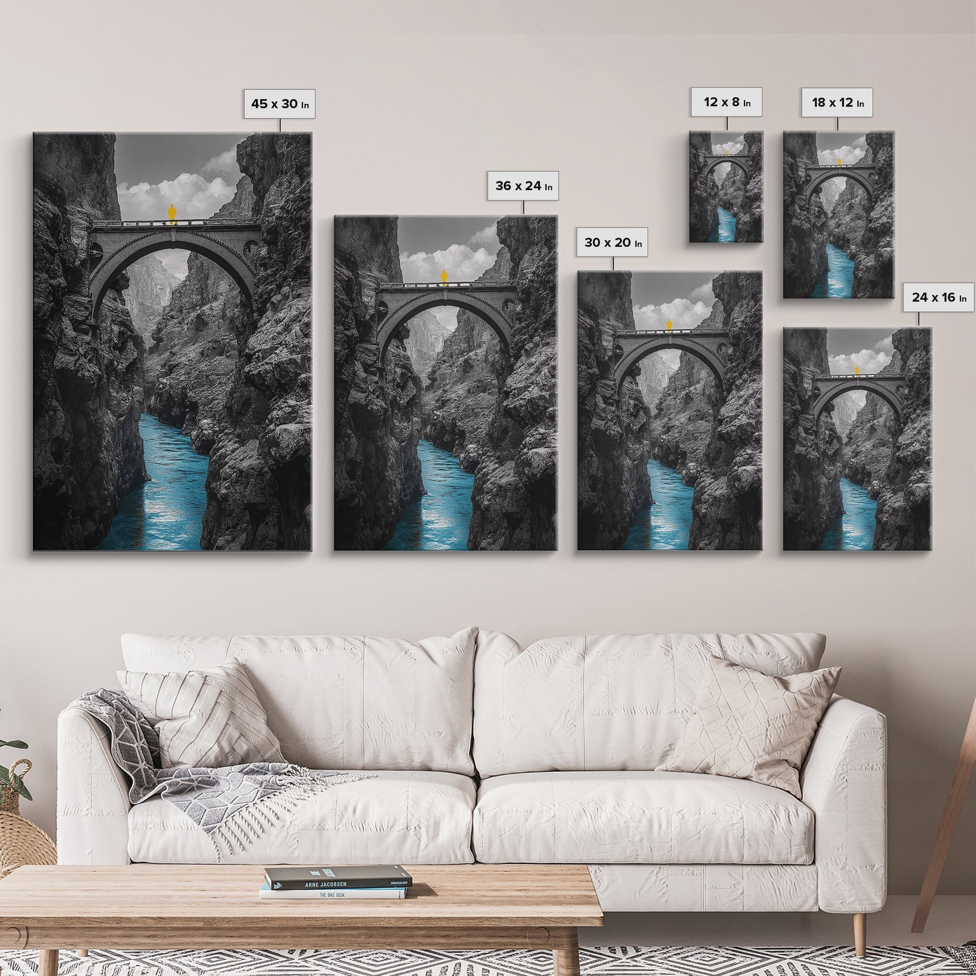 Canyon Bridge, Blue River, Yellow Figure, Framed Canvas Print, Bold Color Photography, Dramatic Landscape, Office Statement Art