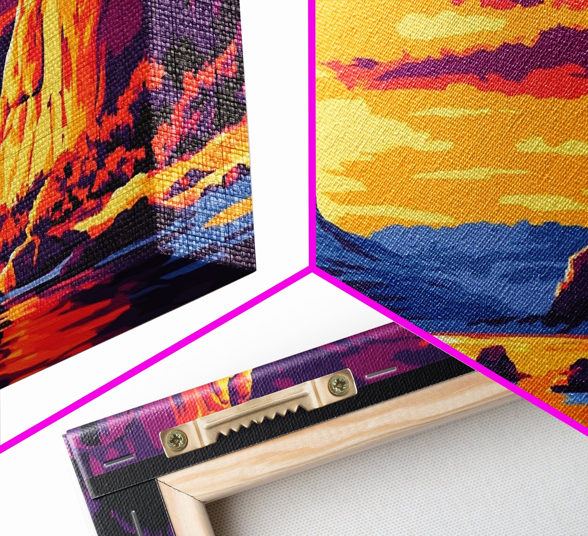 Hello and thank you for taking the time to view our modern high quality giclée artwork! We offer both posters and stretched canvas prints. Our posters are printed on Ultra Matte 60 lb / 230 GSM high quality photo paper, with a thickness of 10 mil. Our canvases are printed on museum grade 350 GSM canvas material with ECO friendly archival grade ink, then hand stretched and stapled over premium, FSC certified and shrink resistant frames. Designed and built to last a lifetime.