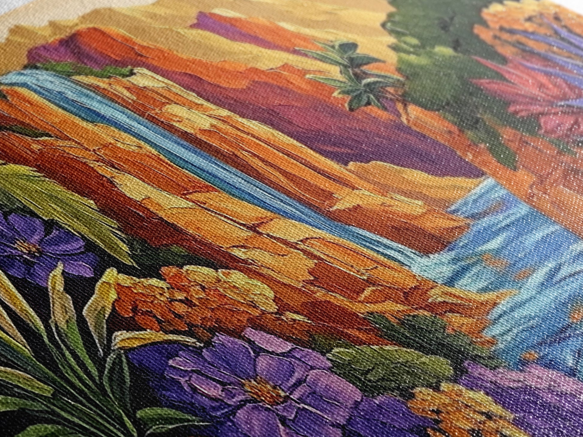 Canyon Waterfall, Desert Bloom, Sunset Rocks, Framed Canvas Print, Nature Landscape Wall Art, Boho Bedroom or Office Decor