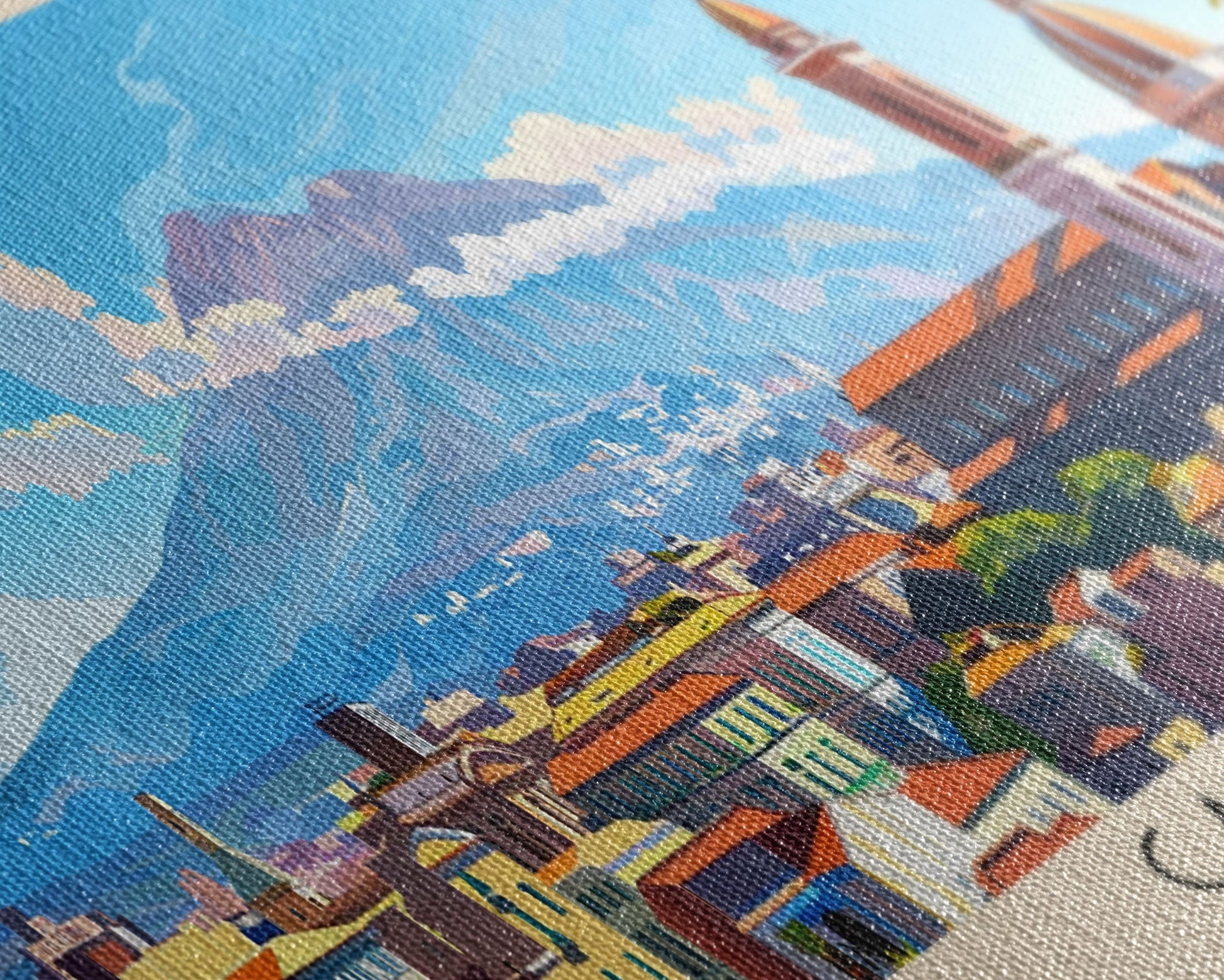Most of our canvases are made in the USA, with the exception of canvases ordered with the light oak unstained frames, and any large canvases (24x48, 30x60, 16x48 and 20x60) ordered WITH a frame. These are temporarily made in and shipped from Europe, while we try to find a more consistent supplier in the USA.