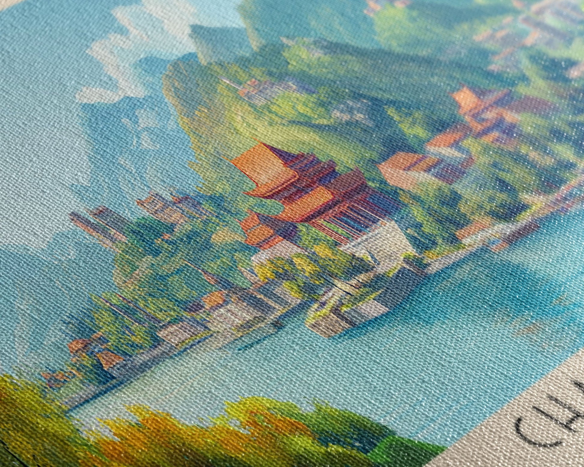 Most of our canvases are made in the USA, with the exception of canvases ordered with the light oak unstained frames, and any large canvases (24x48, 30x60, 16x48 and 20x60) ordered WITH a frame. These are temporarily made in and shipped from Europe, while we try to find a more consistent supplier in the USA.
