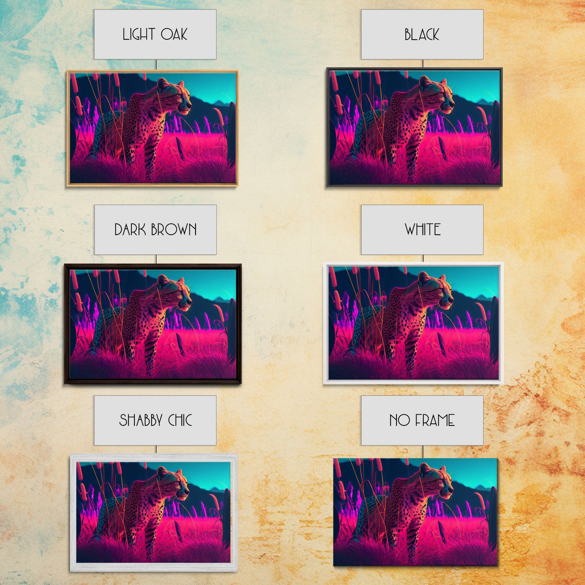 Cheetah on the hunt, vaporwave art, sunset hunter, framed canvas print, framed wall art