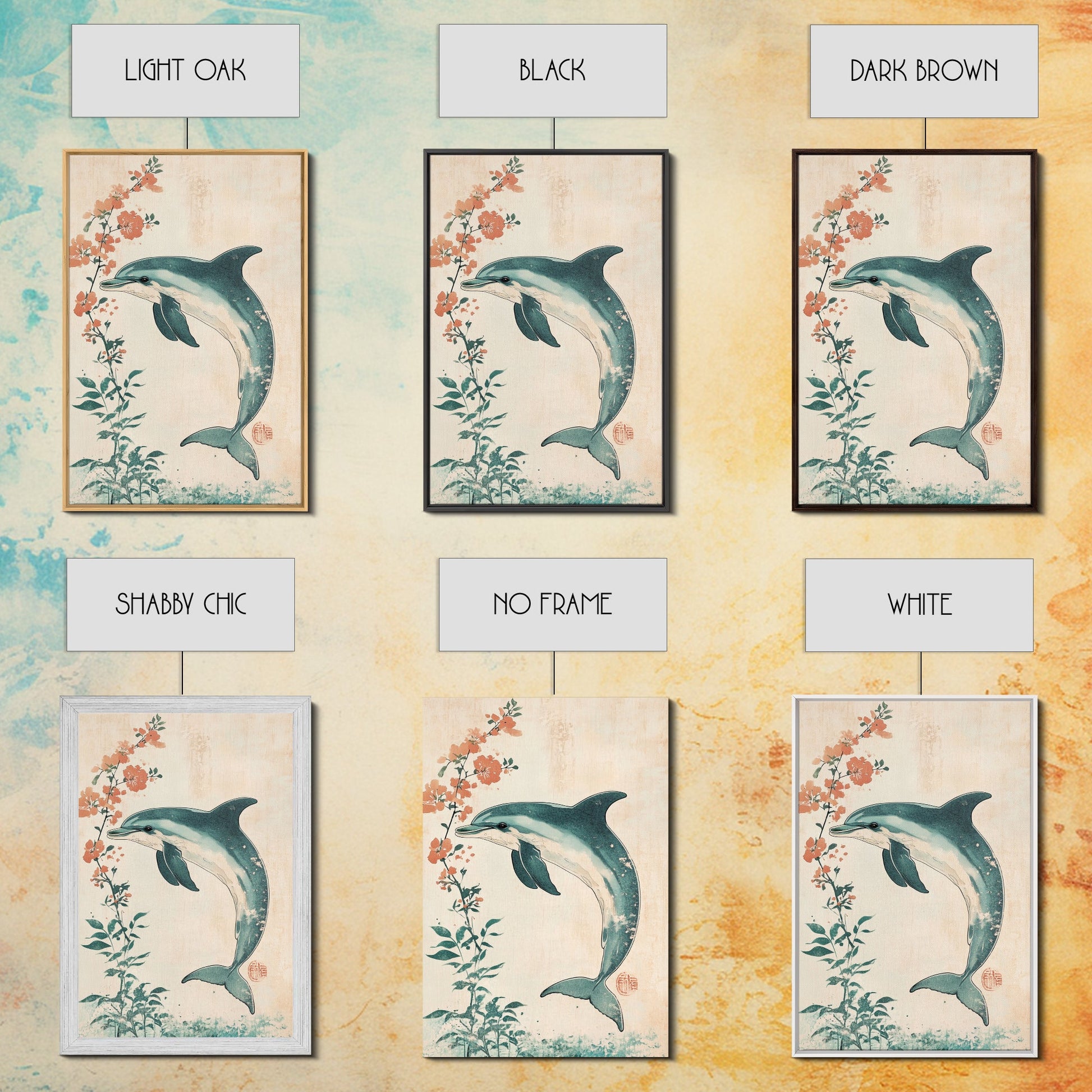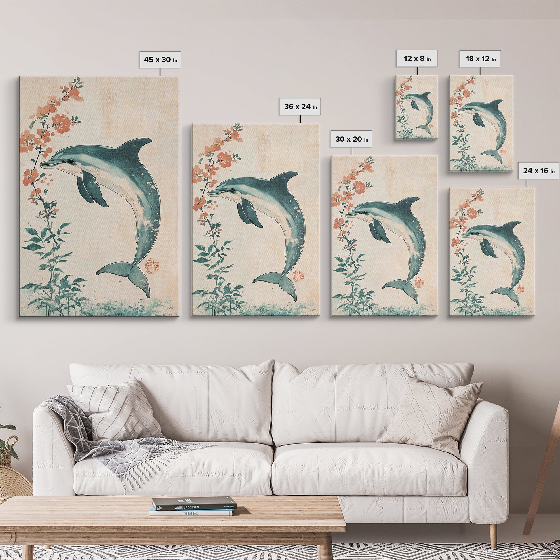 Cherry Blossoms and Dolphins, Framed Canvas Print, Home Decor, Wabi Sabi Dolphin Painting, Minimalist Decor, Living Room Art, Bedroom Art