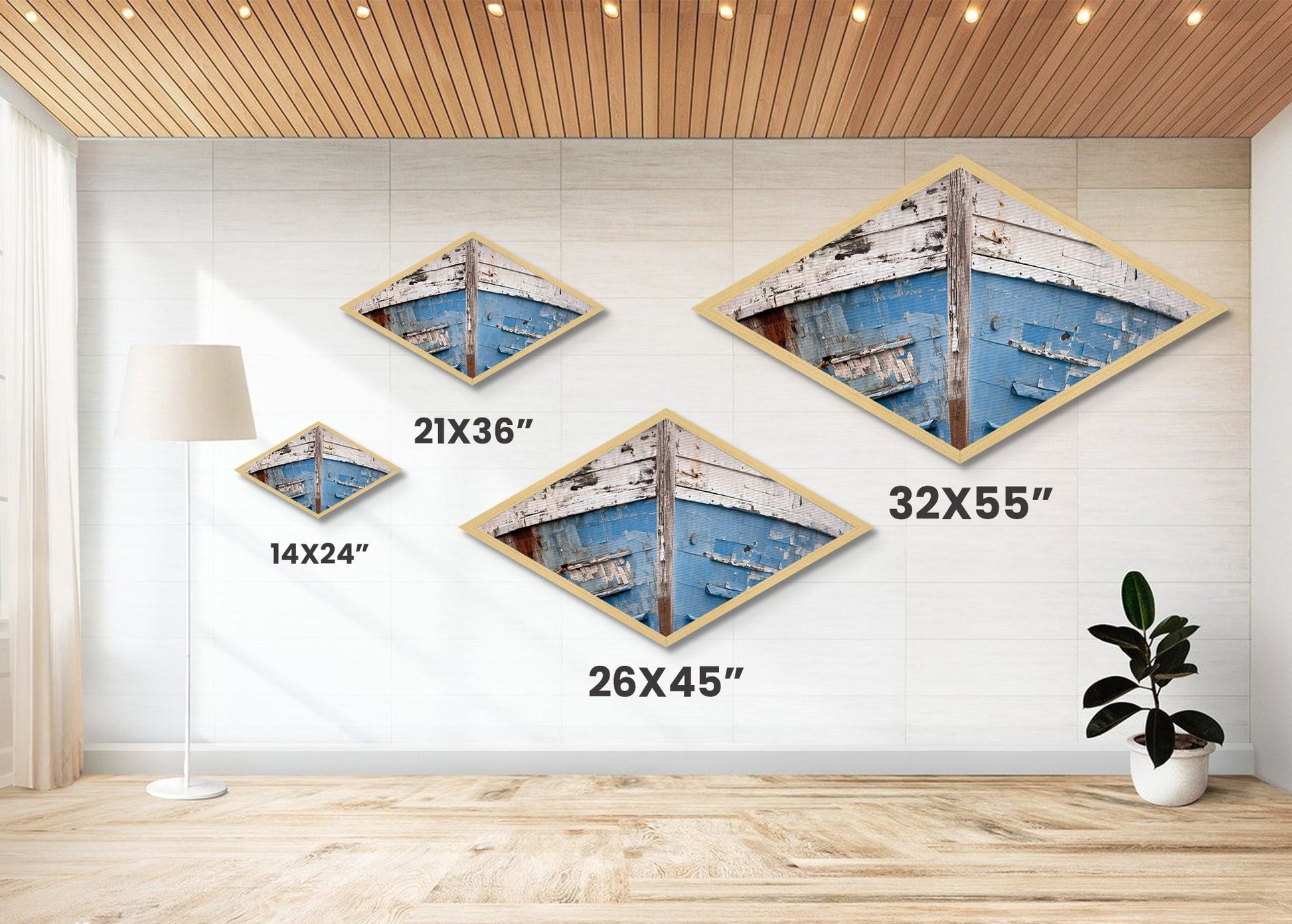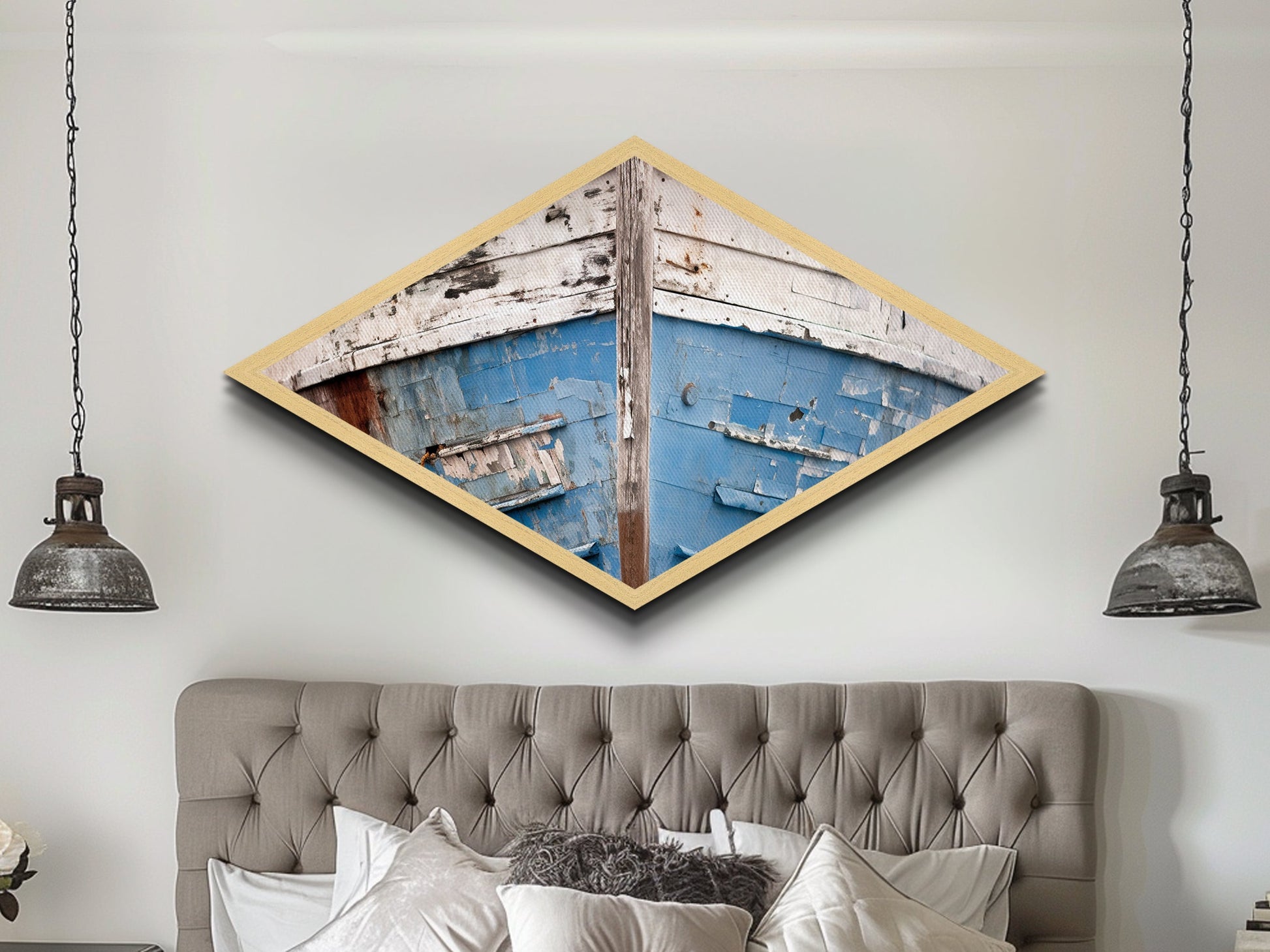 Chipped Boat Nostalgia Diamond Shaped Canvas Embossed Print rustic nautical decor blue white boat hull worn texture seaside wall piece