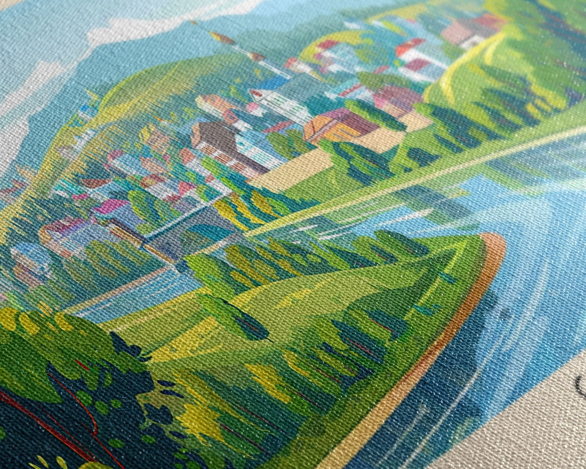 Most of our canvases are made in the USA, with the exception of canvases ordered with the light oak unstained frames, and any large canvases (24x48, 30x60, 16x48 and 20x60) ordered WITH a frame. These are temporarily made in and shipped from Europe, while we try to find a more consistent supplier in the USA.