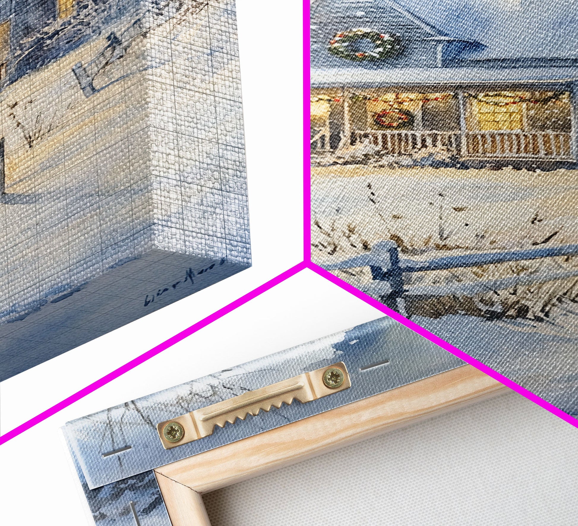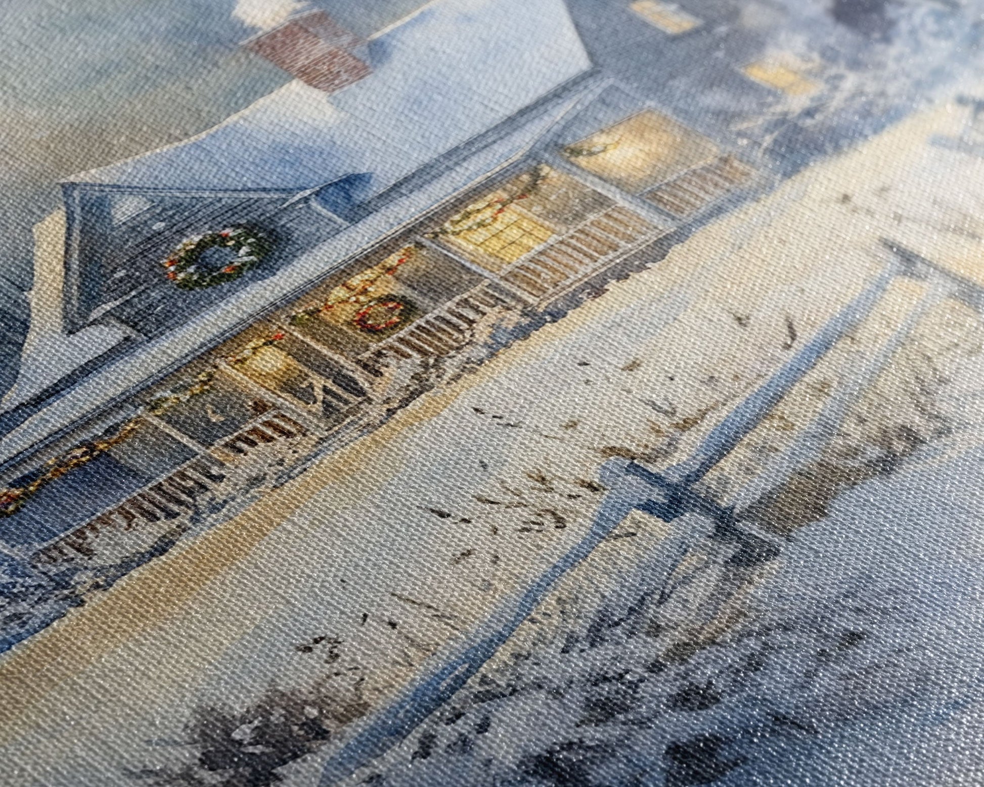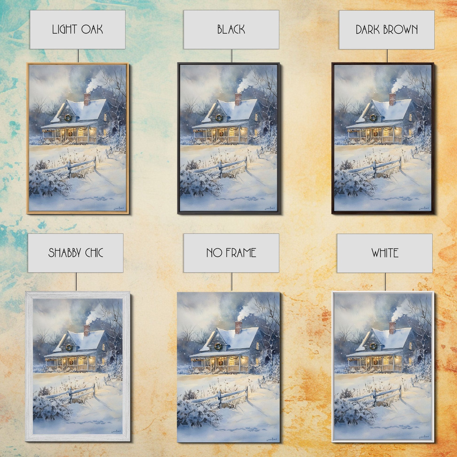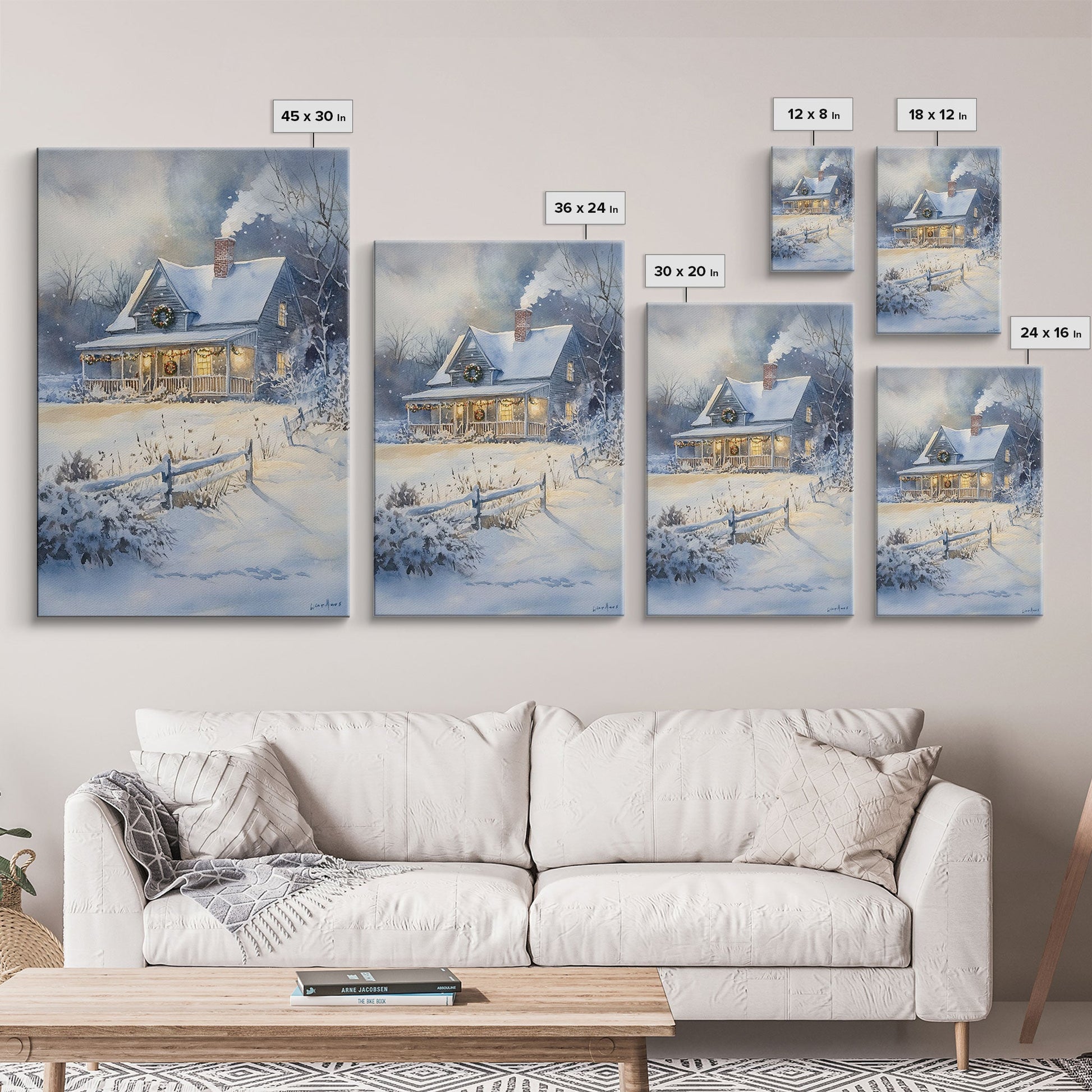 Christmas Cottage Wall Art, Framed Canvas Print, Winter Wonderland Landscape Print