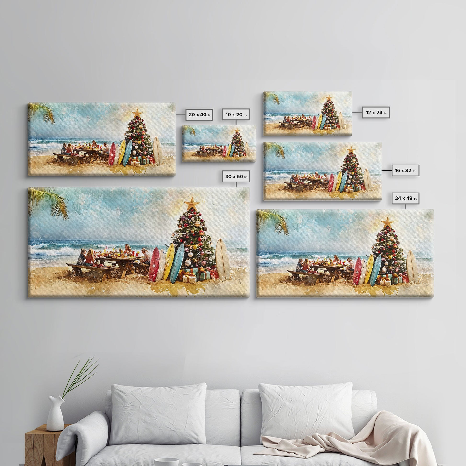 Christmas family picnic by the beach with surfboards and tree, framed canvas print tropical coastal holiday beach Christmas decor