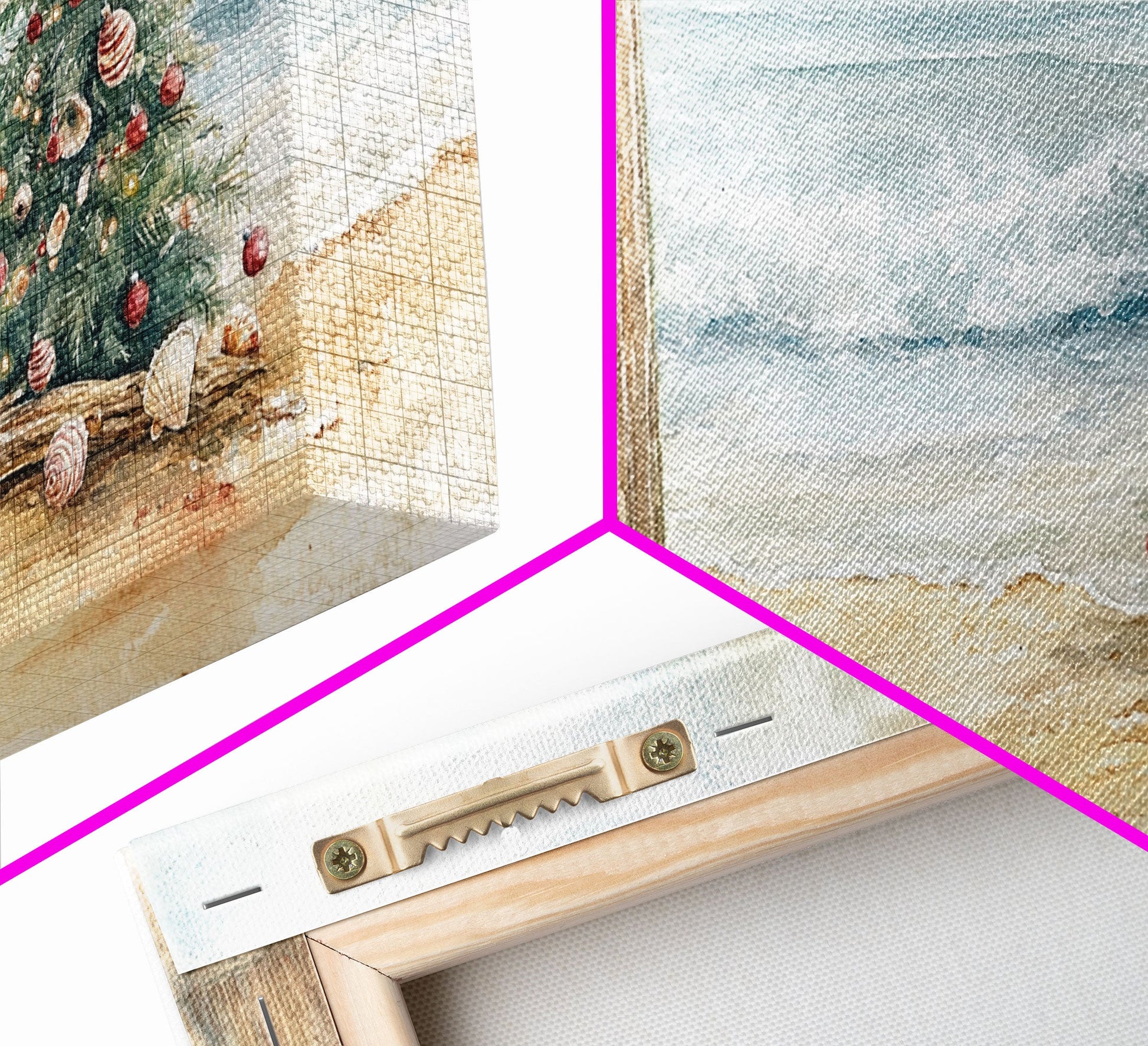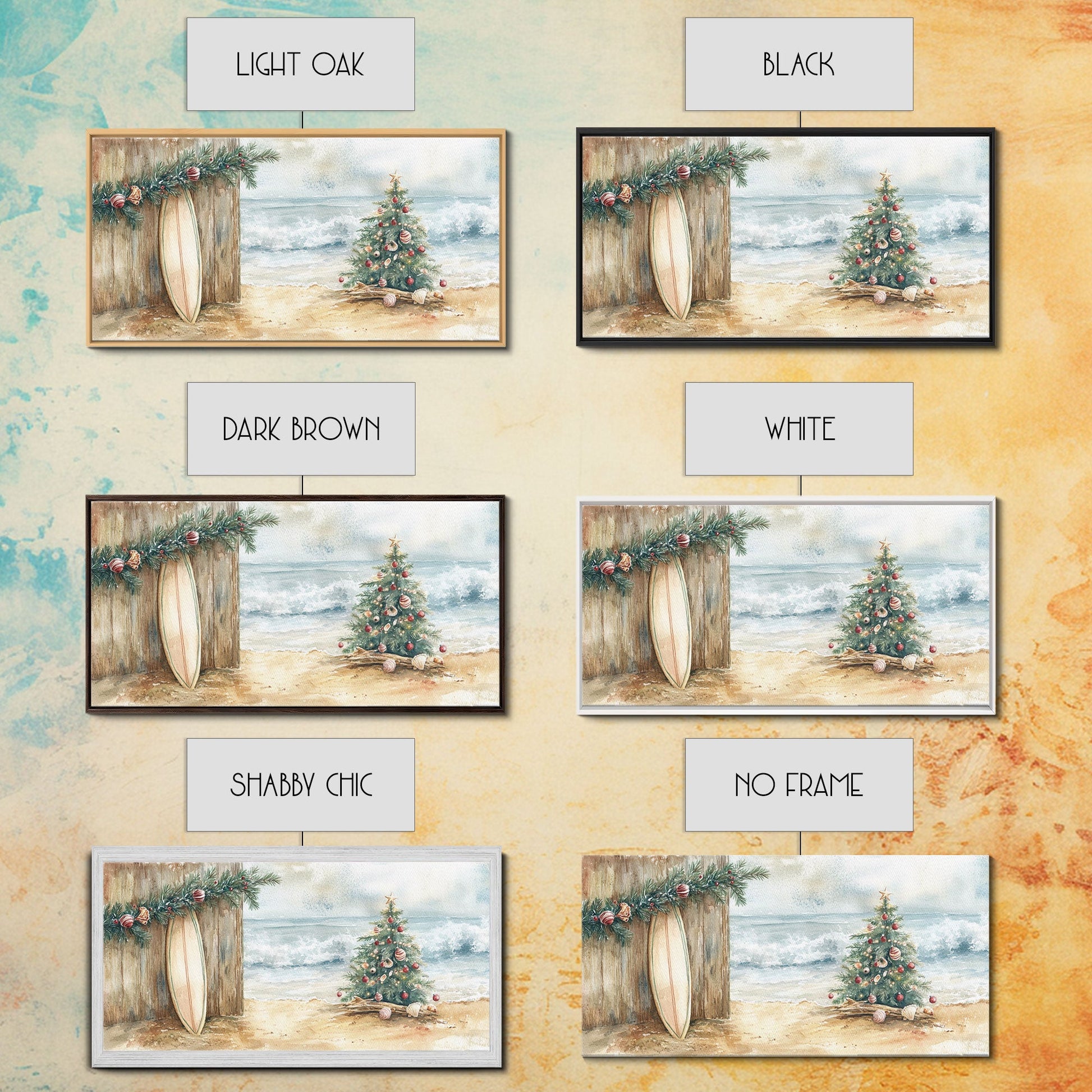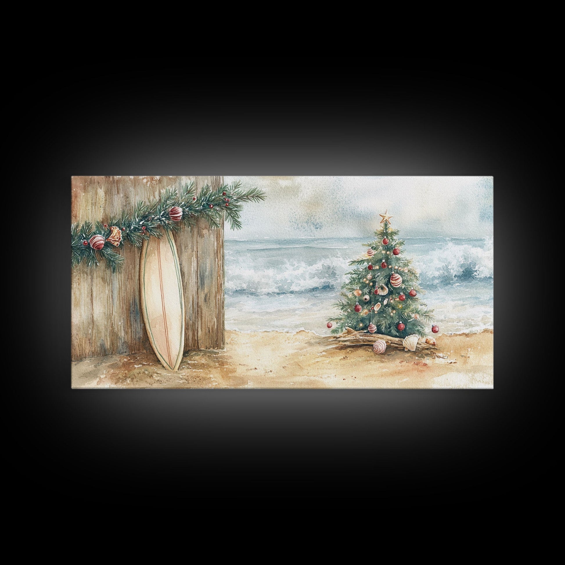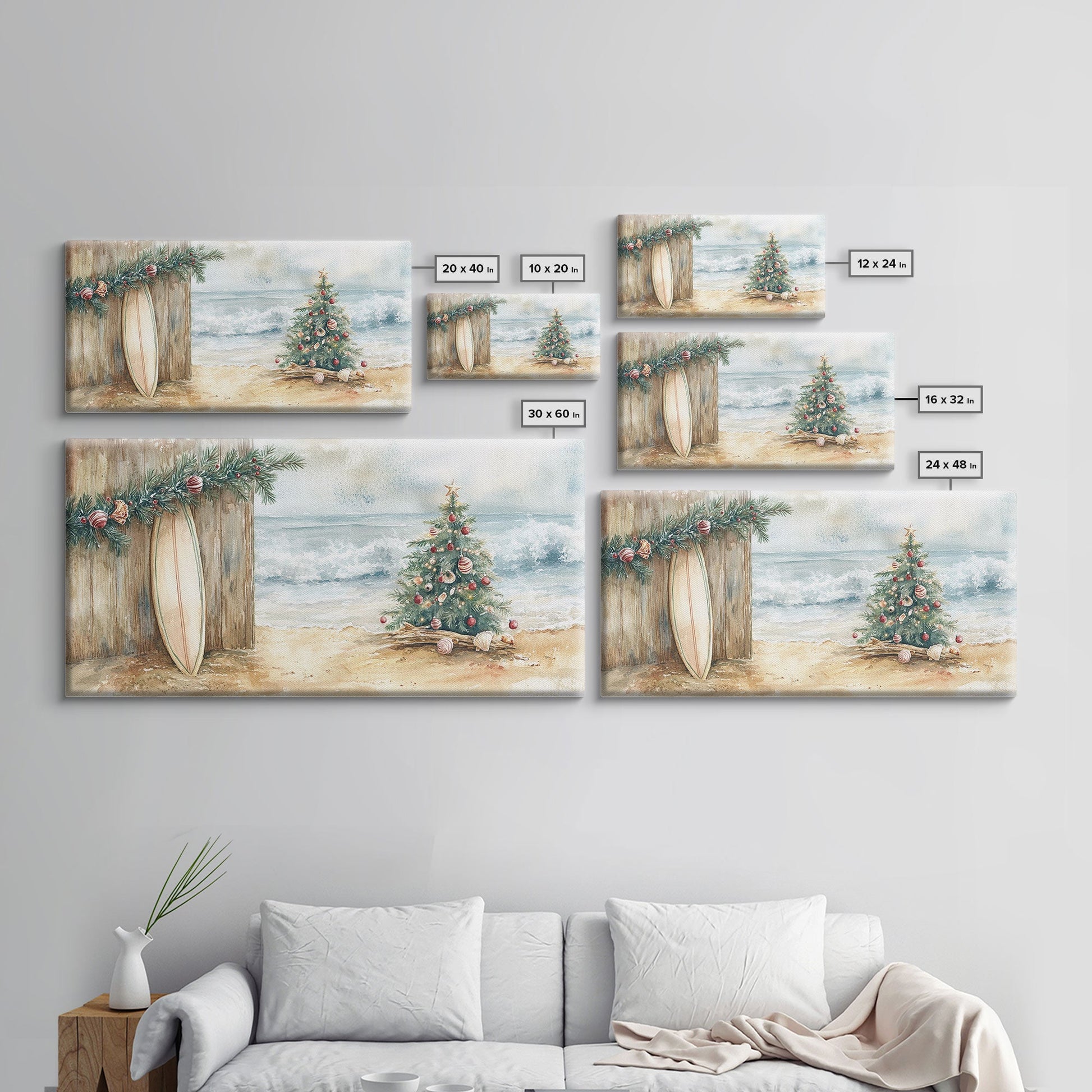 Christmas Tree On Sandy Beach With Surfboard Coastal Decor Framed Canvas Print, Beach Christmas Decor Wall Art