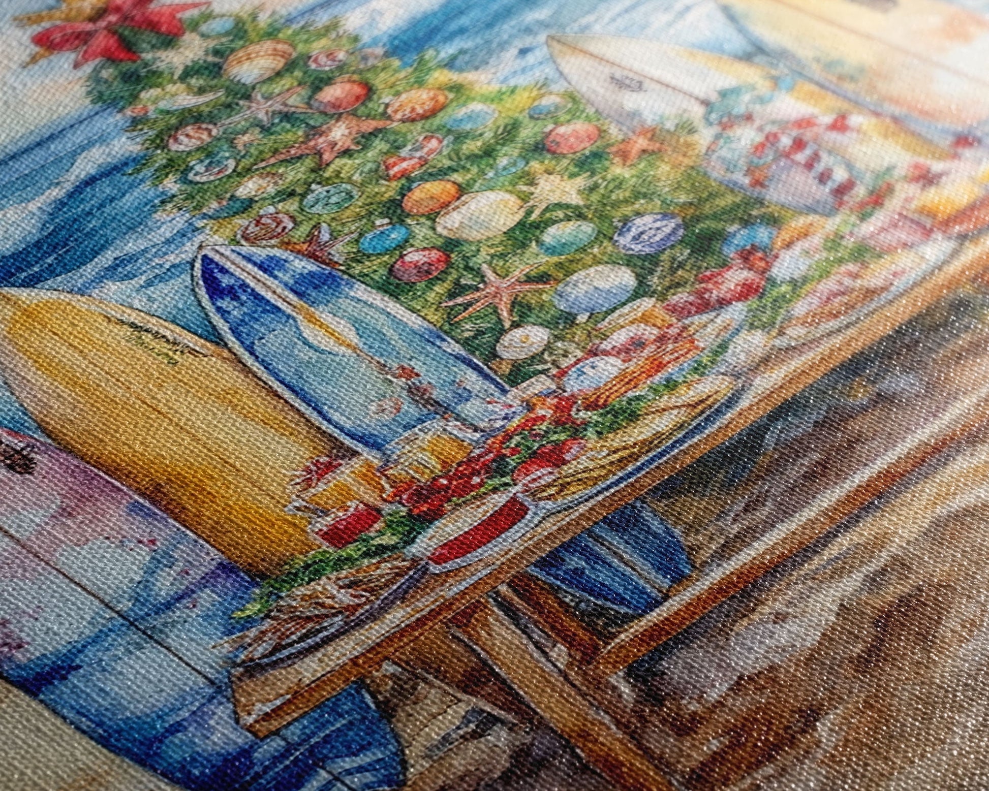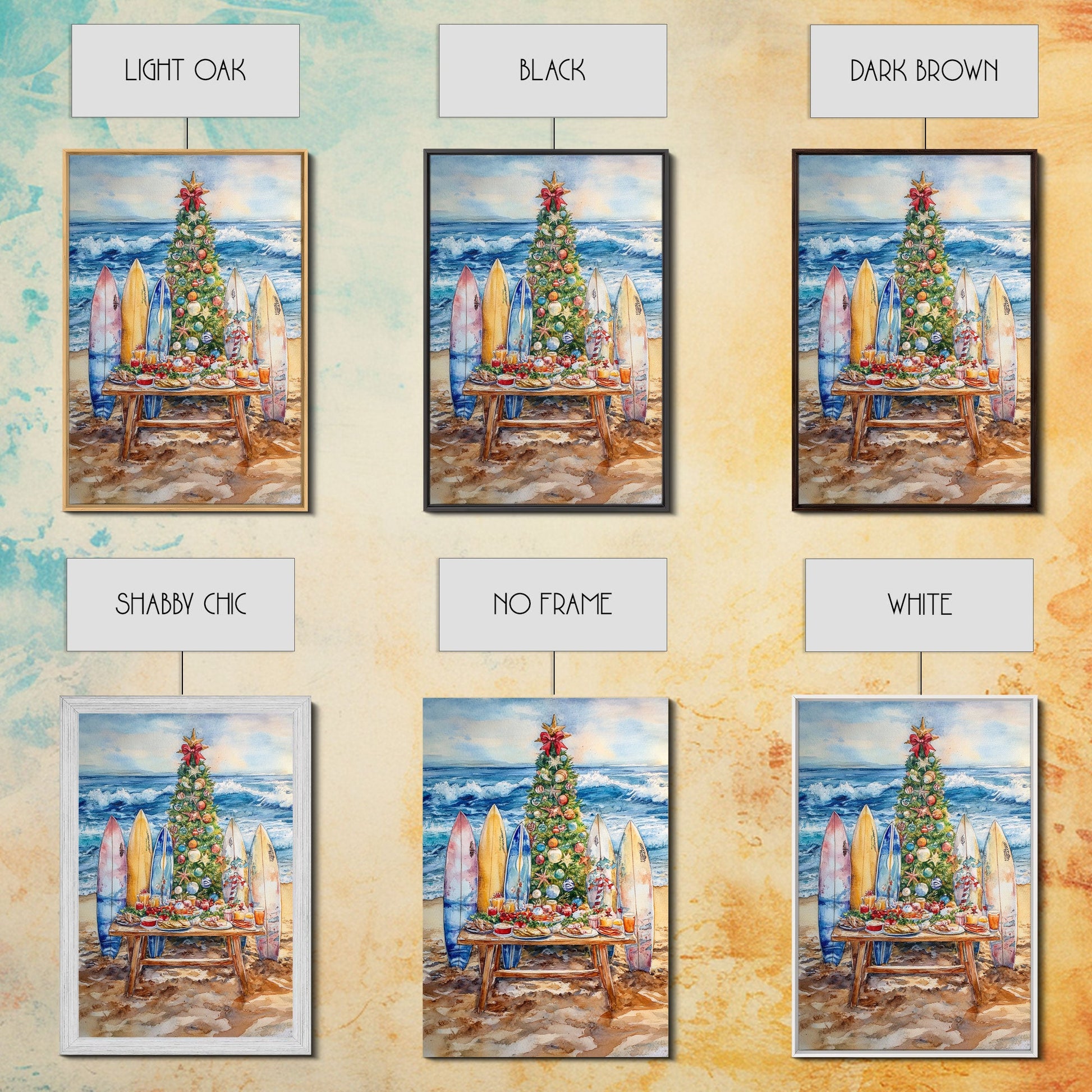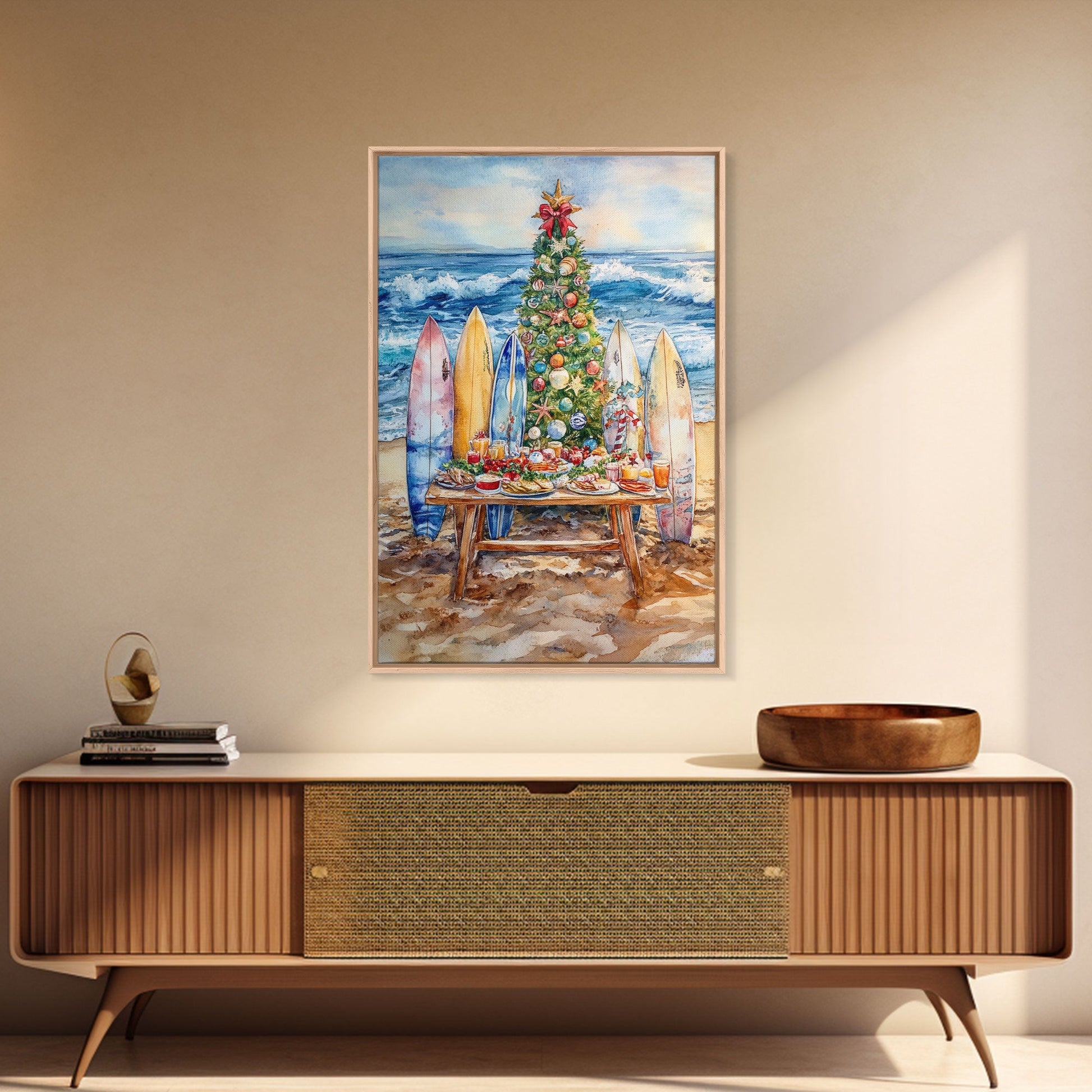 Christmas tree with surfboards on the beach, Framed Canvas Print tropical holiday wall art perfect beach Christmas decor holiday gift idea